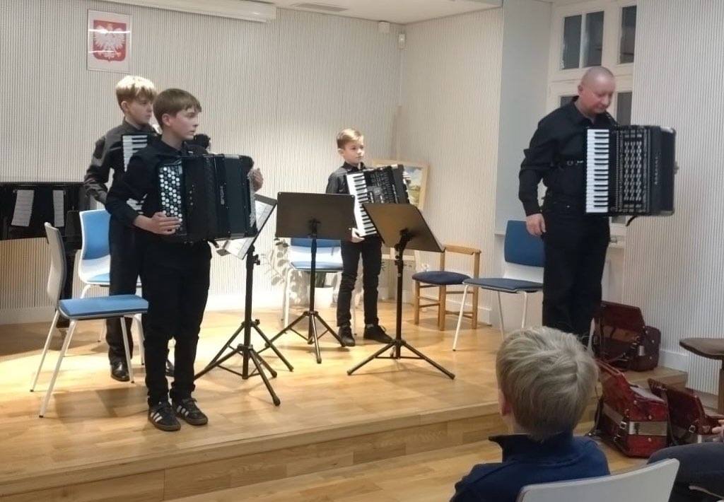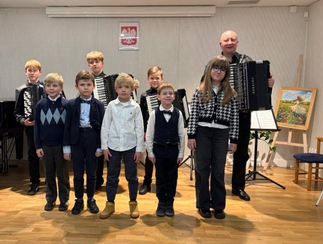 W czwartek 15 stycznia odbył się popis klasy akordeonu p. Tomasza Milera podsumowujący efekty pracy w pierwszym półroczu. Dla kilku uczniów i nowego składu zespołowego był to pierwszy publiczny występ. Młodzi wykonawcy zaprezentowali zaproszonym gościom kolędy, utwory dowolne i muzykę kameralną. Wystąpili uczniowie: Aleksander Chorążyczewski, Aniela Torchała, Leon Poznański, Matvii Hrabchuk, Maksymilian Ford, Jan Dziechciarek, Erwin Piter i Nikodem Ford oraz w zespole nauczyciel Tomasz Miler.