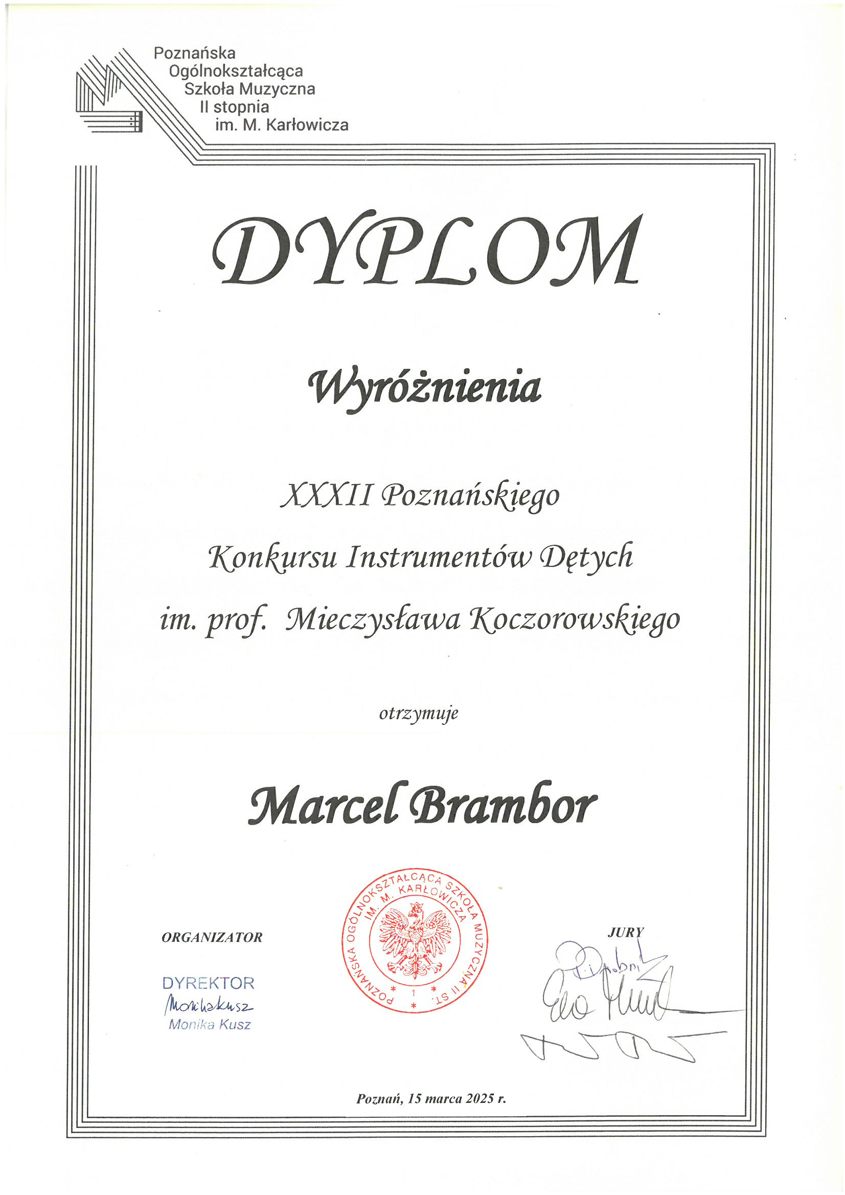 15 marca 2025 roku odbył się XXXII Poznański Konkurs Instrumentów Dętych im. Mieczysława Koczorowskiego w Poznańskiej Ogólnokształcącej Szkole Muzycznej II st. Naszą szkołę reprezentował na saksofonie Marcel Brambor z klasy Rafała Kubale zdobywając wyróżnienie! Na fortepianie akompaniował Pan Mateusz Wizjan. Gratulacje.