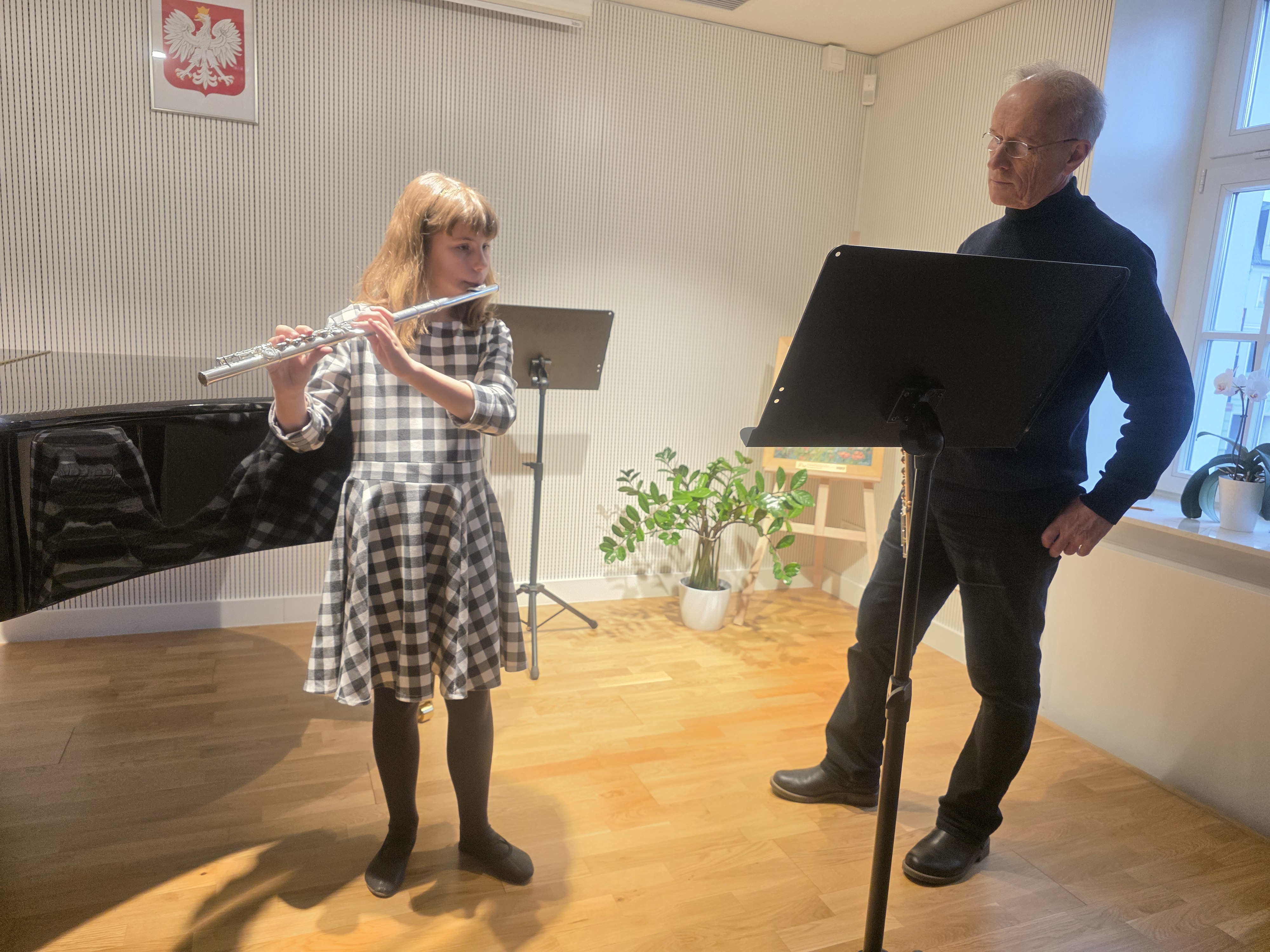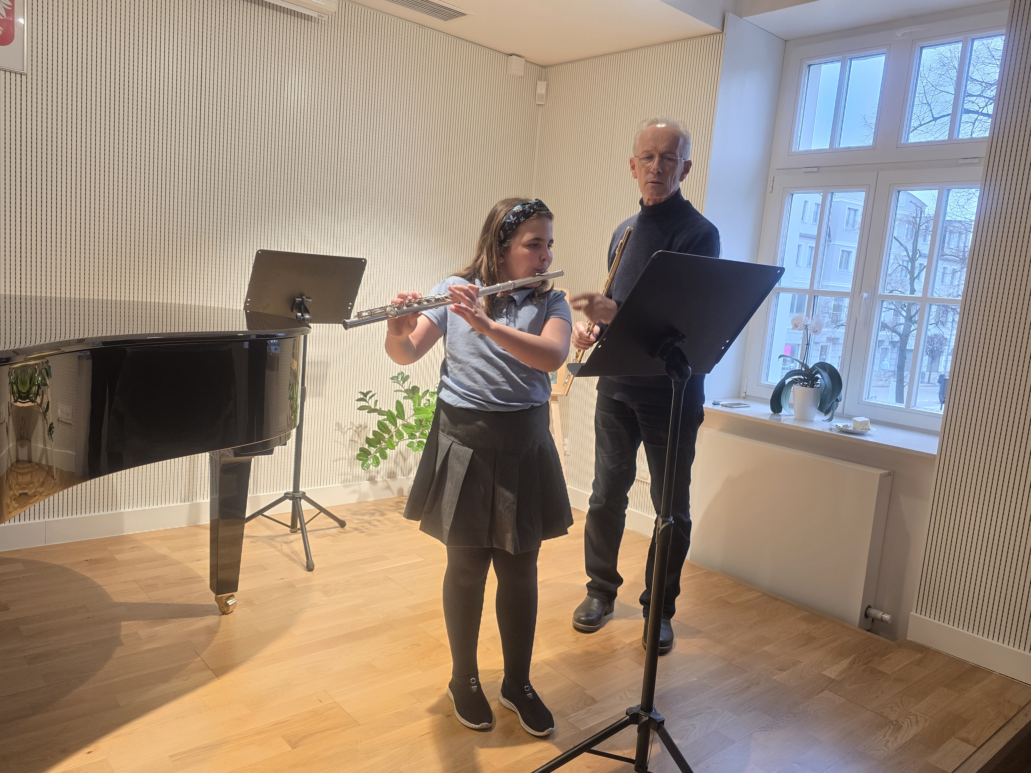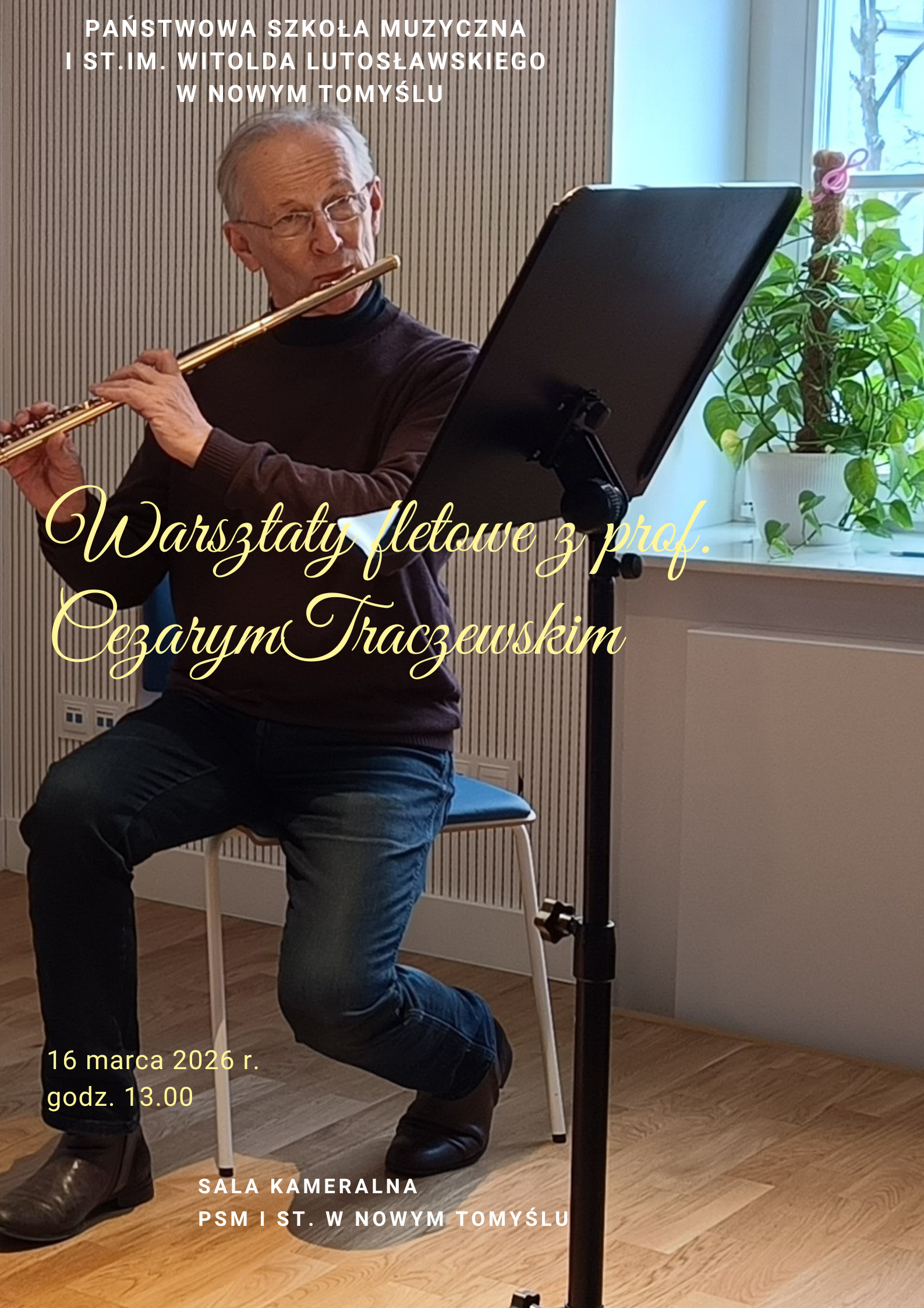 W poniedziałek, 16 marca 2026 r., gościliśmy w naszej szkole wybitnego flecistę i pedagoga - prof. Cezarego Traczewskiego. Pan Profesor jest Absolwentem Akademii Muzycznej we Wrocławiu. Swą sztukę doskonalił w klasie fletu prof. Petera-Lukasa Grafa w Szwajcarii oraz na wielu kursach mistrzowskich. Koncertował jako solista i kameralista, dokonał wielu nagrań radiowych oraz telewizyjnych. W latach 1981-1997 był solistą Opery Wrocławskiej. Obecnie prowadzi klasę fletu w Ogólnokształcącej Szkole Muzycznej I i II st. im. Karola Szymanowskiego we Wrocławiu oraz w Zespole Szkół Muzycznych im. Stanisława Moniuszki w Wałbrzychu.
