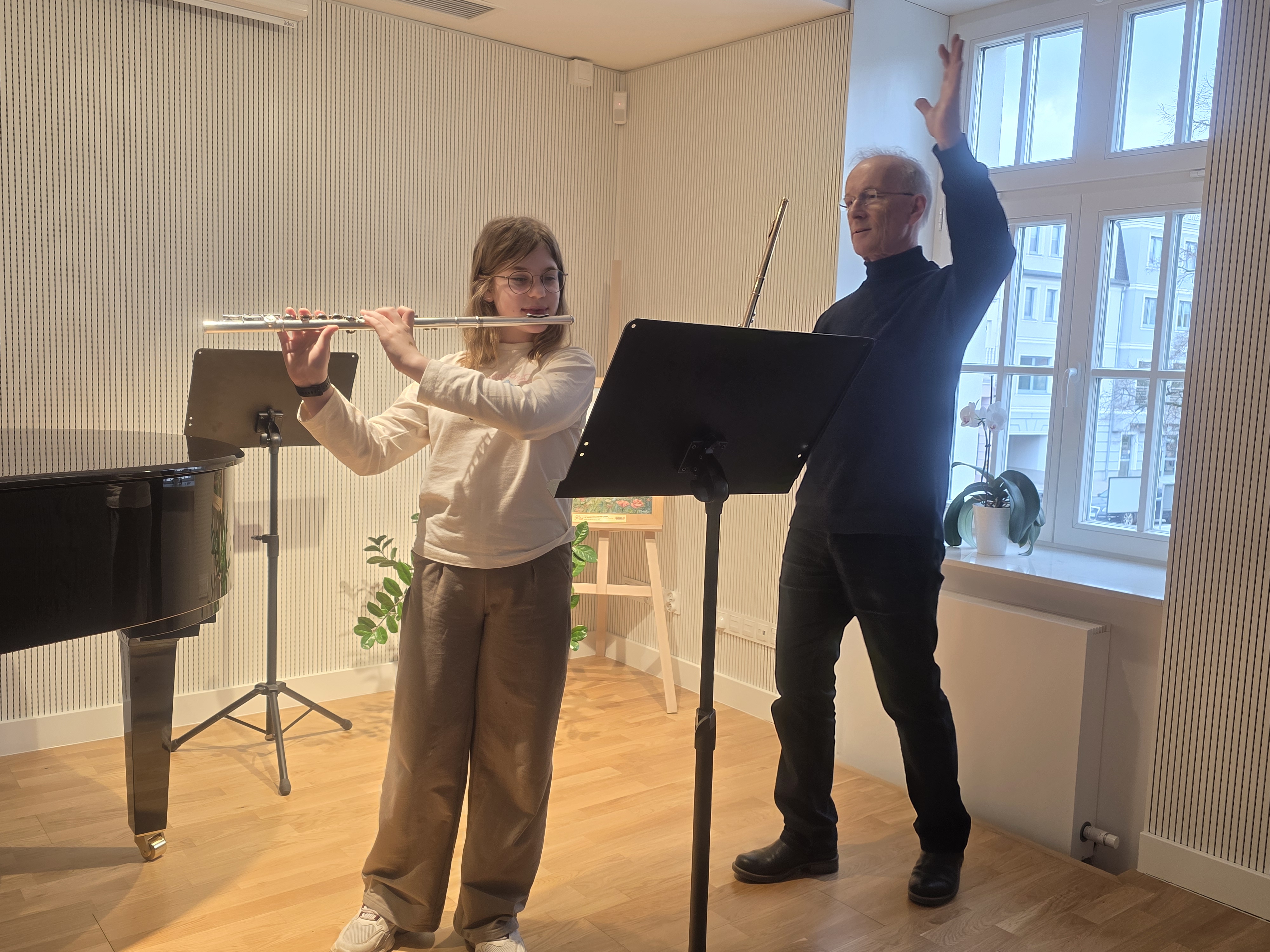 Profesor Traczewski wykształcił wielu laureatów konkursów krajowych i zagranicznych m.in. Łukasza Długosza. Tym razem przyjechał do Nowego Tomyśla, aby poprowadzić warsztaty fletowe, podzielić się swoją wiedzą i doświadczeniem z naszymi Flecistkami. Bardzo dziękujemy za poświęcony czas i wszystkie cenne uwagi.