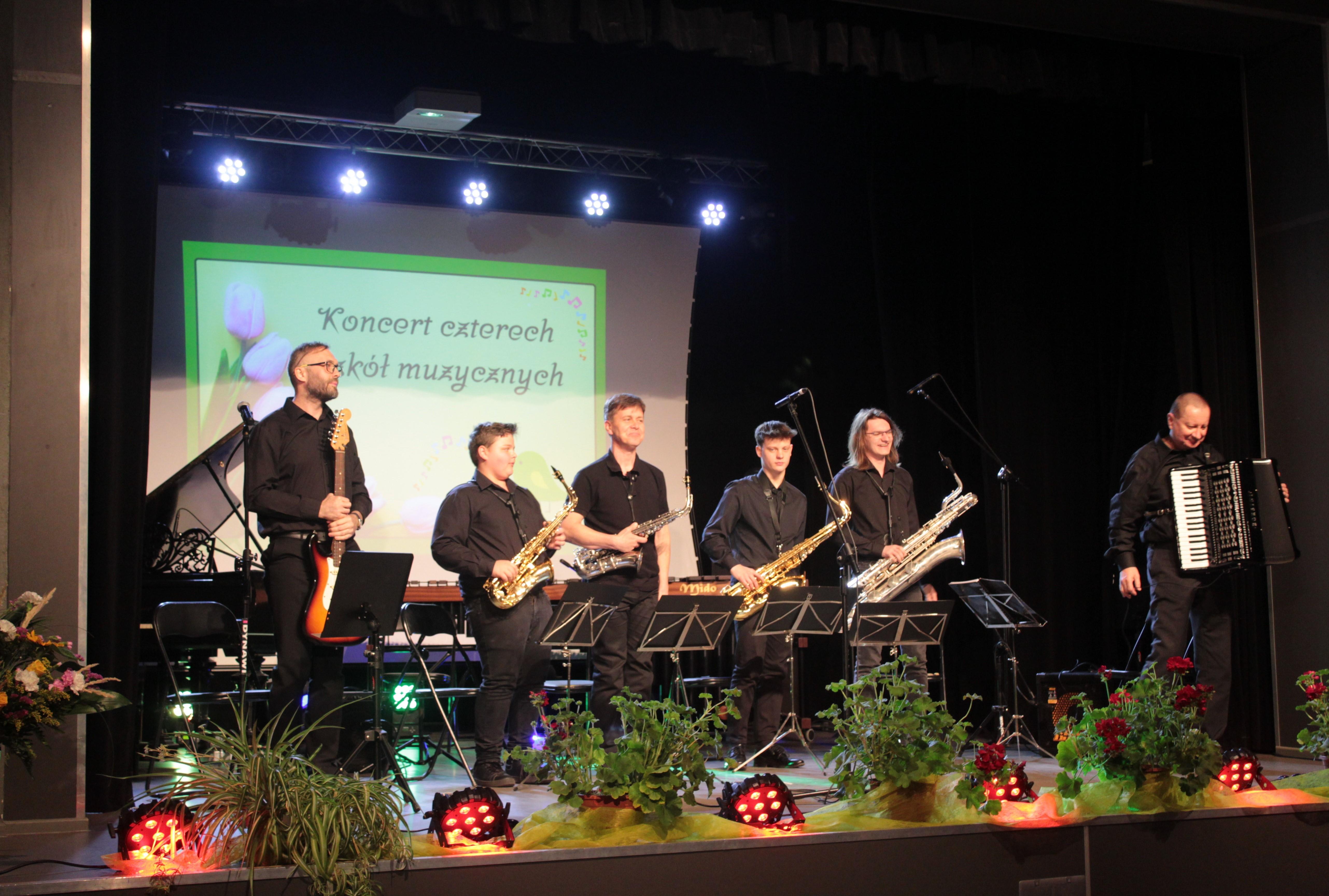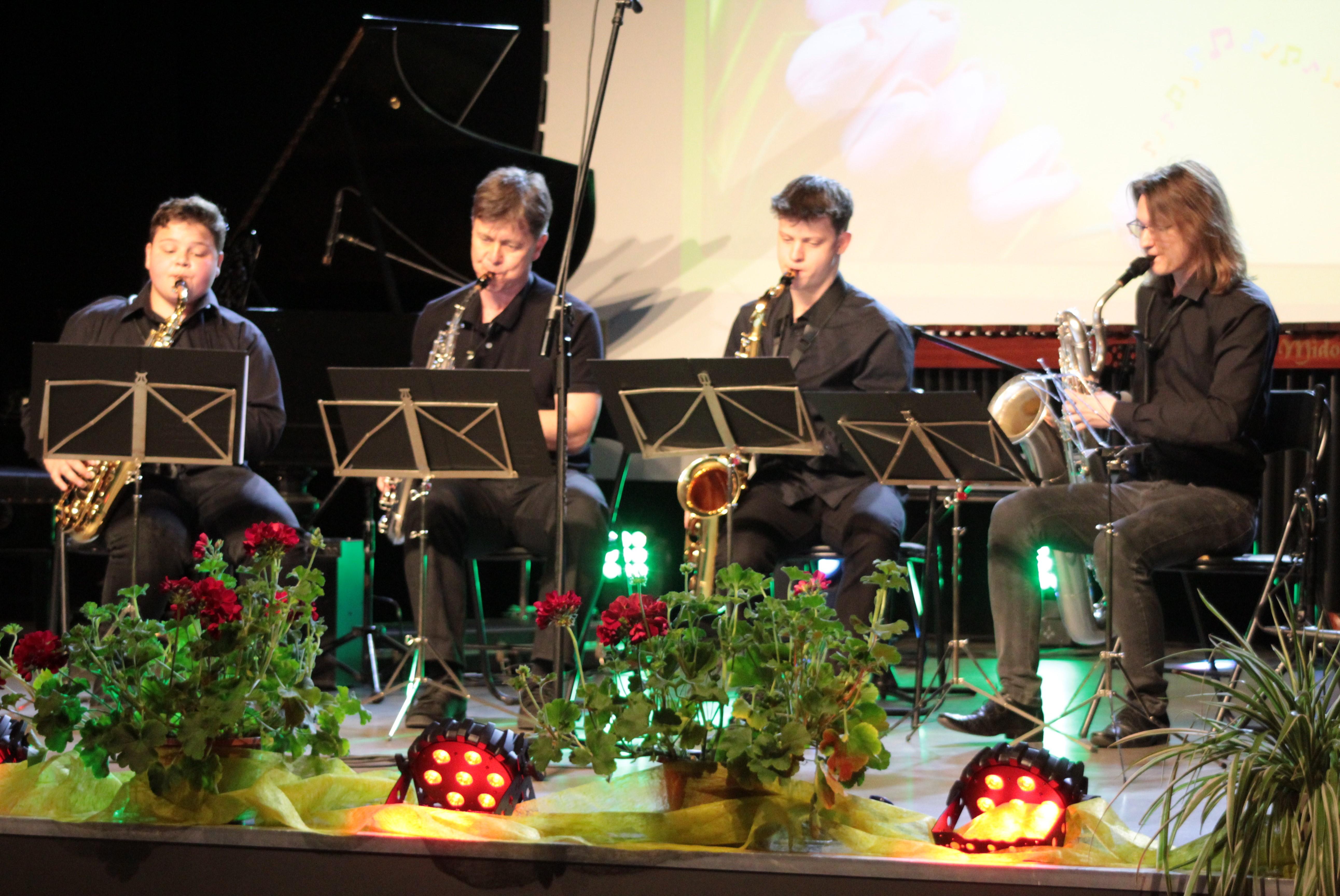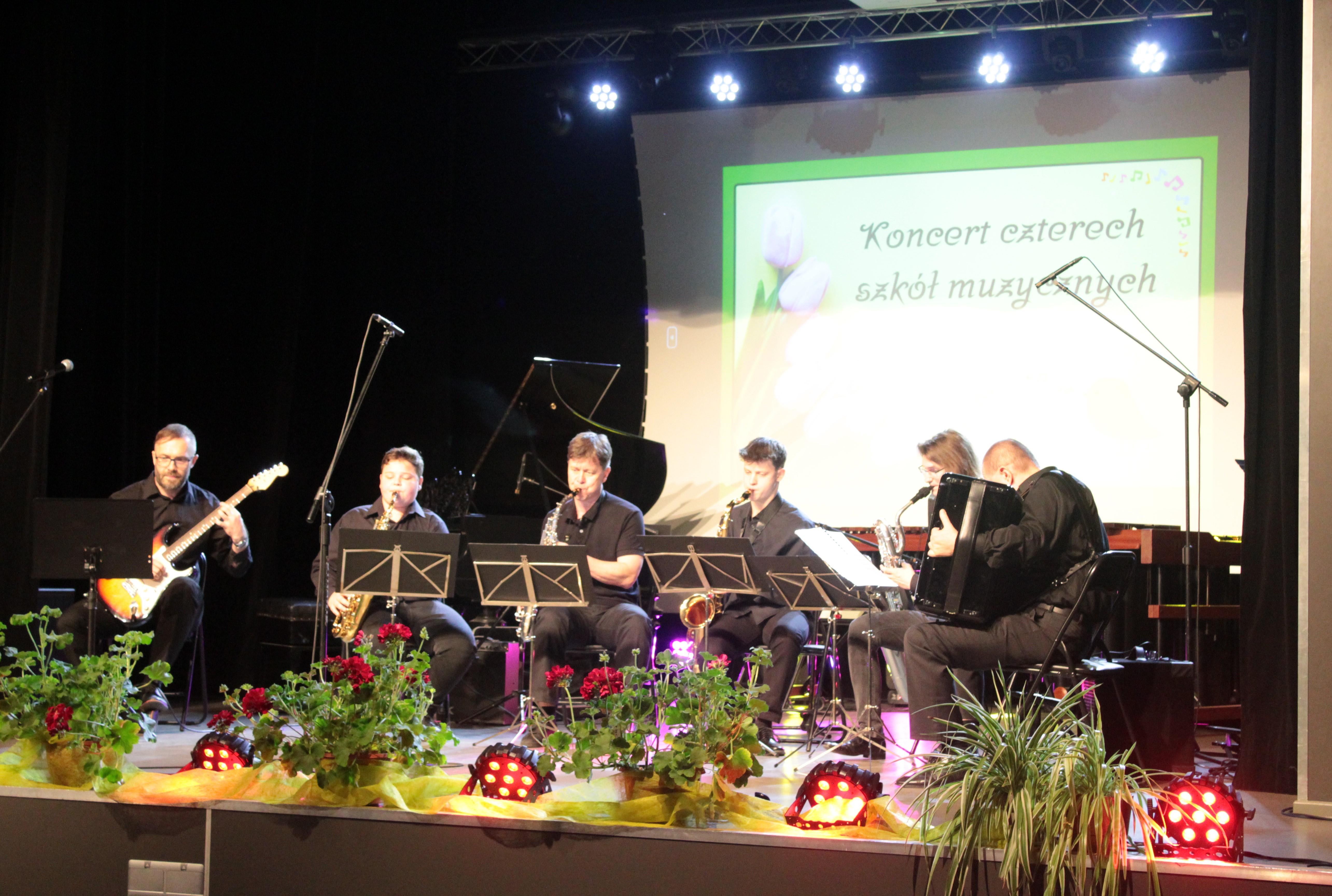 Kwartet Saksofonowy w składzie: Marcel Brambor, Maksymilian Dziechciarek, Miłosz Migoń, naucz. Rafał Kubale