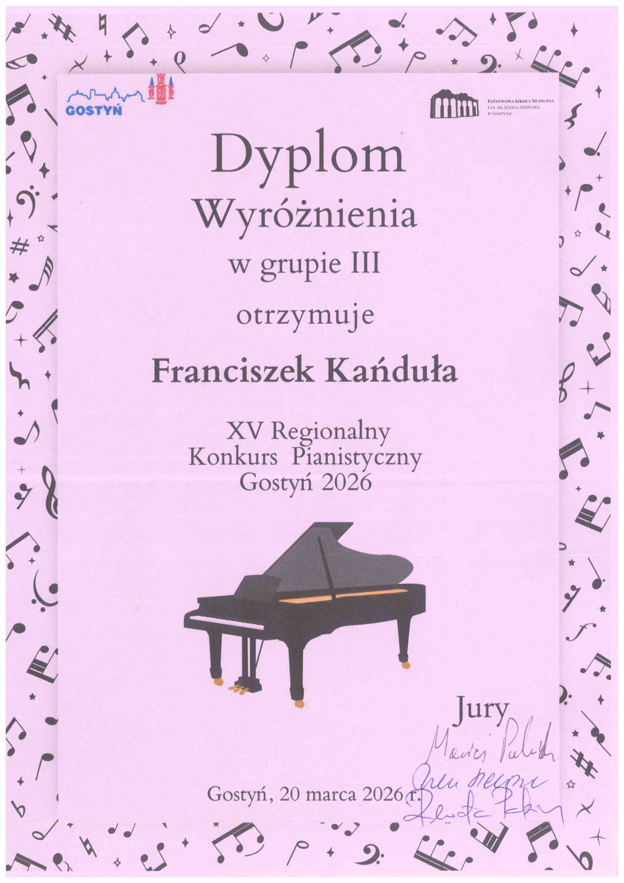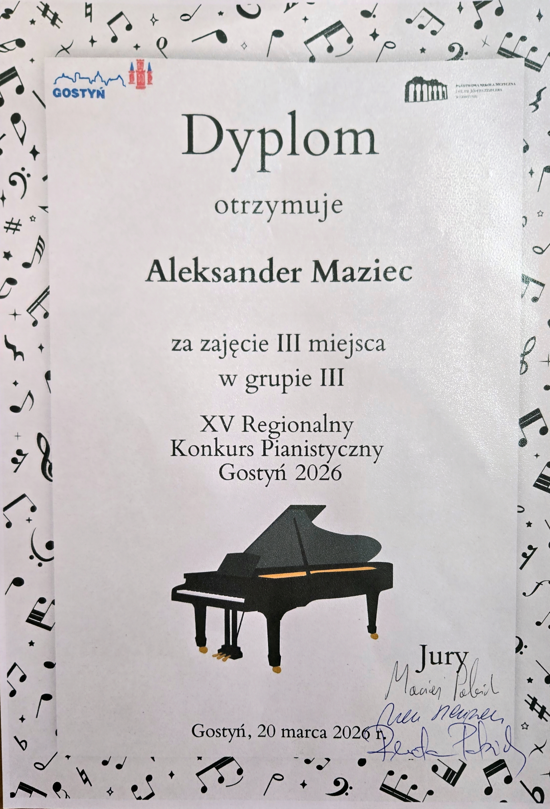 20 marca 2026 roku w Gostyniu odbył się XV Regionalny Konkurs Pianistyczny. Naszą szkołę reprezentowali Franciszek Kańduła oraz Aleksander Maziec, którzy są uczniami p. Mateusza Wizjana. Franciszek otrzymał wyróżnienie, a Aleksander zdobył III miejsce. W konkursie nie przyznano pierwszej nagrody.