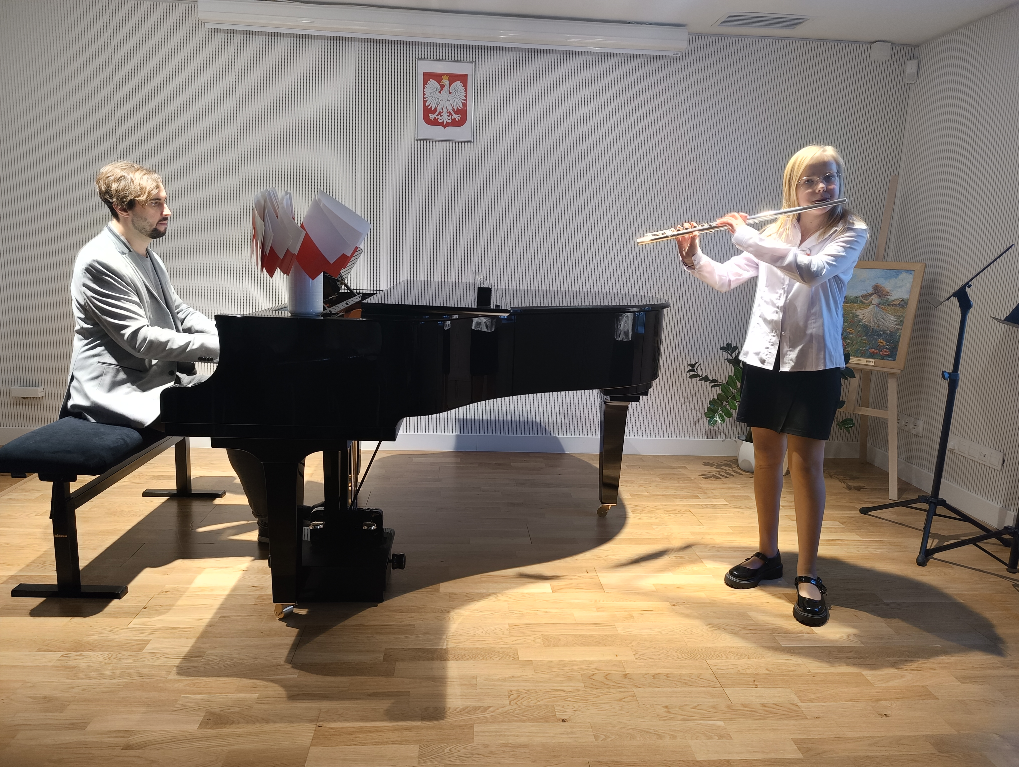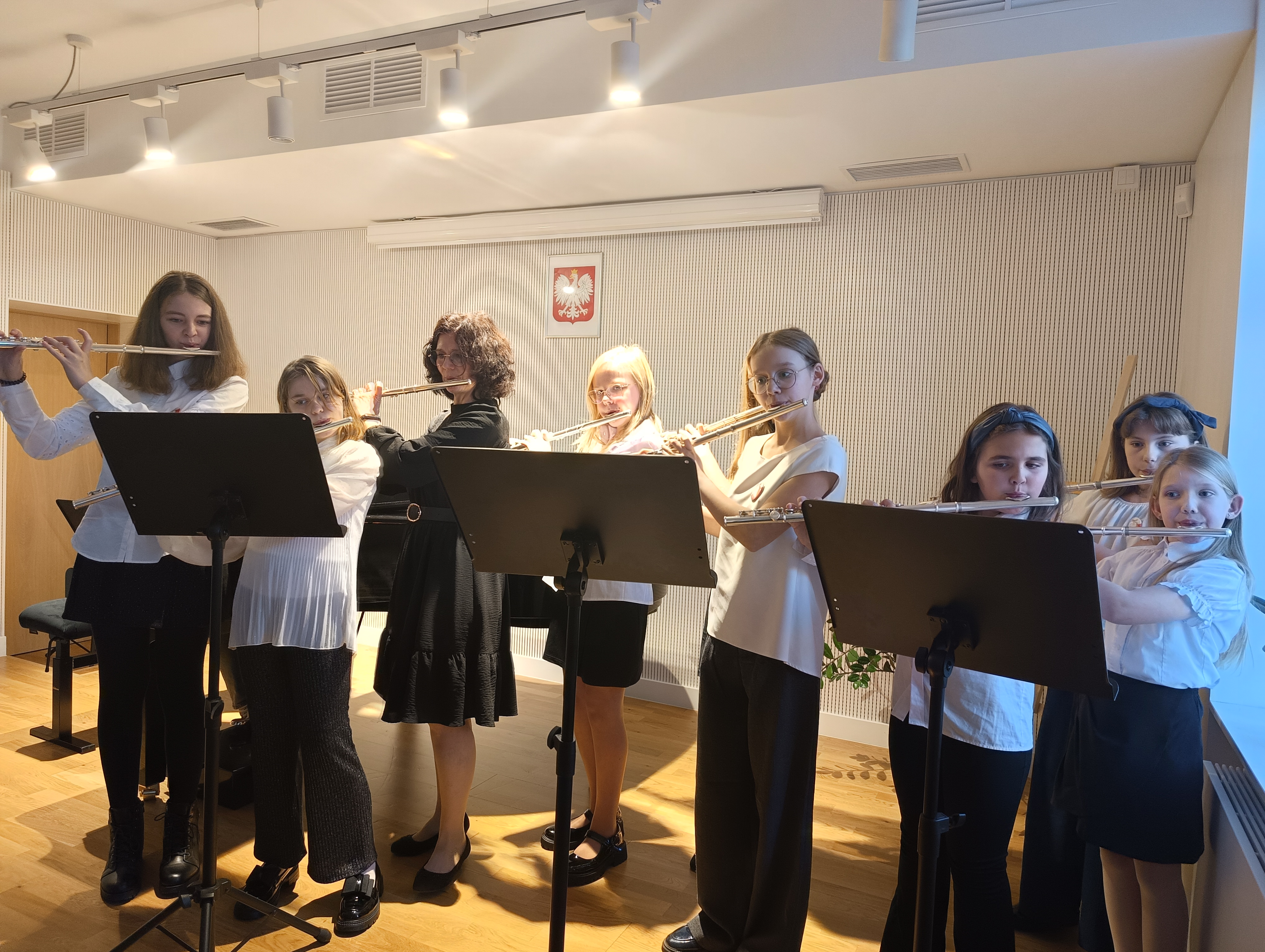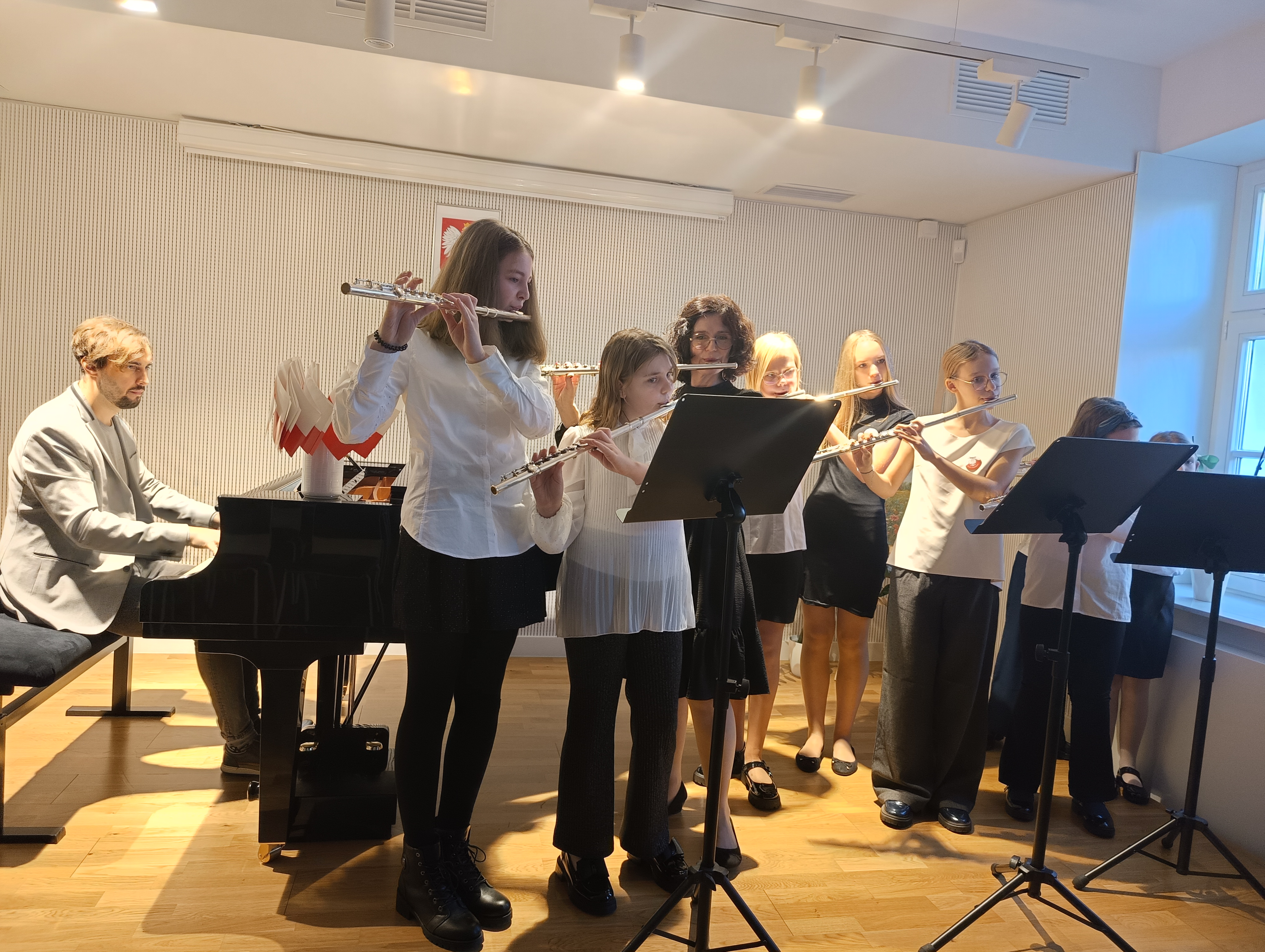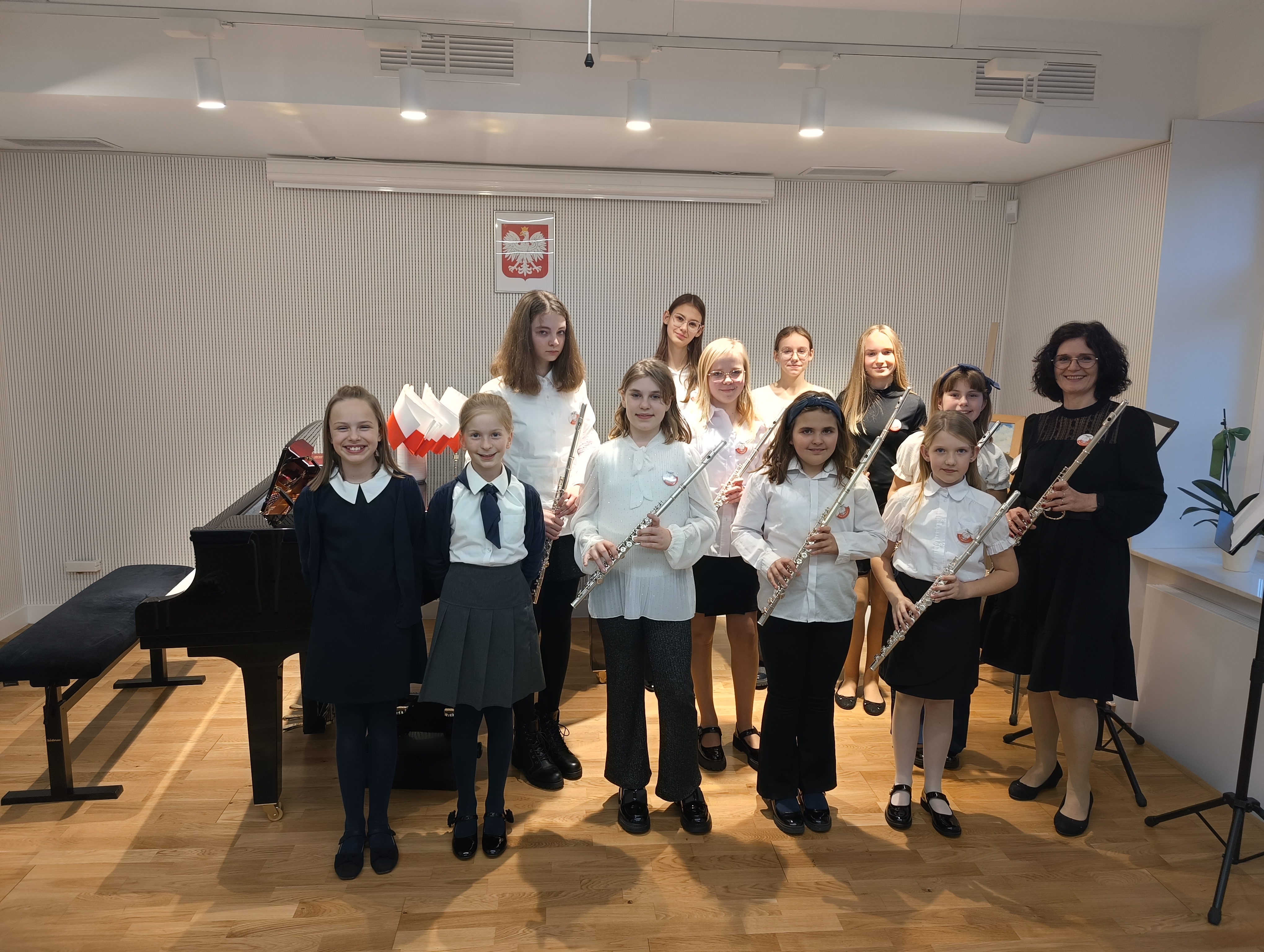 21 listopada odbył się w naszej szkole wyjątkowy koncert pt. "Flety patriotycznie". Nasze Flecistki, z klasy p. Anny Wojtowicz, zaprezentowały utwory patriotyczne, m.in. "O mój rozmarynie", "Przybyli Ułani", "Czerwone Maki na Monte Casino". Flecistkom, przy fortepianie, towarzyszyli: p. Julia Wizjan, p. Mateusz Wizjan, a także młodsze koleżanki z klasy p. Julii Wizjan - Maria Ford i Joanna Poschwald.