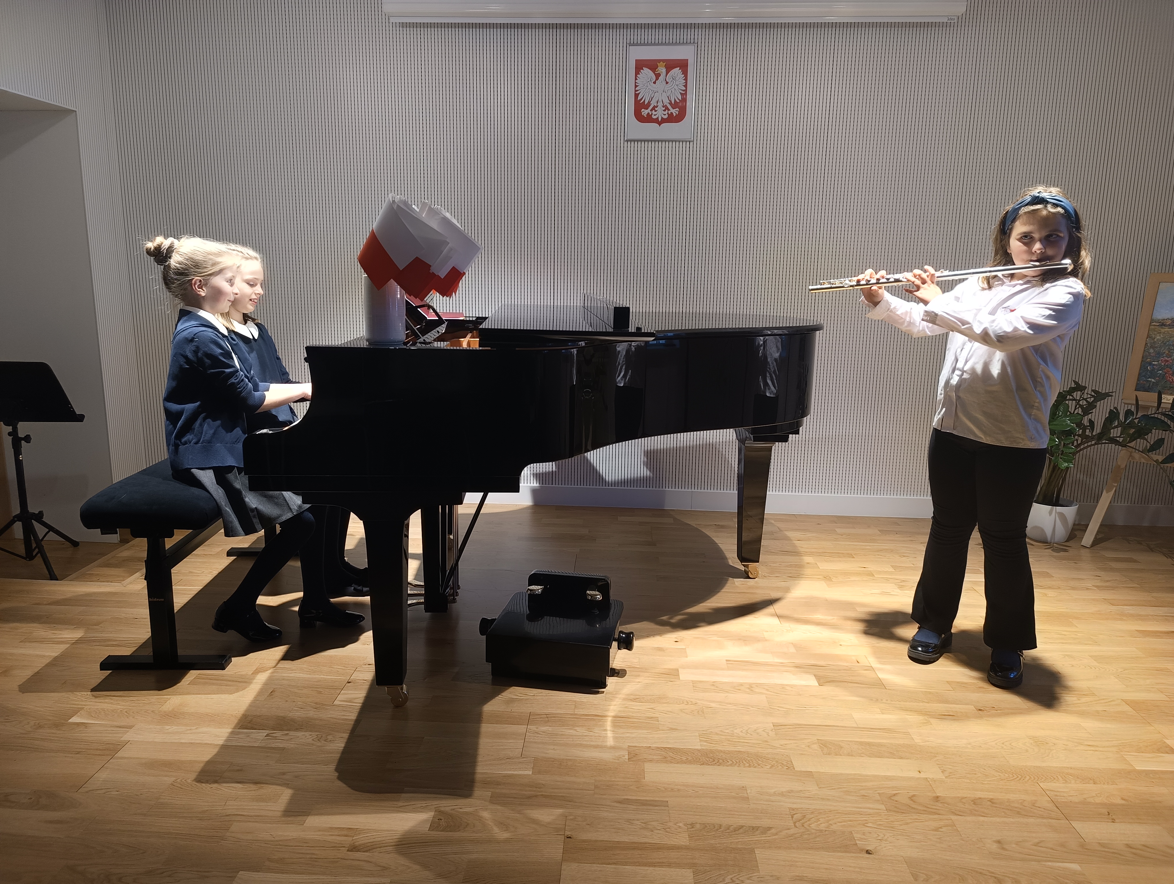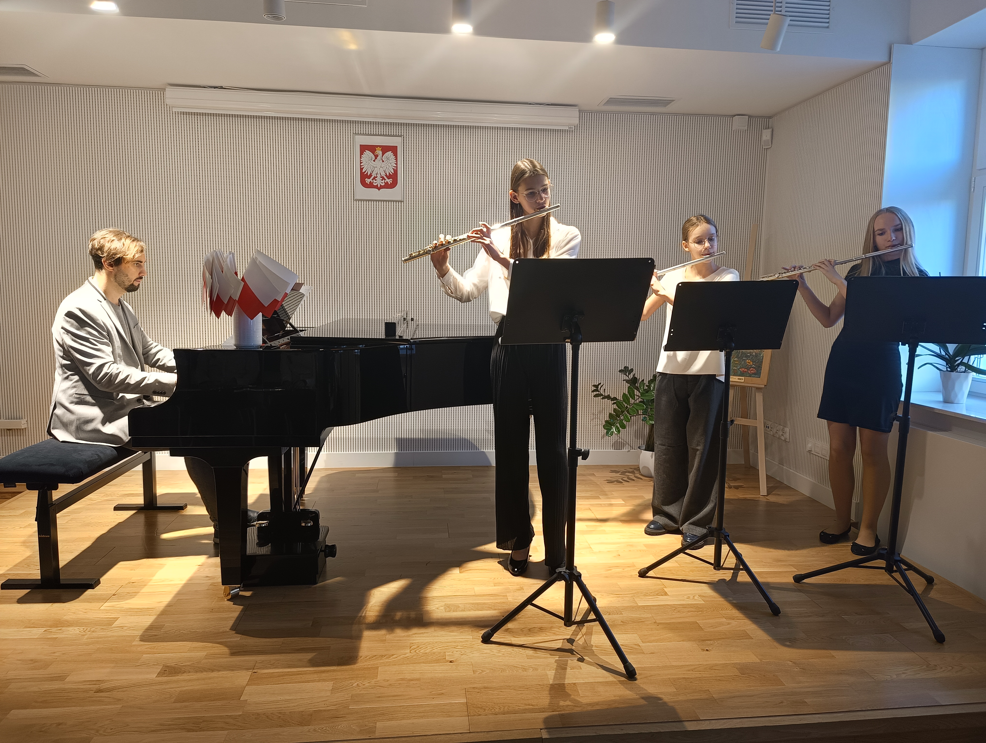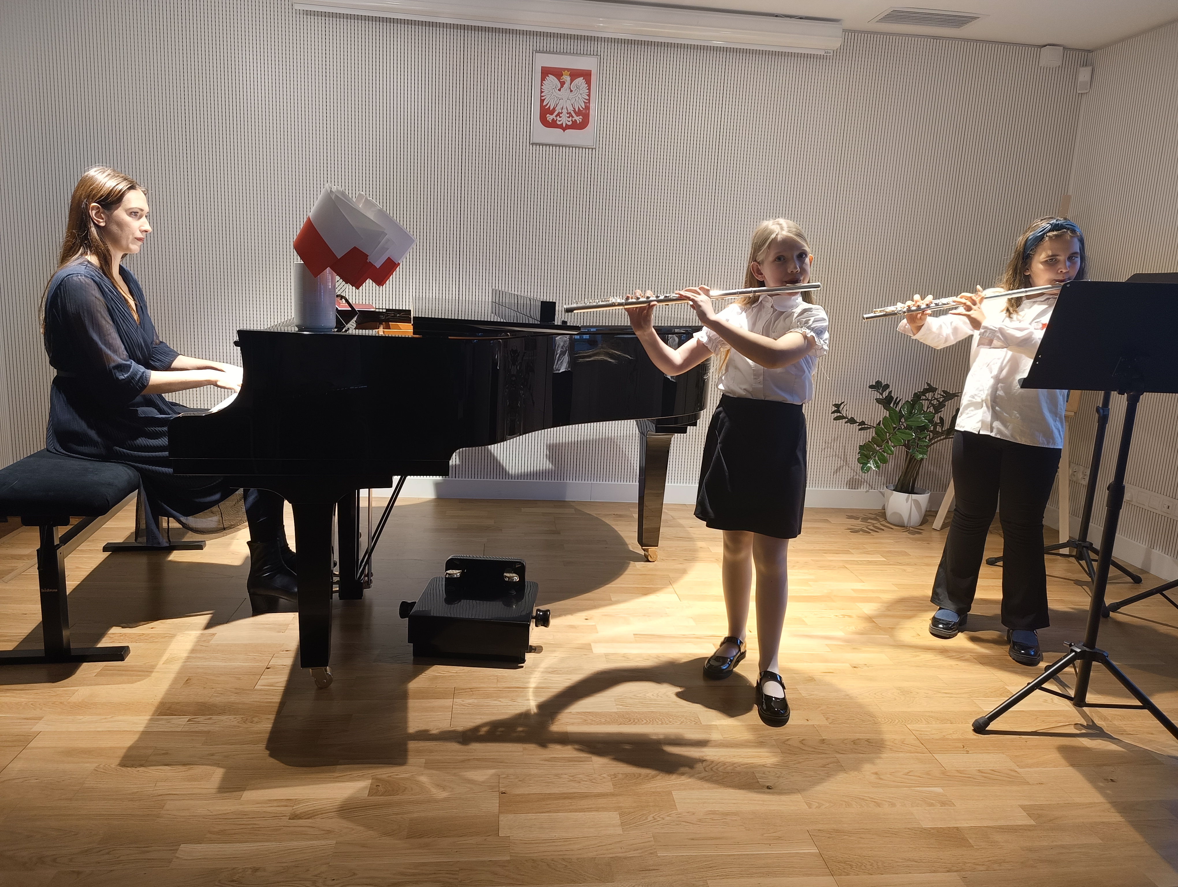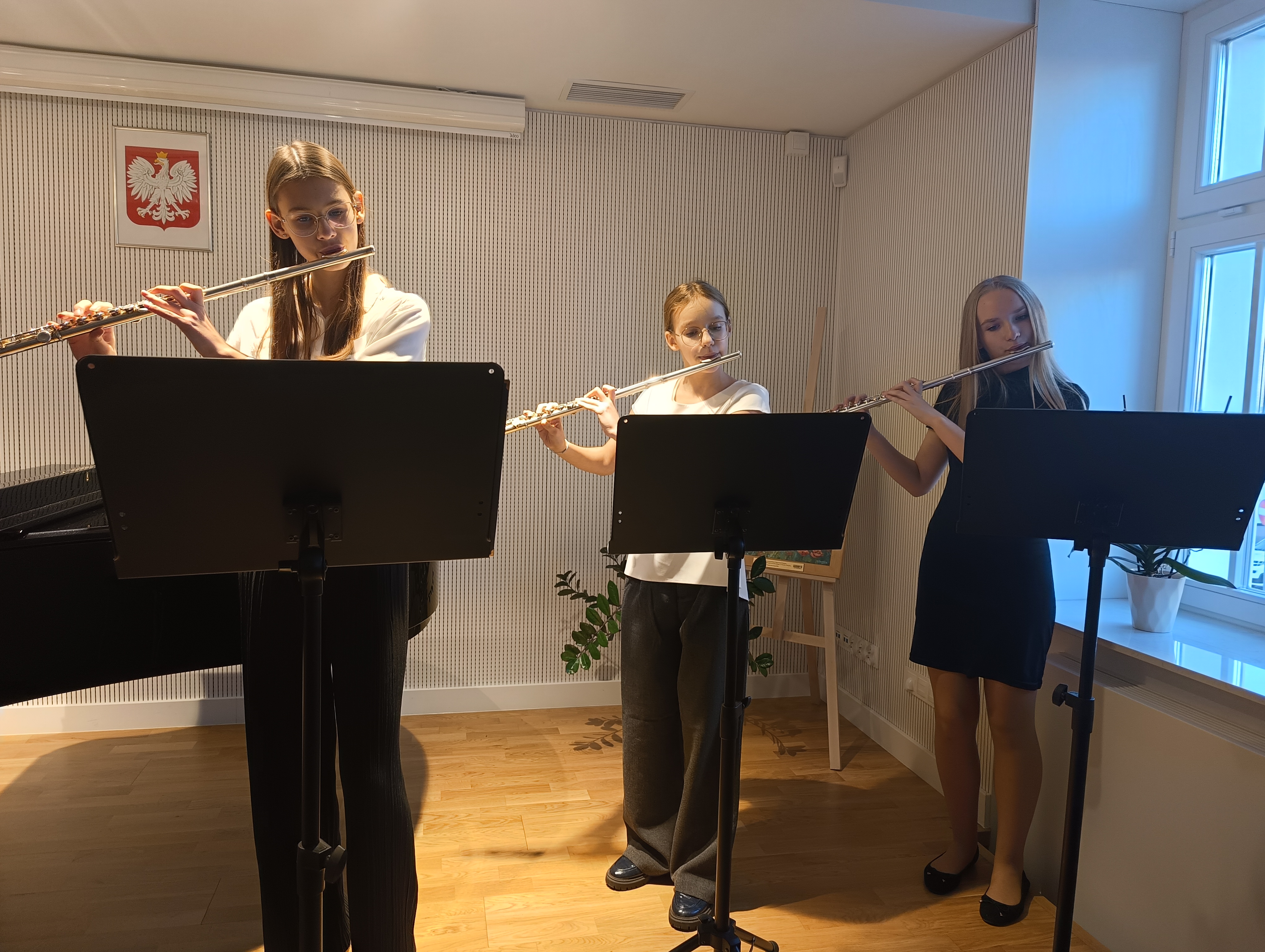 21 listopada odbył się w naszej szkole wyjątkowy koncert pt. "Flety patriotycznie". Nasze Flecistki, z klasy p. Anny Wojtowicz, zaprezentowały utwory patriotyczne, m.in. "O mój rozmarynie", "Przybyli Ułani", "Czerwone Maki na Monte Casino". Flecistkom, przy fortepianie, towarzyszyli: p. Julia Wizjan, p. Mateusz Wizjan, a także młodsze koleżanki z klasy p. Julii Wizjan - Maria Ford i Joanna Poschwald.