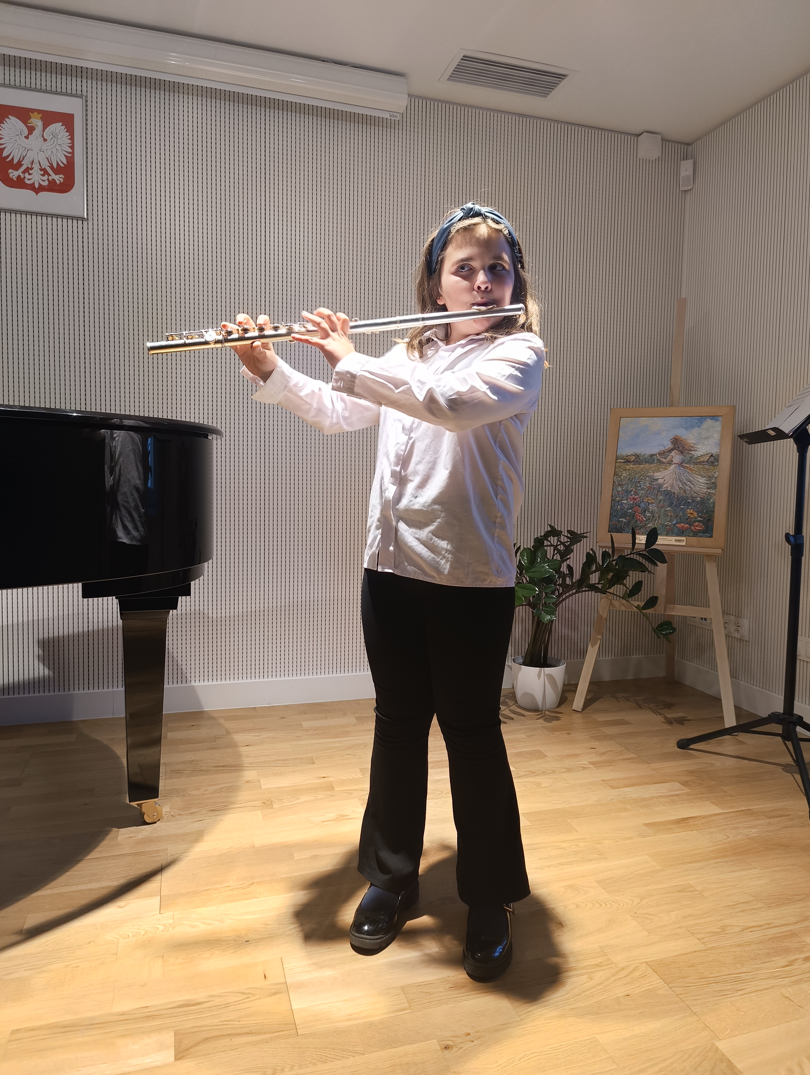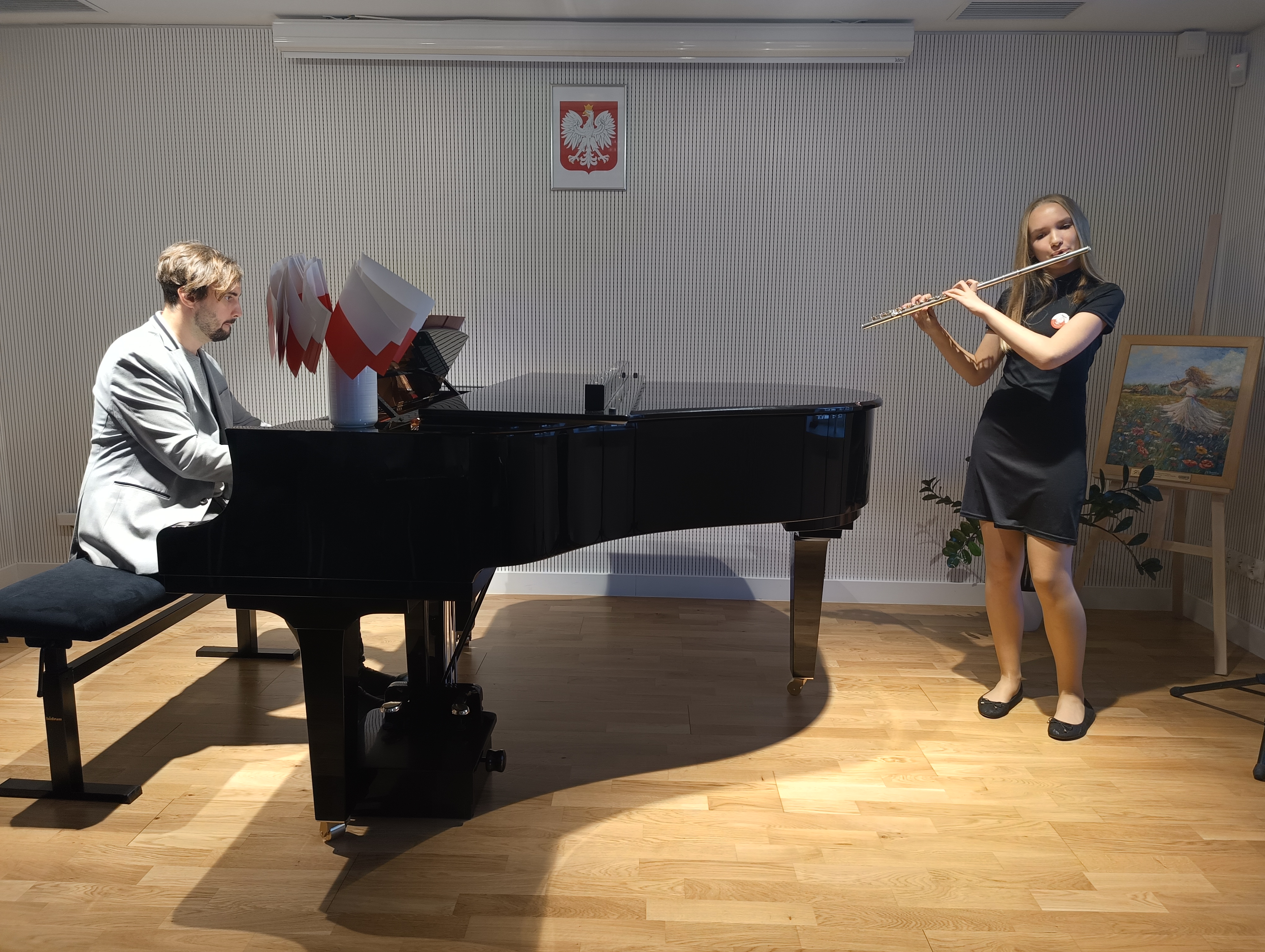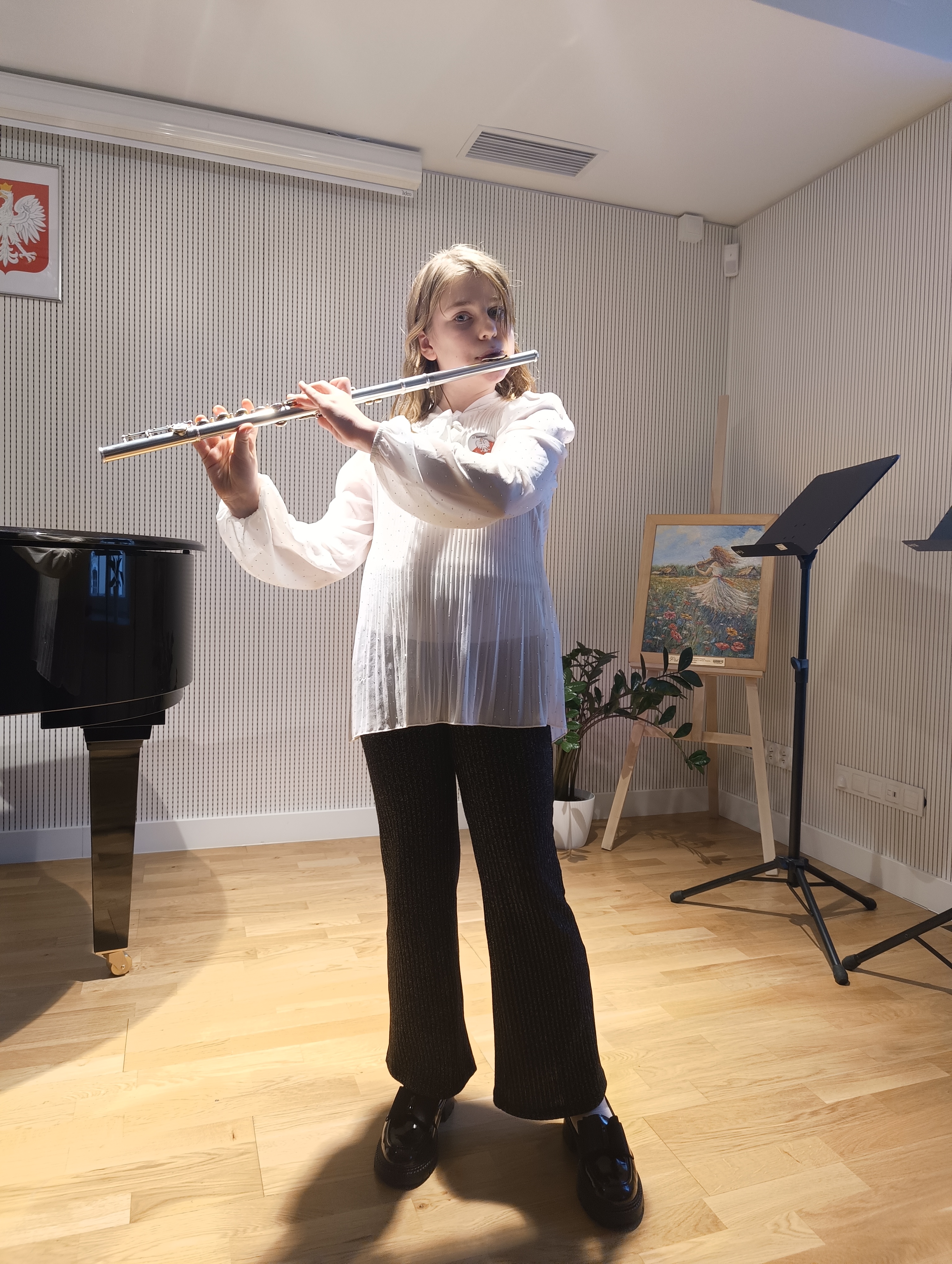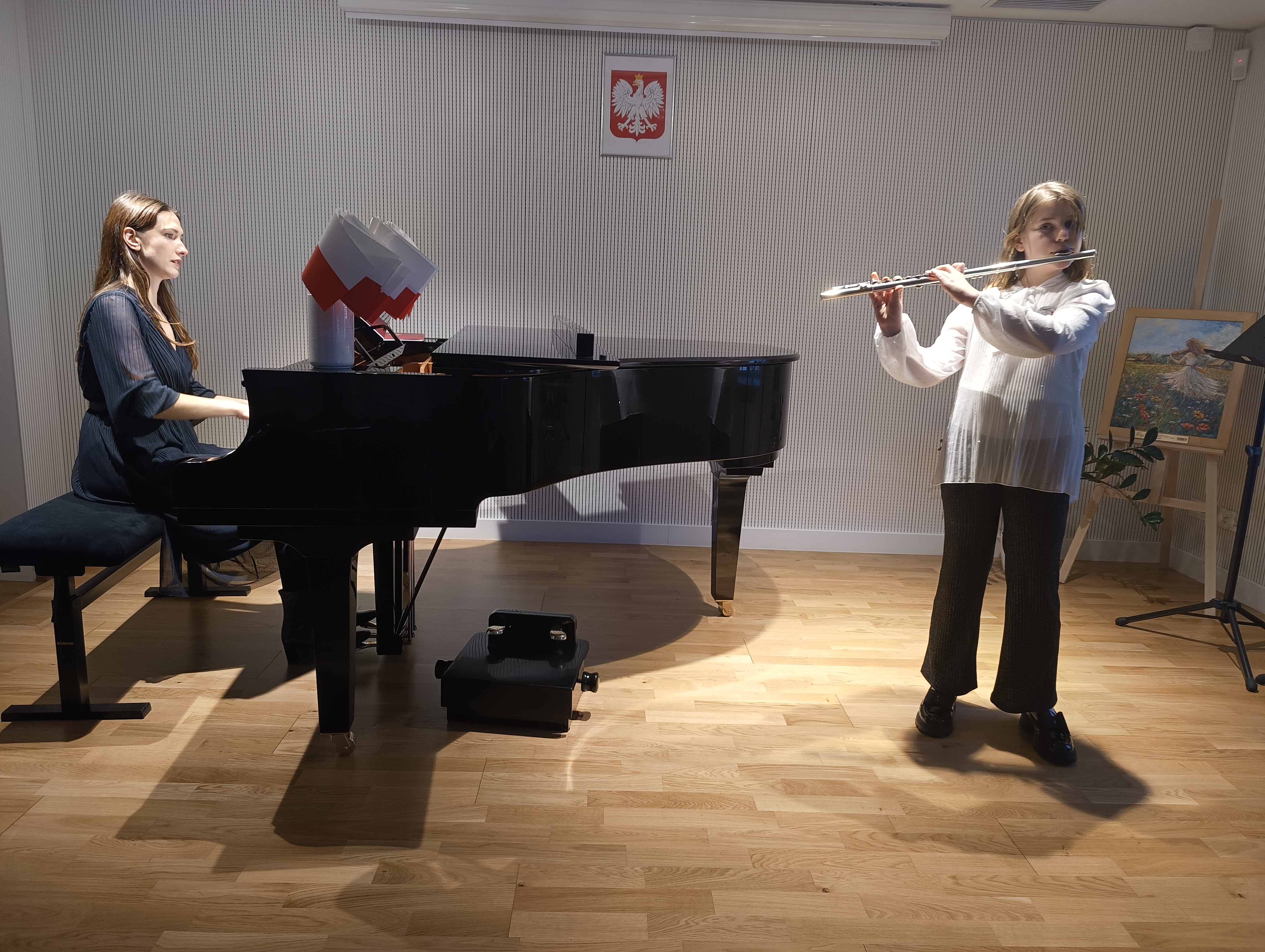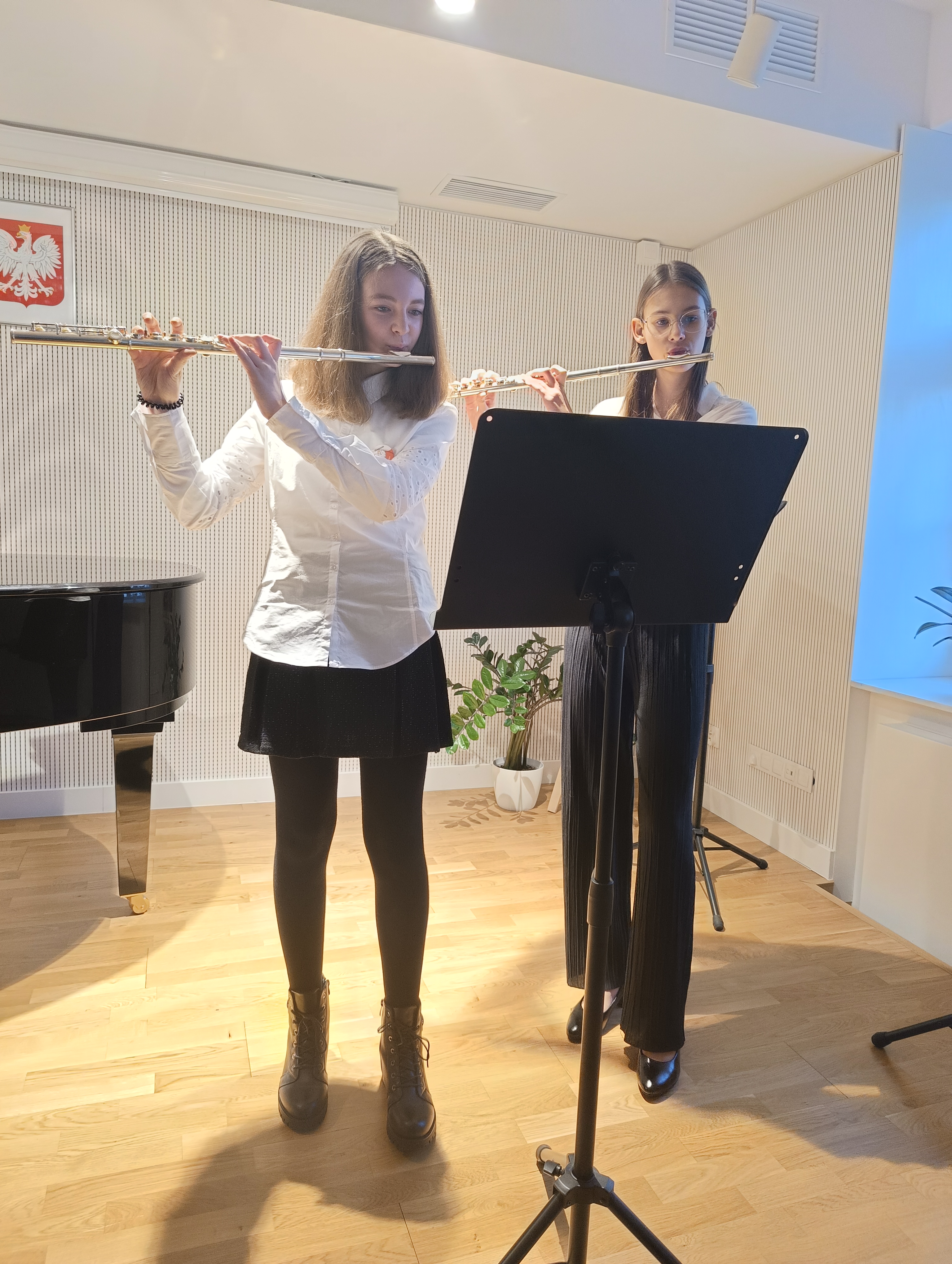 21 listopada odbył się w naszej szkole wyjątkowy koncert pt. "Flety patriotycznie". Nasze Flecistki, z klasy p. Anny Wojtowicz, zaprezentowały utwory patriotyczne, m.in. "O mój rozmarynie", "Przybyli Ułani", "Czerwone Maki na Monte Casino". Flecistkom, przy fortepianie, towarzyszyli: p. Julia Wizjan, p. Mateusz Wizjan, a także młodsze koleżanki z klasy p. Julii Wizjan - Maria Ford i Joanna Poschwald.