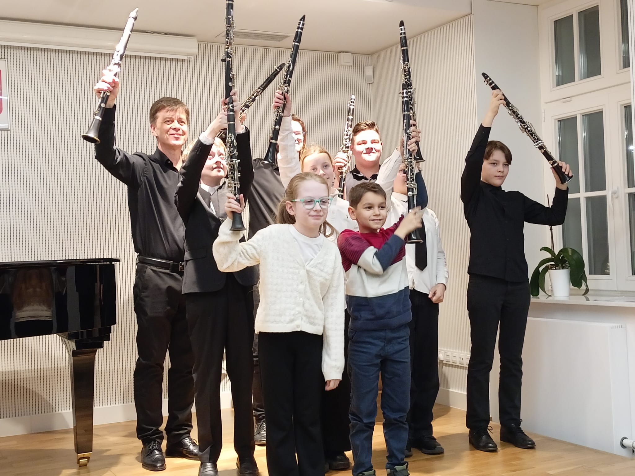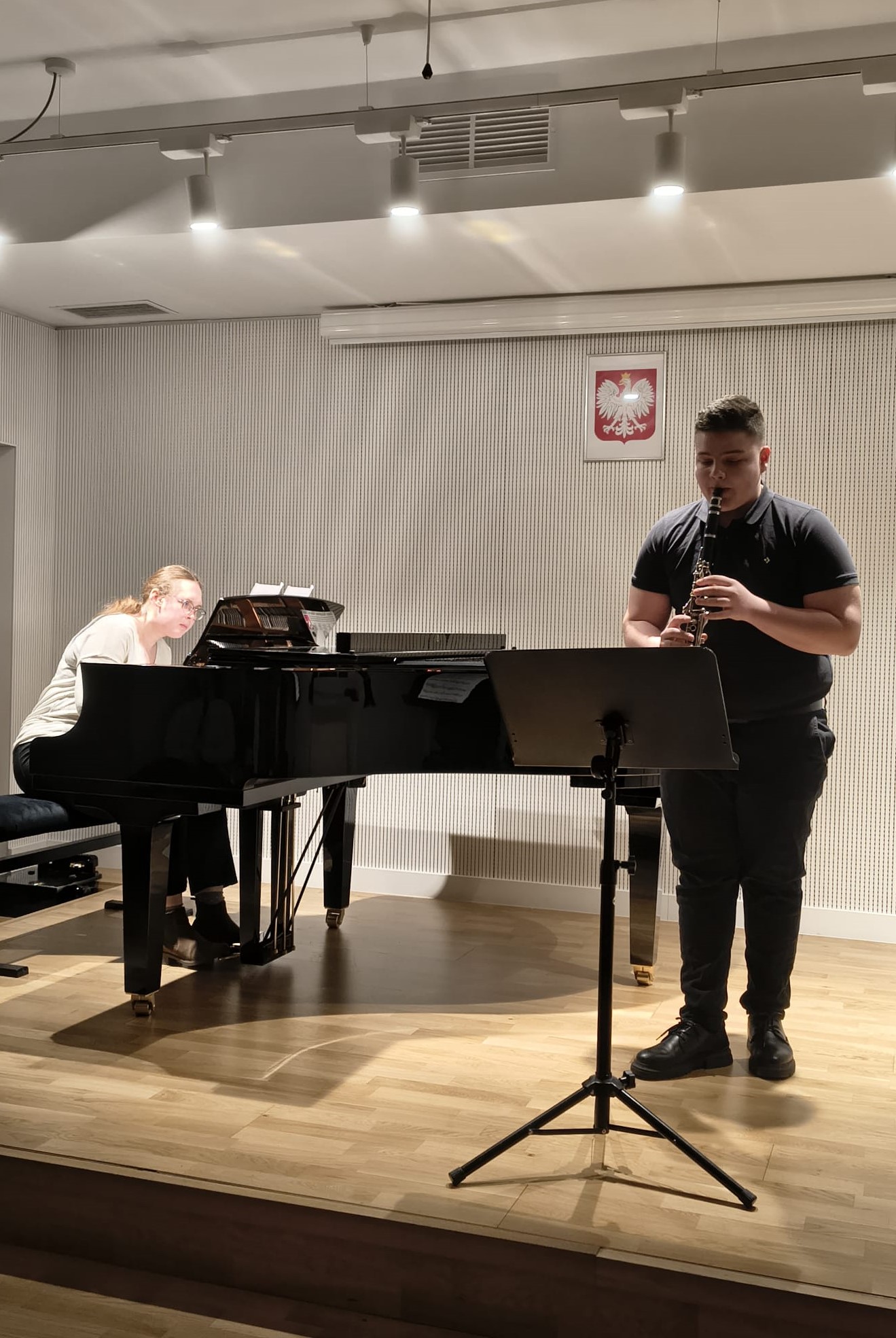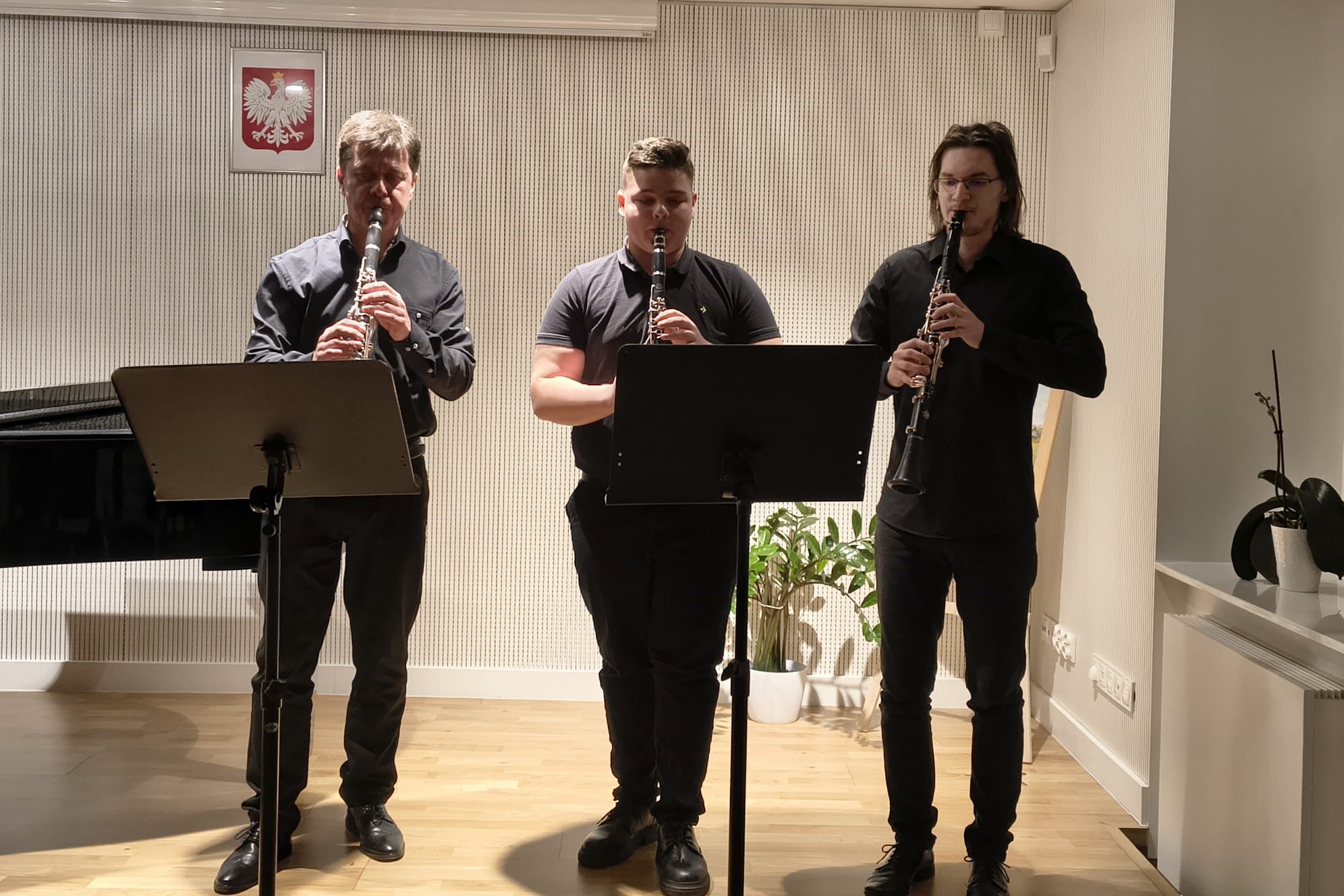 Trio klarnetowe w składzie: Miłosz Migoń, Marcel Brambor wraz z nauczycielem.