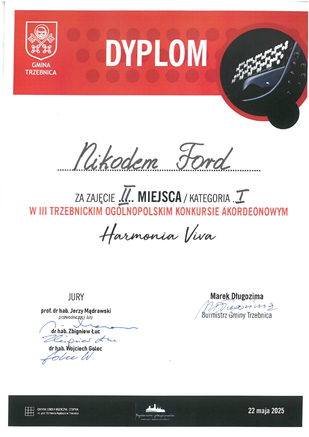 Z wielką radością informujemy o sukcesie naszego ucznia Nikodema Forda na III Trzebnickim Ogólnopolskim Konkursie Akordeonowym "Harmonia Viva" w dniu 22 maja 2025 roku. Nikodem przygotowany przez Pana Tomasza Milera bardzo dobrze wykonał swój sześciominutowy program i zajął 2 miejsce w I kategorii (dla klas 1-3 c. 6 i 1-2 c. 4), w której wystąpiło 18 uczestników ze szkół muzycznych w Zgorzelcu, Bielsku-Białej, Wrocławiu, Oławie, Kielcach, Strzelcach Opolskich, Oleśnicy, Wałbrzychu, Pleszewie, Wieluniu, Trzebnicy i naszego Nowego Tomyśla.