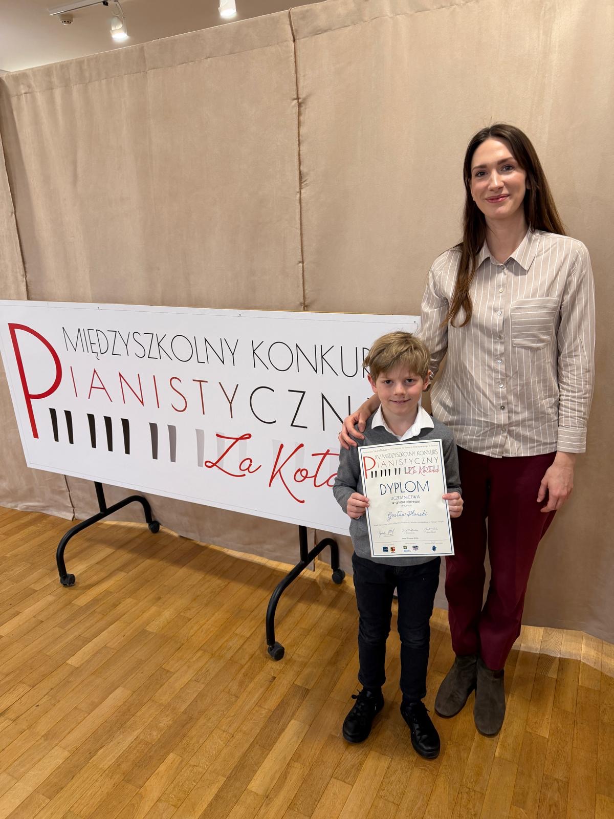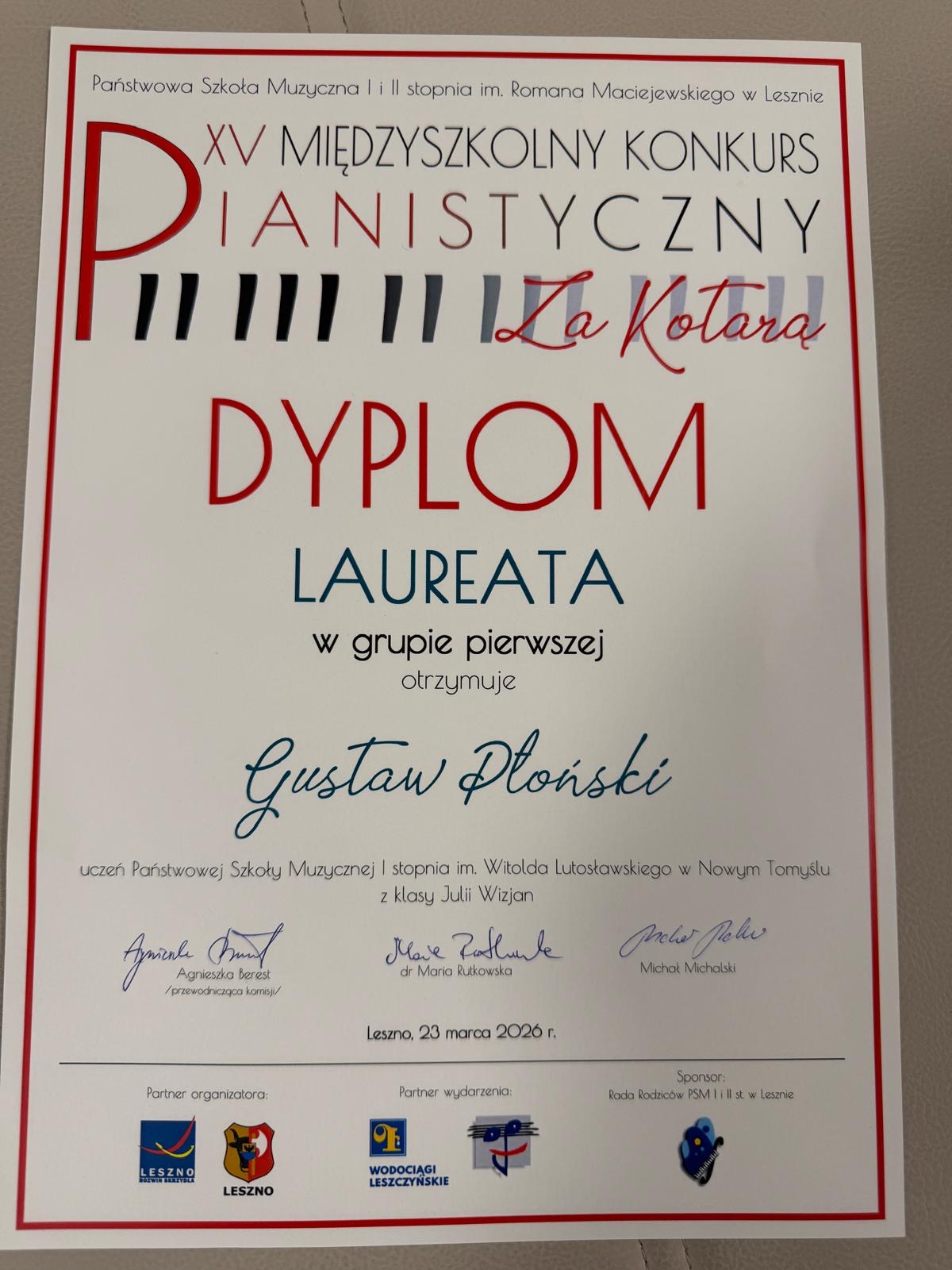 Gustaw Płoński - uczeń z I klasy fortepianu kształcący się u pani dr Julii Wizjan otrzymał najwyższą punktację, z pośród kilkunastu uczestników, w kategorii I, zdobywając tytuł Laureata na XV Międzyszkolnym Konkursie Pianistycznym „Za kotarą”, który odbył się 23 marca w Lesznie.