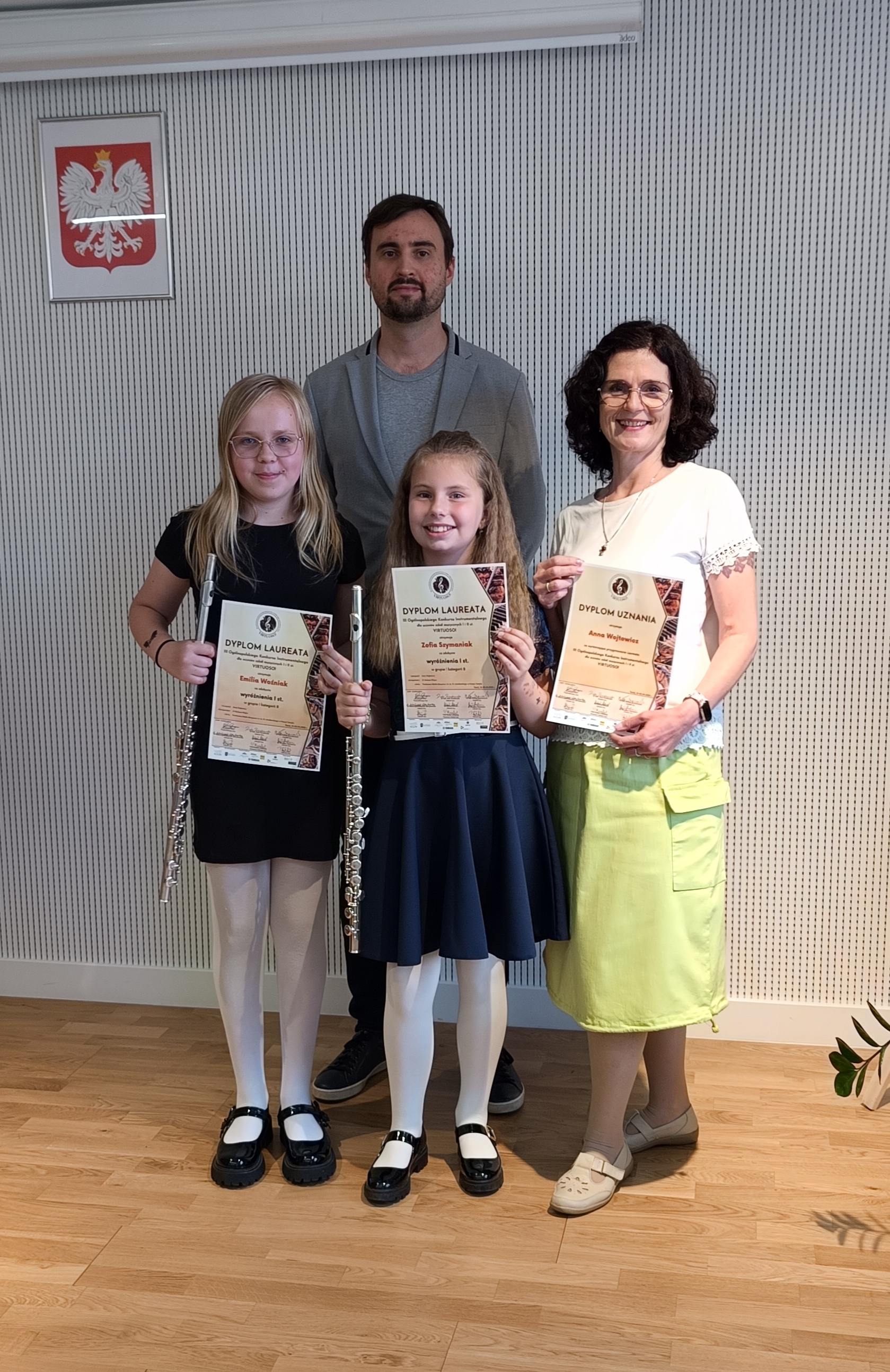 Tym razem Zofia Szymaniak kl. I c.6, Emilia Woźniak kl. I c.4 - Uczennice klasy fletu mgr Anny Wojtowicz oraz Aleksander Maziec kl. III c.4 - Pianista, Uczeń dra Mateusza Wizjana, zostali LAUREATAMI III Ogólnopolskiego Konkursu Instrumentalnego dla szkół muzycznych I i II st. VIRTUOSO! Obie Flecistki otrzymały Wyróżnienie I st. w grupie I, kategorii B, natomiast Pianista otrzymał Wyróżnienie II st. w grupie III, kategorii D. Dziewczynkom przy fortepianie towarzyszył dr Mateusz Wizjan. Nagrodzeni zostali również nasi Nauczyciele - mgr Anna Wojtowicz i dr Mateusz Wizjan za wyróżniające przygotowanie Laureata oraz dodatkowo dr Mateusz Wizjan za wyróżniający akompaniament. Serdecznie gratulujemy i życzymy kolejnych sukcesów.