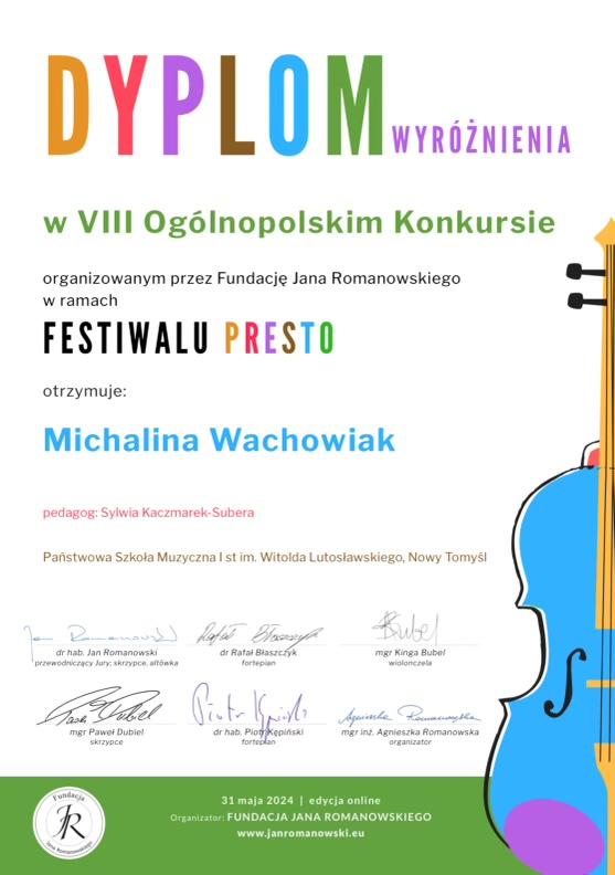 Z radością informujemy o laurach uczniów naszej szkoły. Aleksander Maziec uczeń z klasy dr Mateusza Wizjana zdobył Dyplom Laureata, natomiast Michalina Wachowiak i Zofia Wypych z klasy mgr Sylwii Kaczmarek-Subera zdobyły wyróżnienie w VIII Ogólnopolskim Konkursie organizowanym w ramach Festiwalu Presto.