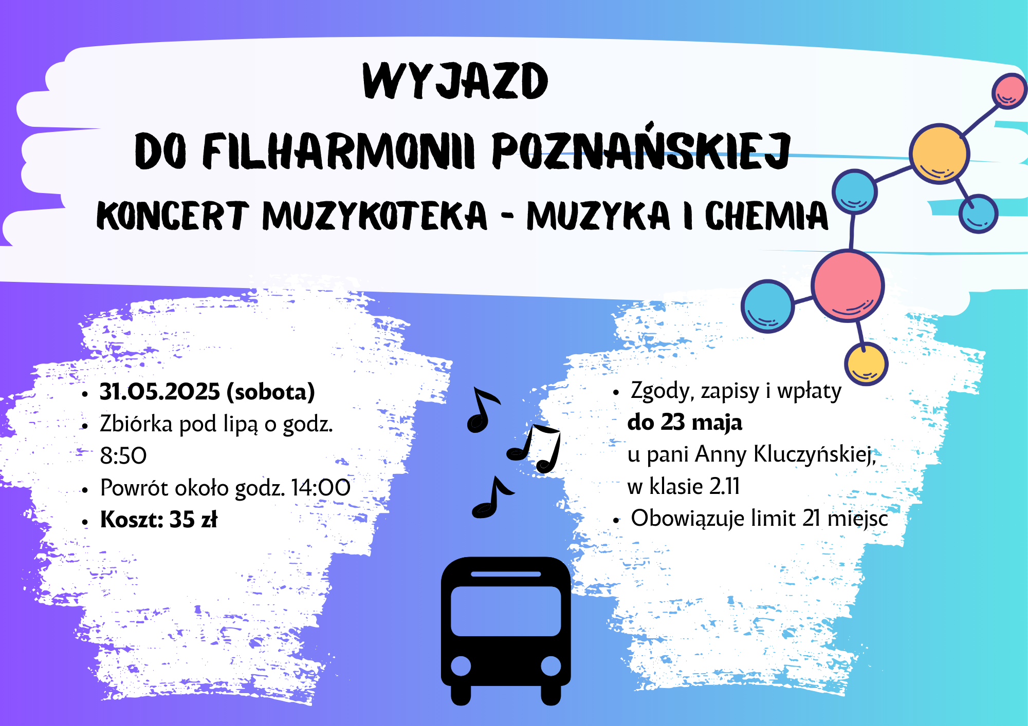 W sobotę, 31 maja 2025 r. wyruszyliśmy do Filharmonii Poznańskiej na koncert z cyklu MUZYKOTEKA zatytułowany ,,Muzyka i chemia". Orkiestra Filharmonii Poznańskiej pod batutą Eiji Oue wykonała kompozycje Paula Dukasa, Maurice'a Ravela oraz Georges'a Bizeta.
