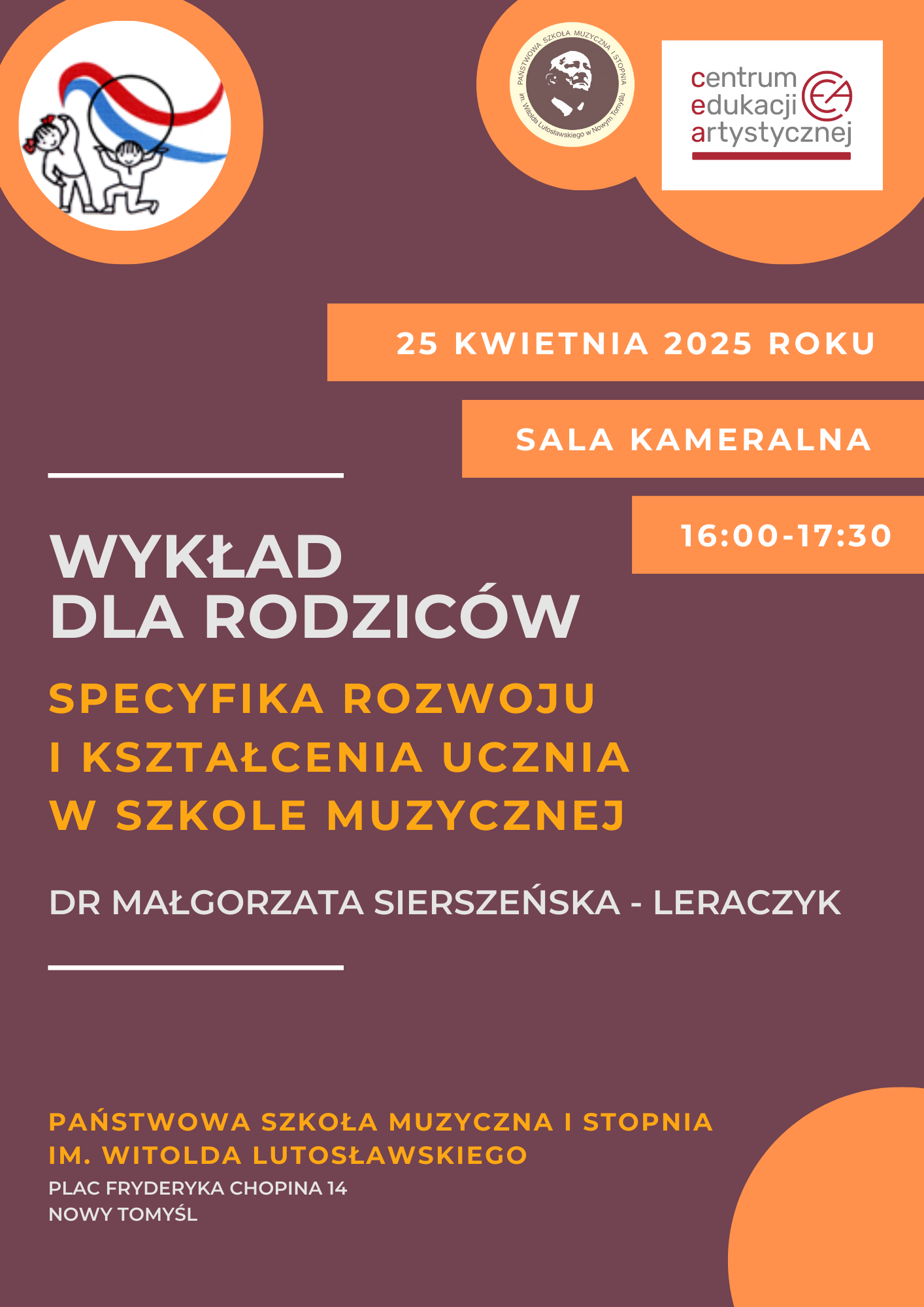 Bardzo serdecznie zapraszamy na spotkanie z panią dr Małgorzatą Sierszeńską- Leraczyk, która jest nie tylko uznanym w środowisku artystycznym psychologiem muzyki, psychologiem szkolnym, prowadzi wykłady na wielu uczelniach muzycznych w kraju i za granicą, współpracuje Akademią Muzyczną w Poznaniu, z Towarzystwem im. Henryka Wieniawskiego w Poznaniu. Narodowym Instytutem Muzyki i Tańca. Jest mentorem młodych pokoleń artystów ale i mamą :).