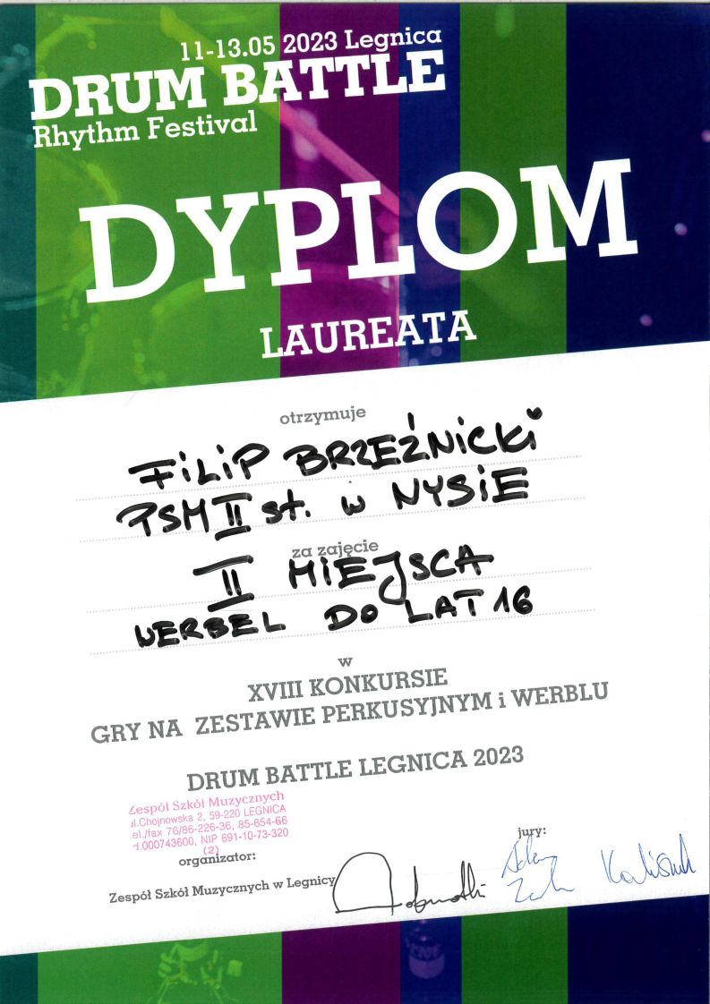 11-13 maja 2023 - Filip Brzeźnicki zdobył II miejsce w XVIII Konkursie w Ramach DRUM BATTLE w Legnicy 15.05.2023 XVIII KONKURS GRY NA ZESTAWIE PERKUSYJNYM I WERBLU w ramach DRYM BATTLE Rhythm Festival w Legnicy II MIEJSCE w grze na werblu zdobył FILIP BRZEŹNICKI klasa III instrumentalistyki nauczyciel - Urszula Przywara