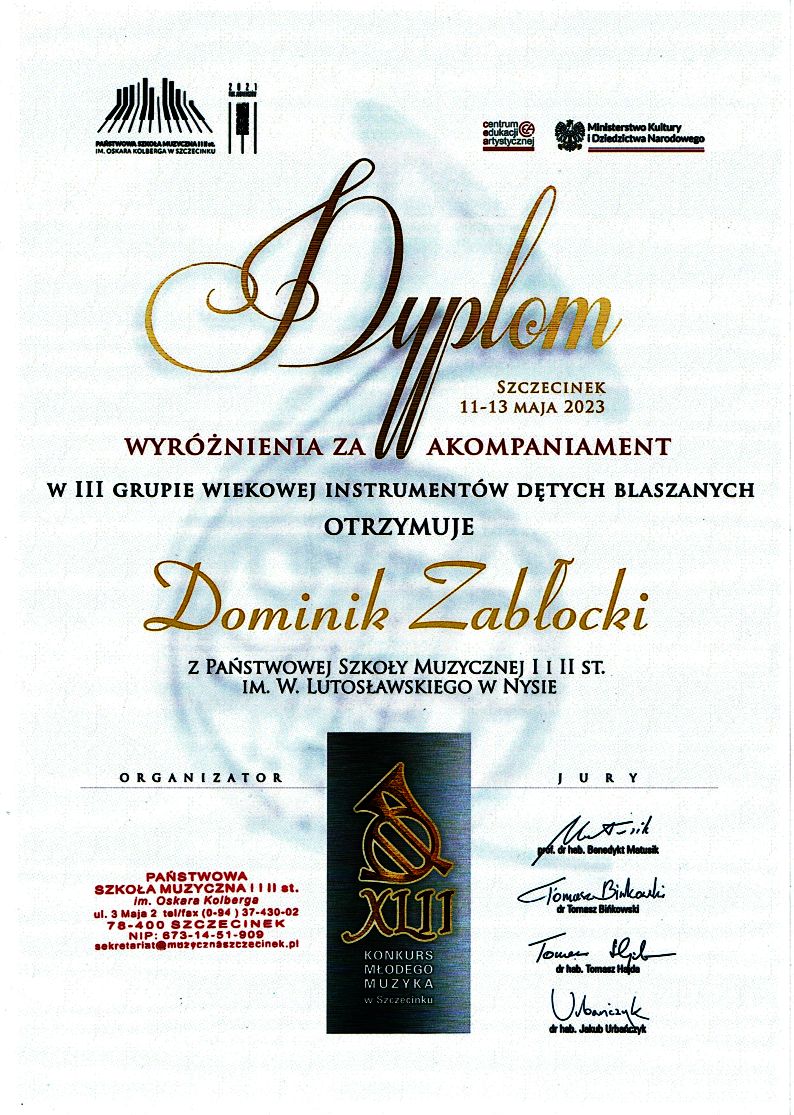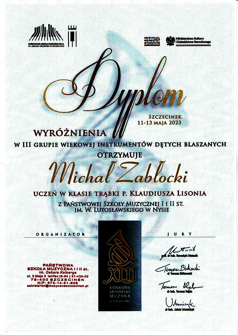 11-13 maja 2023 - Michał Zabłocki wyróżniony w XLII. Konkursie Młodego Muzyka w Szczecinku.