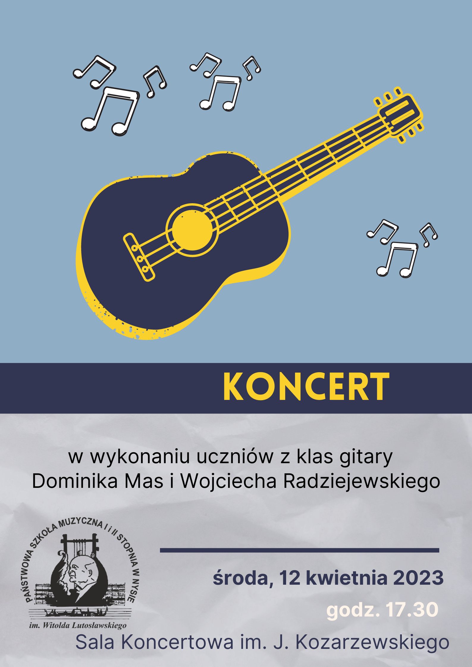 12 kwietnia 2023 - Koncert uczniów z klas gitary Dominika Mas i Wojciecha Radziejewskiego - Sala Koncertowa PSM I i II stopnia w Nysie.