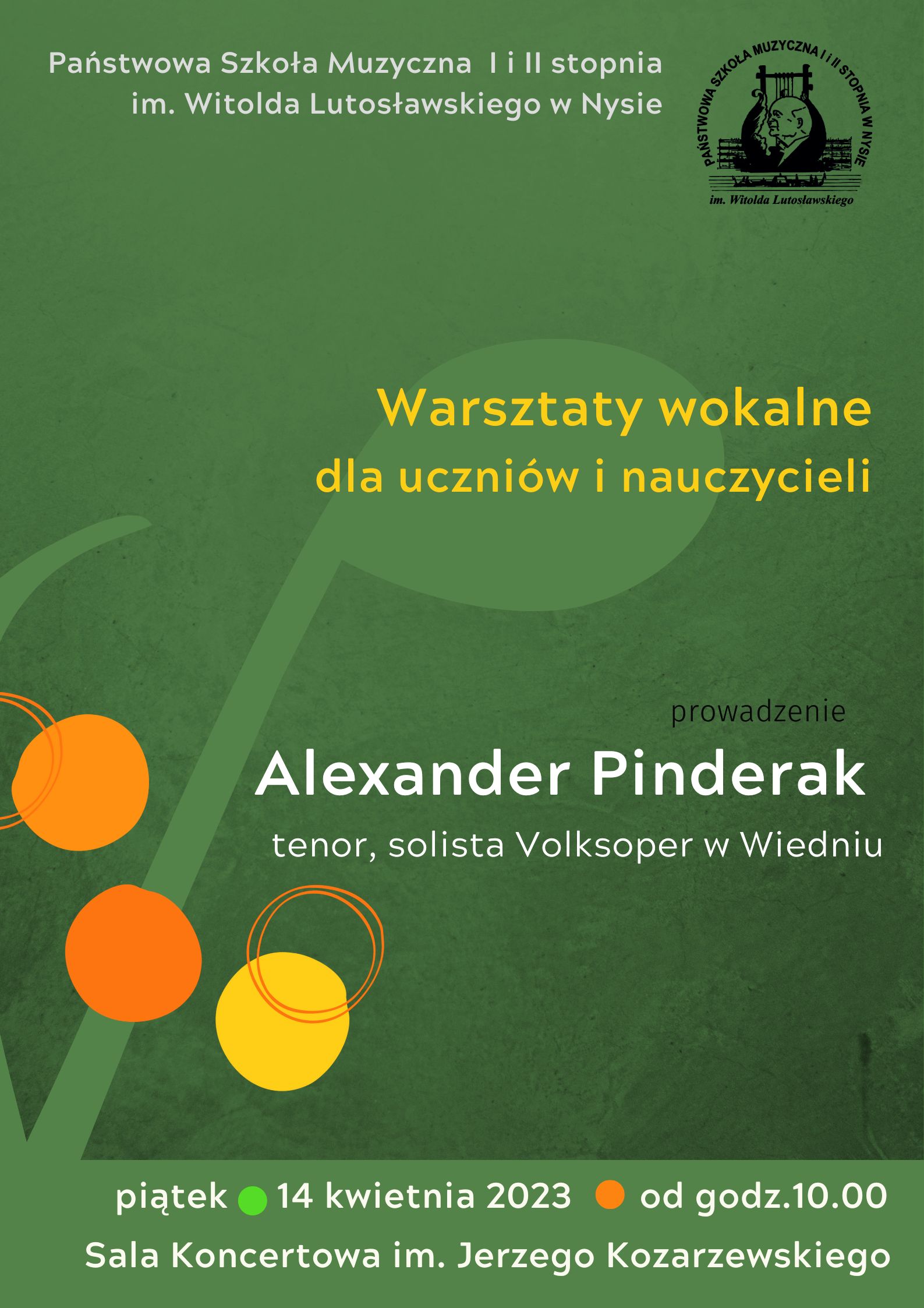 14 kwietnia 2023 - Warsztaty Wokalne dla uczniów i nauczycieli PSM I i II stopnia w Nysie - prowadzący Alexander Pinderak.