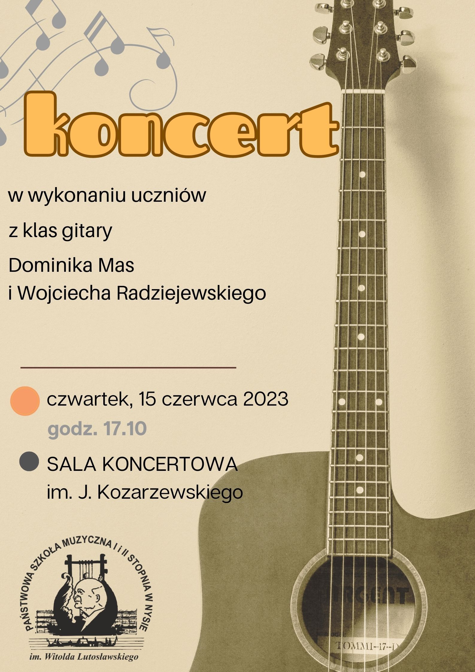 15 czerwca 2023 - Koncert uczniów z klas gitary Dominika Mas i Wojciecha Radziejewskiego - Sala Koncertowa PSM I i II stopnia w Nysie.