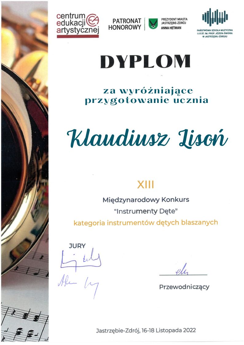 XIII Międzynarodowy Konkurs "Instrumenty Dęte" w Jastrzębiu-Zdroju" - II MIEJSCE w grupie II zdobył MICHAŁ ZABŁOCKI - trąbka