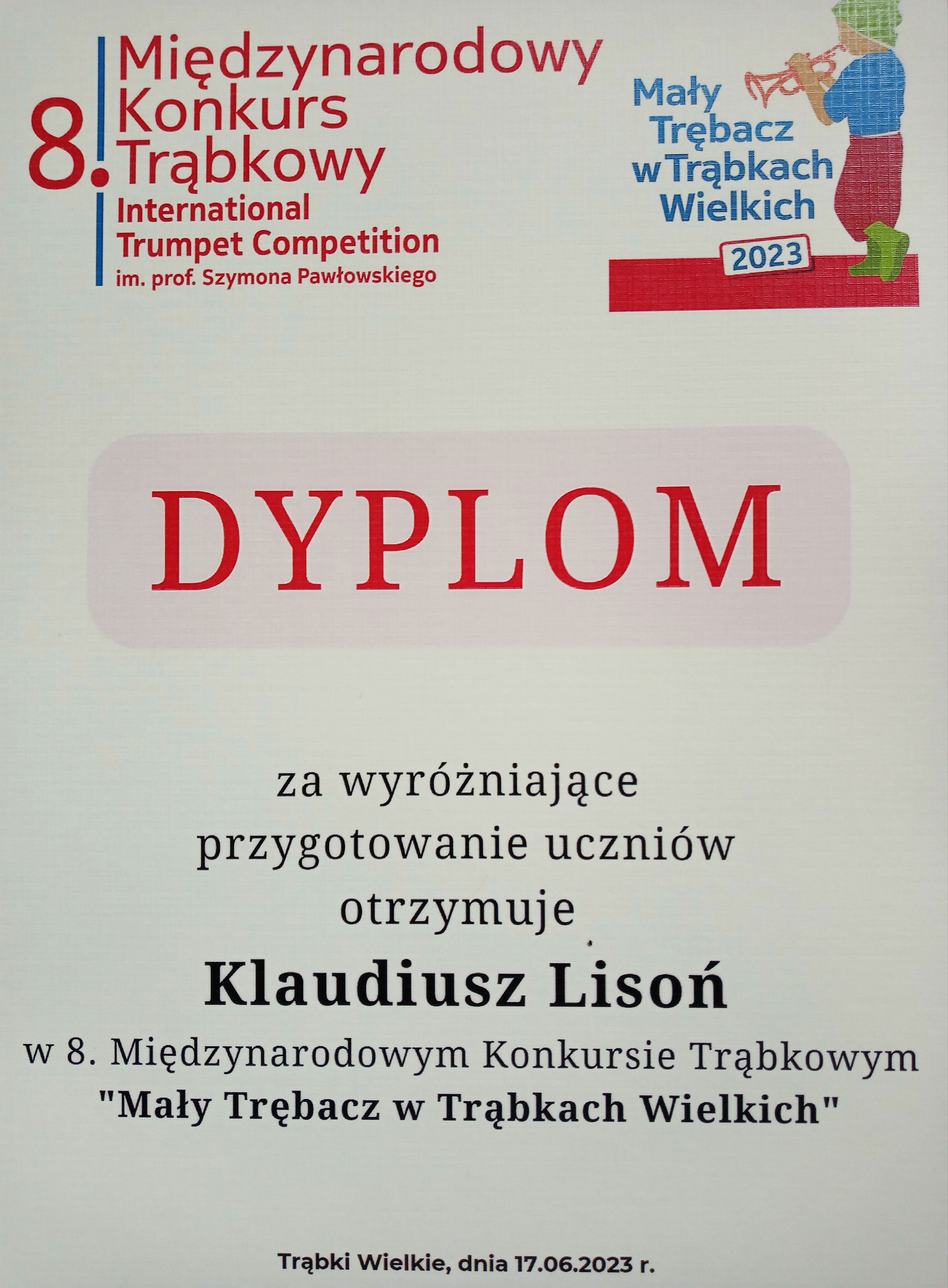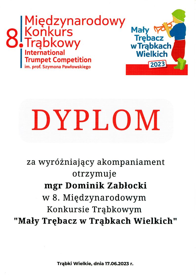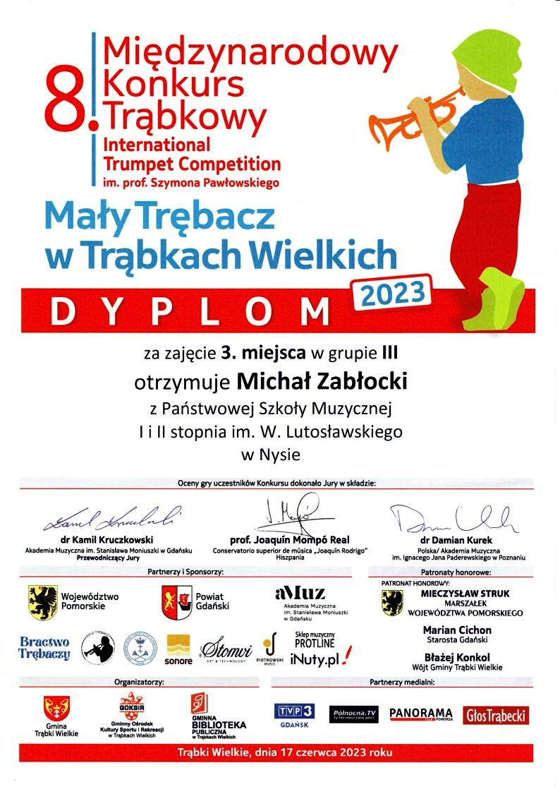 17 czerwca 2023 - Michał Zabłocki zdobył III miejsce w 8. Międzynarodowym Konkursie Trąbkowym "Mały Trębacz w Trąbkach Wielkich".