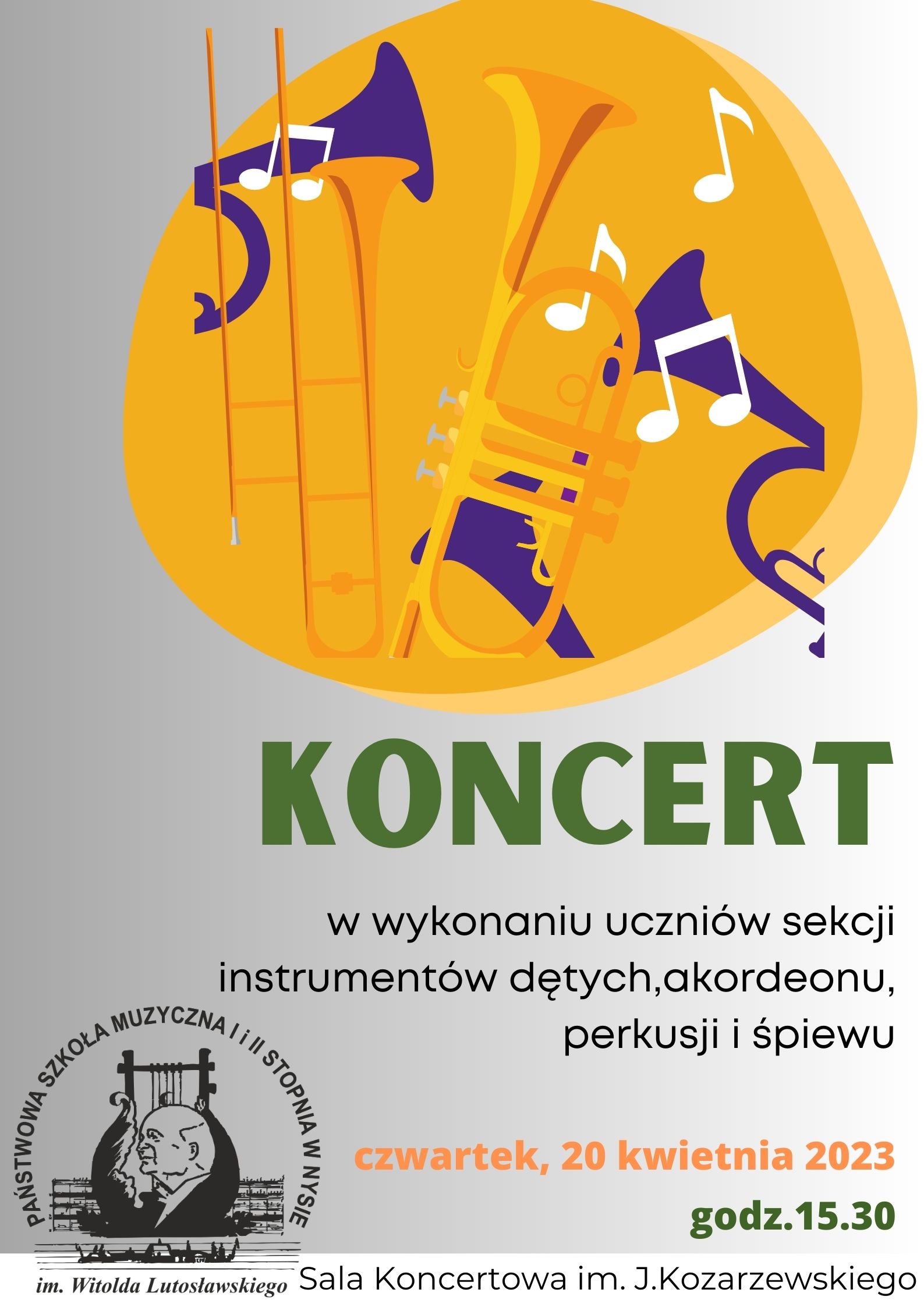 20 kwietnia 2023 - Koncert w wykonaniu uczniów sekcji instrumentów dętych, perkusji, akordeonu i śpiewu - Sala Koncertowa PSM I i II stopnia w Nysie.