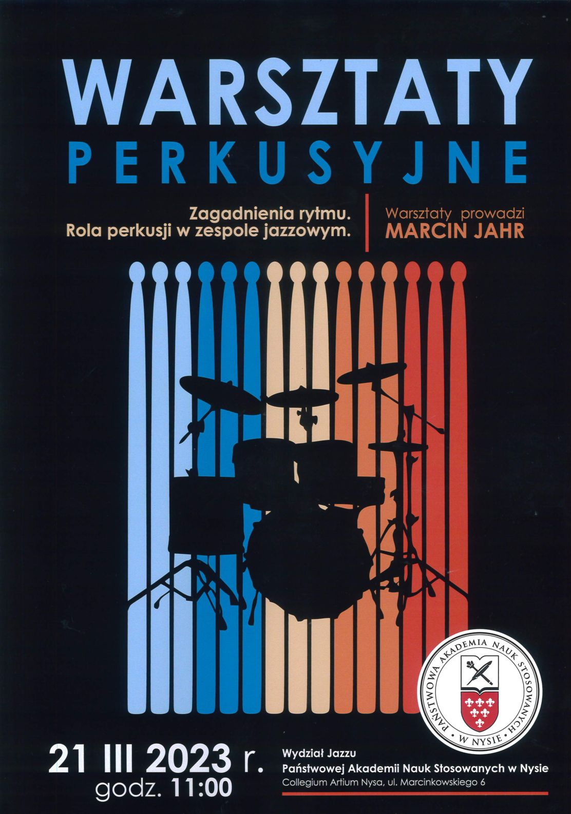 21 marca 2023 - Warsztaty Perkusyjne (jazzowe) - Marcin Jahr. Państwowa Akademia Nauk Stosowanych gościnnie w Sali Koncertowej PSM I i II stopnia w Nysie.