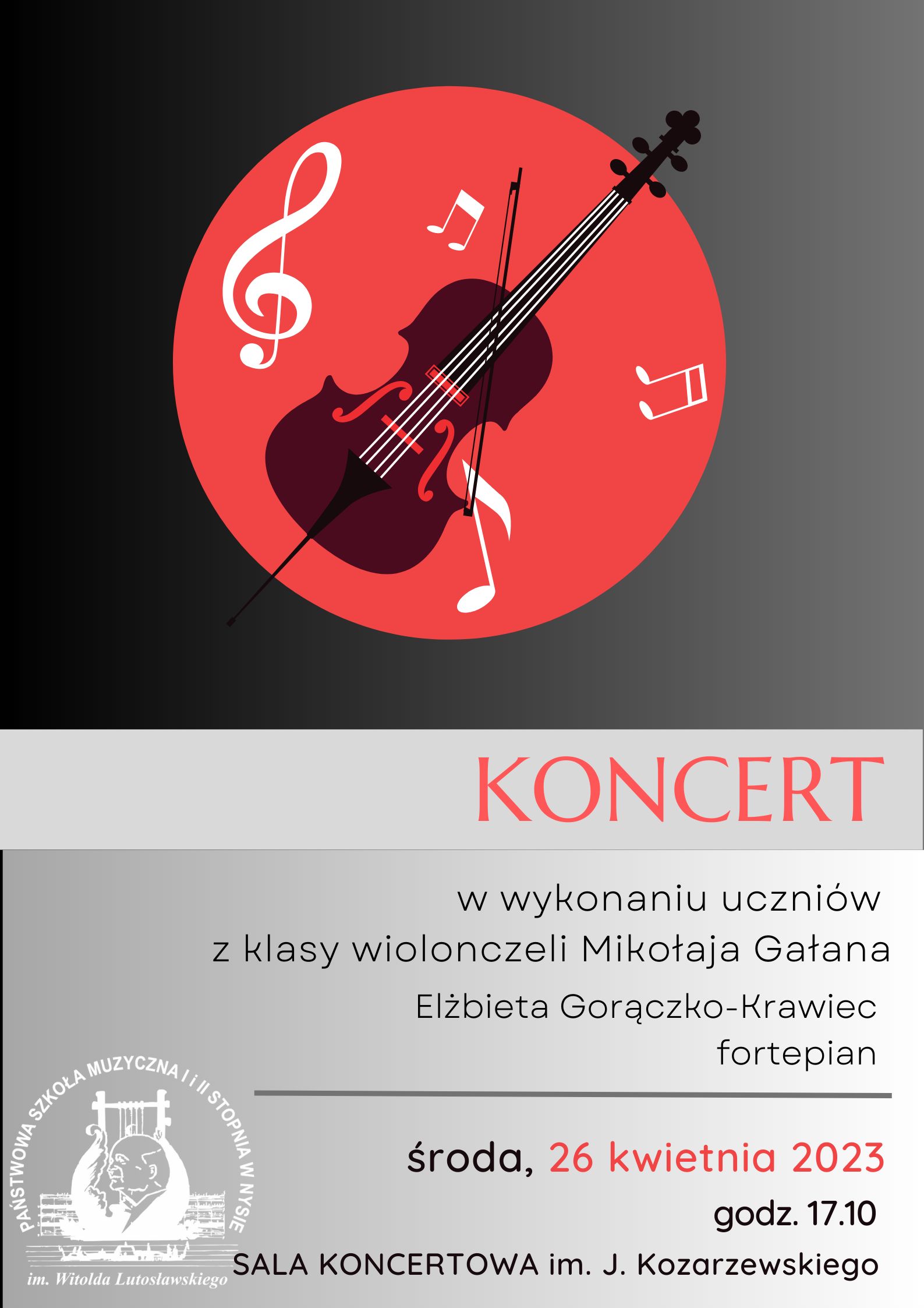 26 kwietnia 2023 - Koncert w wykonaniu uczniów z klasy wiolonczeli Mikołaja Gałana - Sala Koncertowa