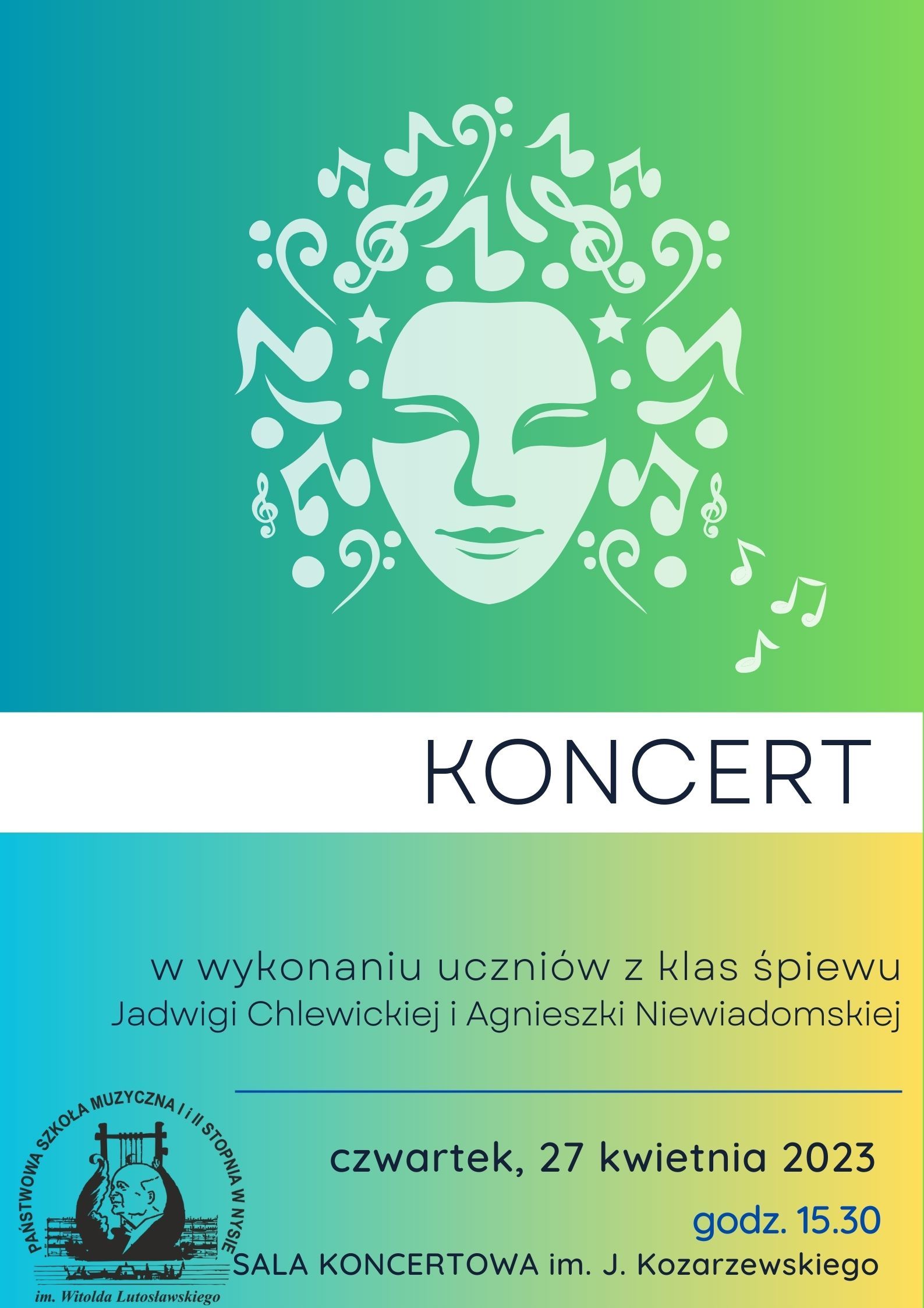 Grafika - afisz. Tło zielone z białym paskiem w środku. Na górze grafika - twarz we włosach na które składają się symbole muzyczne - nutki i klucze. Na białym pasku napis: KONCERT. W dolnej części napisy: w wykonaniu uczniów z klas śpiewu Jadwigi Chlewickiej i Agnieszki Niewiadomskiej czwarte, 27 kwietnia 2023 godz. 15.30 Sala Koncertowa im. Jerzego Kozarzewskiego. W lewym dolnym rodu logo PSM Nysa.