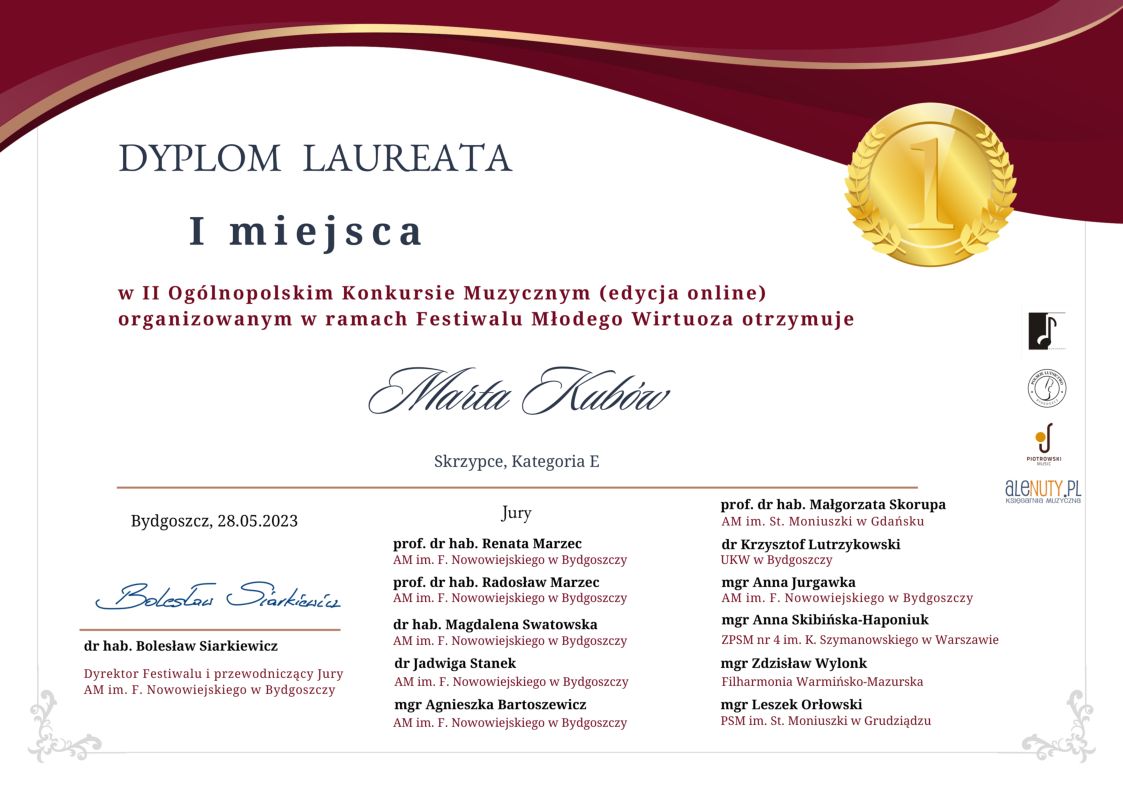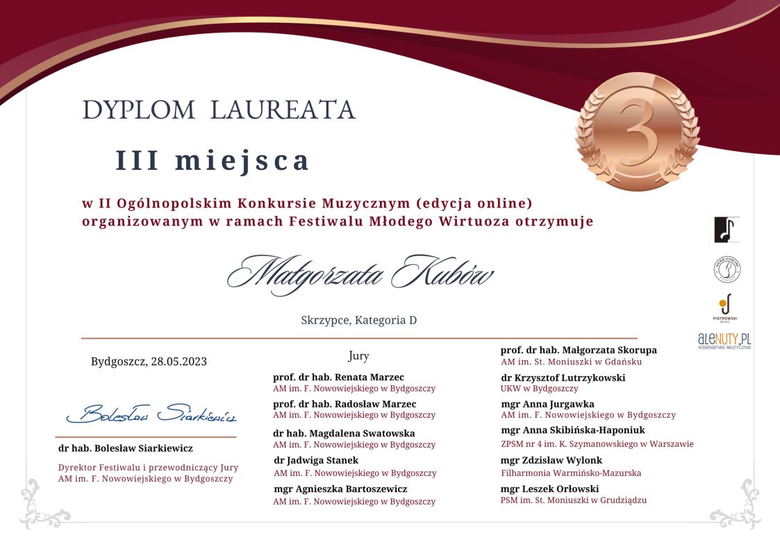 zdobyła MAŁGORZATA KUBÓW - skrzypce