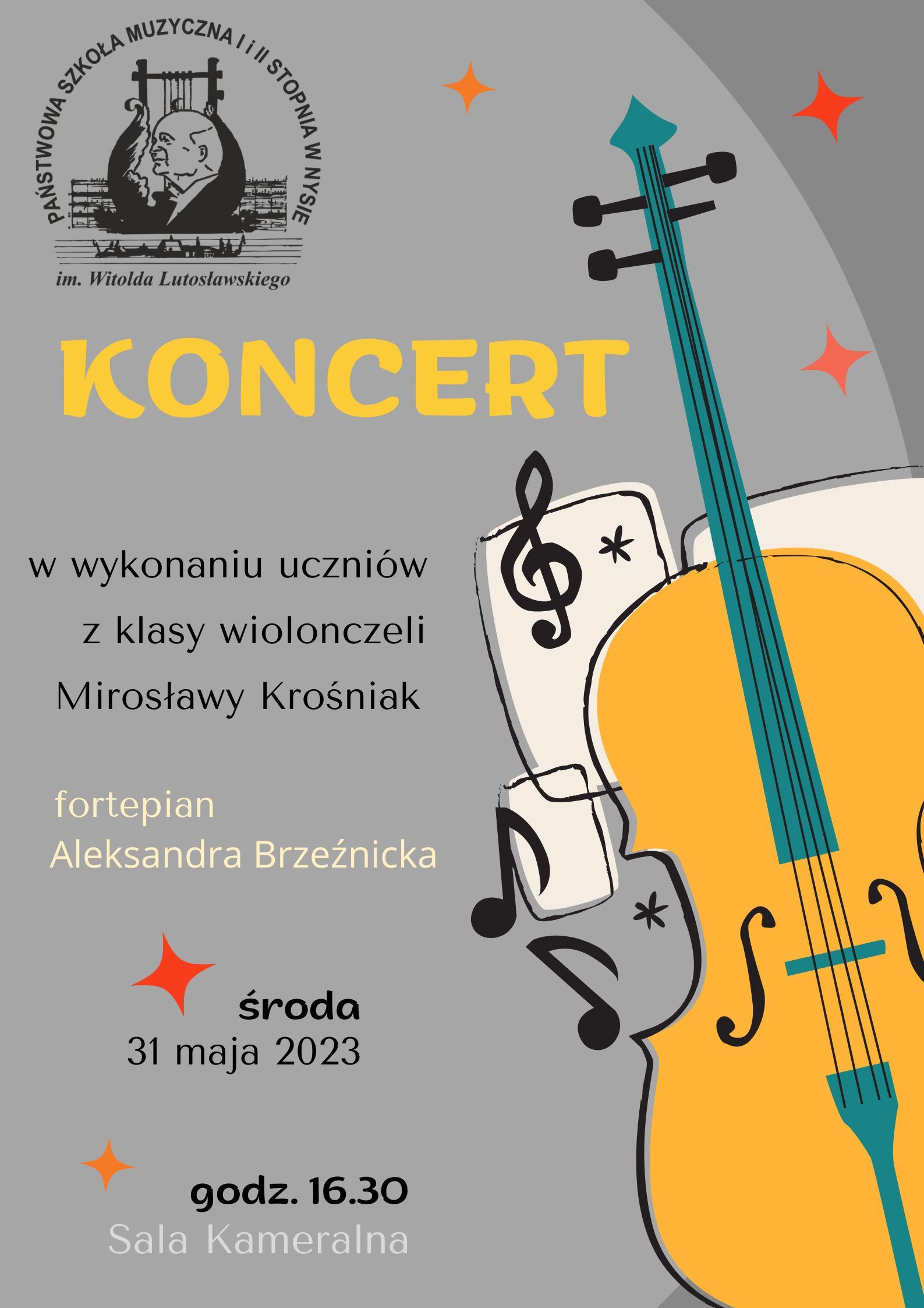 31 maja 2023 - Koncert w wykonaniu uczniów z klasy wiolonczeli Mirosławy Krośniak - Sala Kameralna PSM I i II stopnia w Nysie.