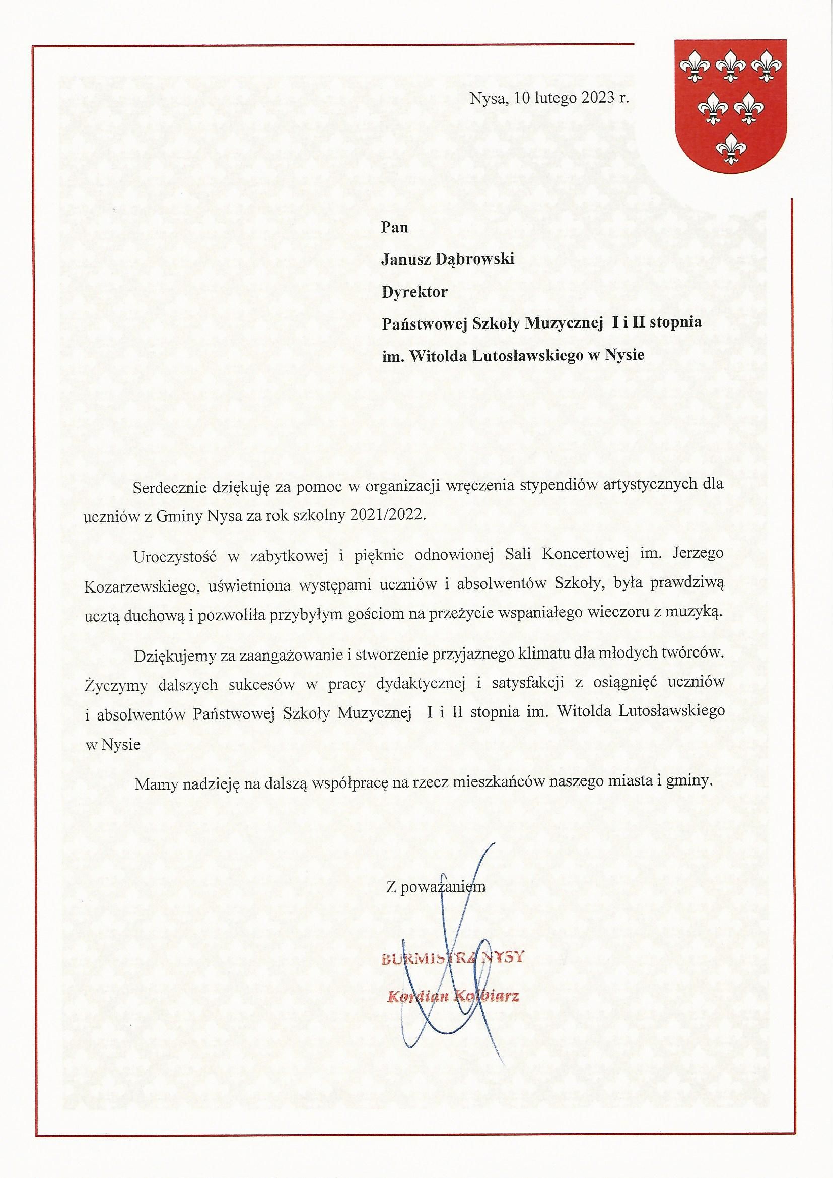 8 lutego 2023 - Uroczyste wręczenie stypendiów artystycznych Burmistrza Nysy - Sala Koncertowa PSM I i II stopnia w Nysie.