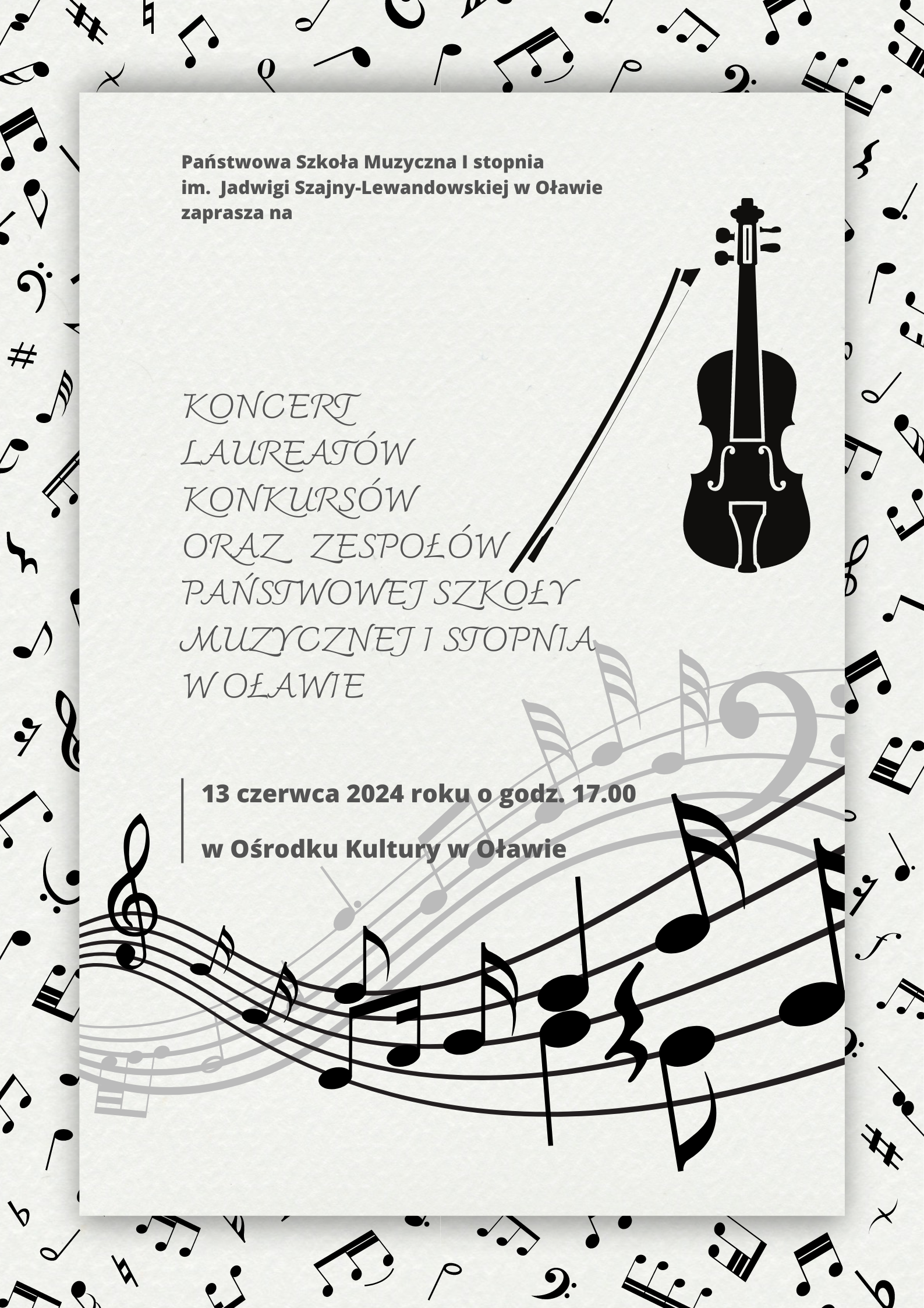 13 czerwca 2024 r. o godz. 17.00 zapraszamy do Ośrodka Kultury w Oławie na Koncert Laureatów Konkursów oraz Zespołów PSM I stopnia w Oławie.