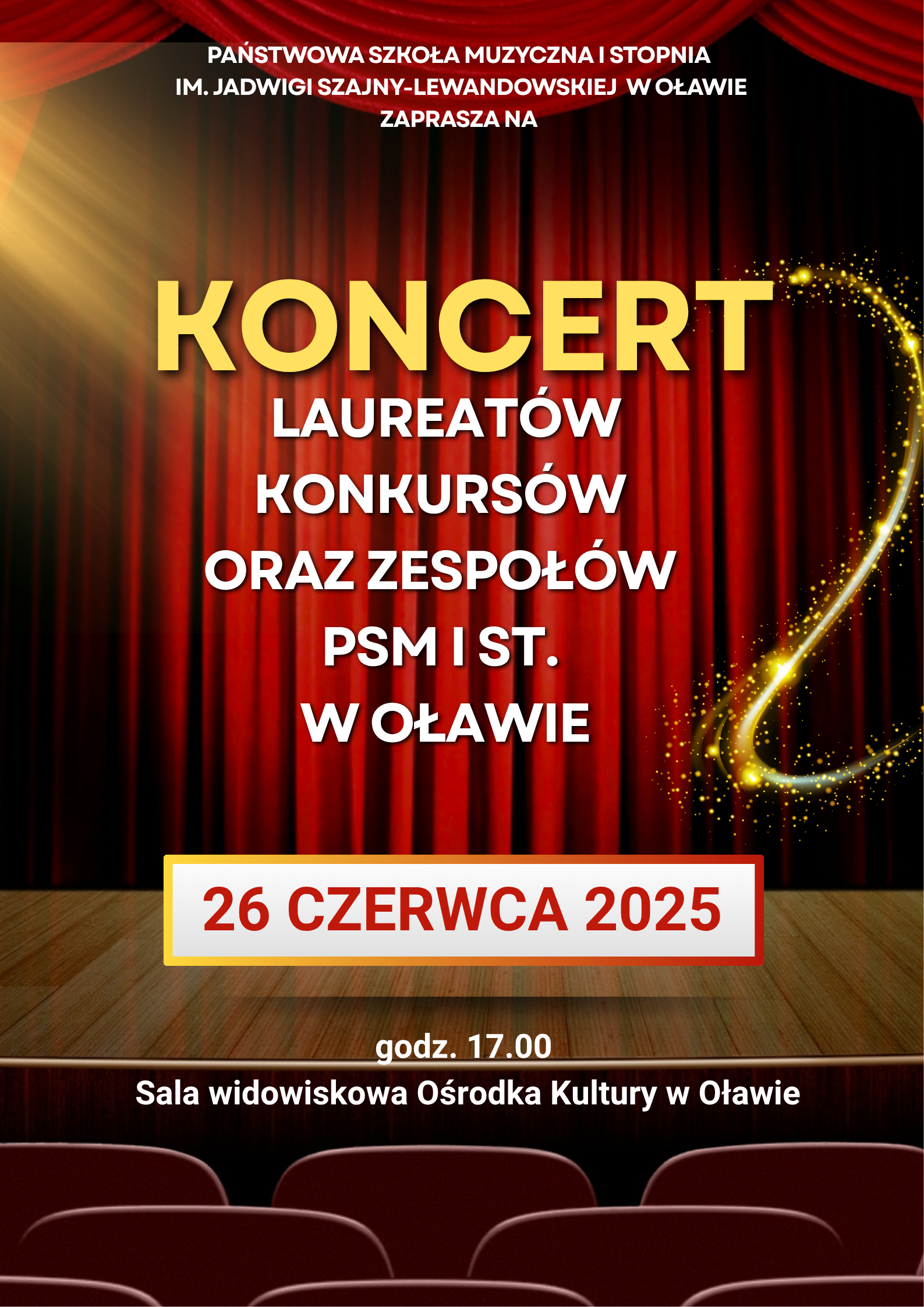Zapraszamy na Koncert Laureatów Konkursów oraz Zespołów PSM I st. w Oławie - 26.06.2025 r.