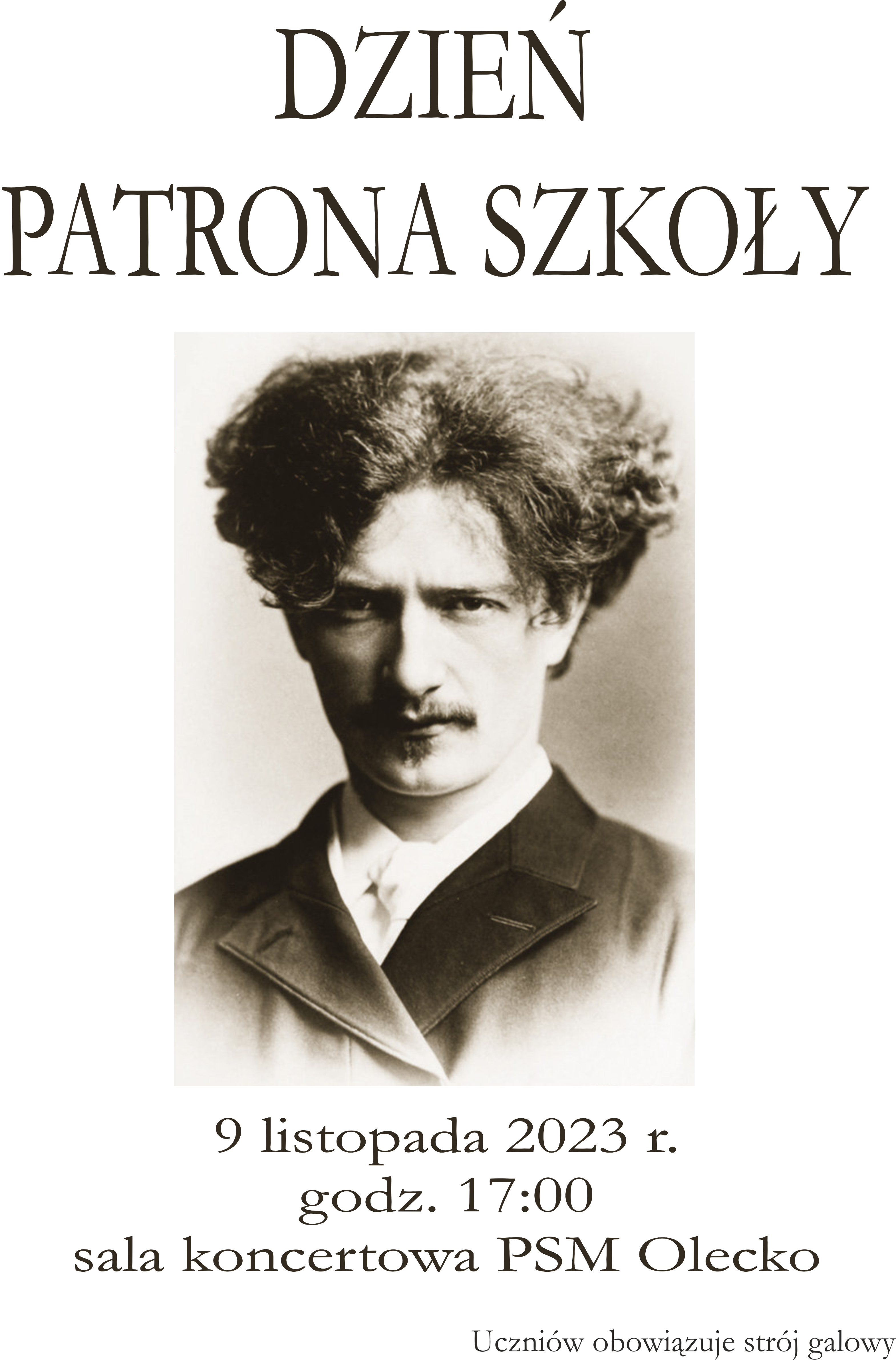 Państwowa Szkoła Muzyczna I stopnia im. Ignacego Jana Paderewskiego w Olecku zaprasza na Dzień Patrona Szkoły, który odbędzie się 9 listopada 2023 r. o godz. 17.00 w sali koncertowej PSM Olecko.