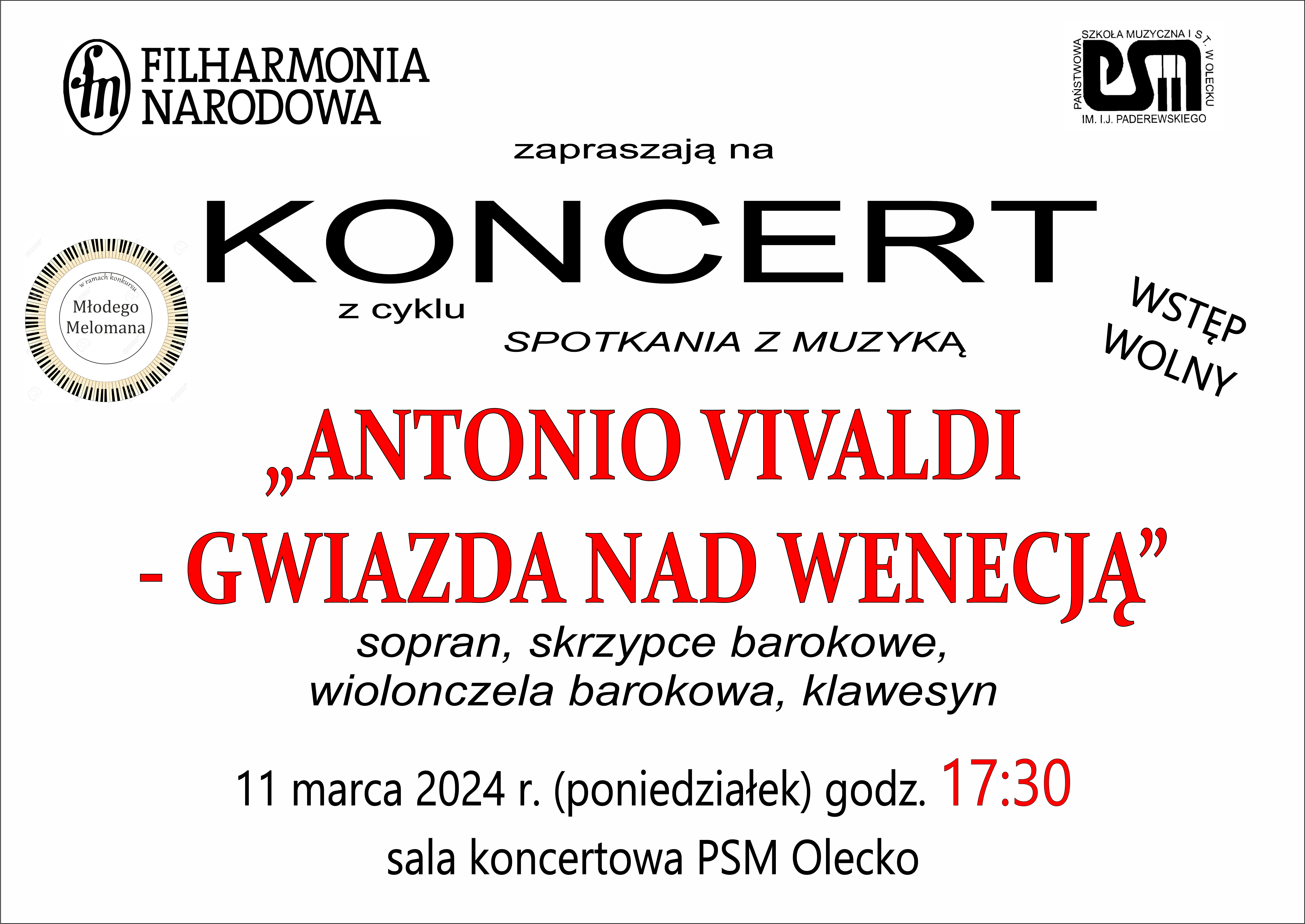 Państwowa Szkoła Muzyczna I st. im. Ignacego Jana Paderewskiego w Olecku zaprasza na koncert Filharmonii Narodowej: "Antonio Vivaldi - gwiazda nad Wenecją" dnia 11 marca 2024 r. o godz. 17.30 w sali koncertowej PSM Olecko.
