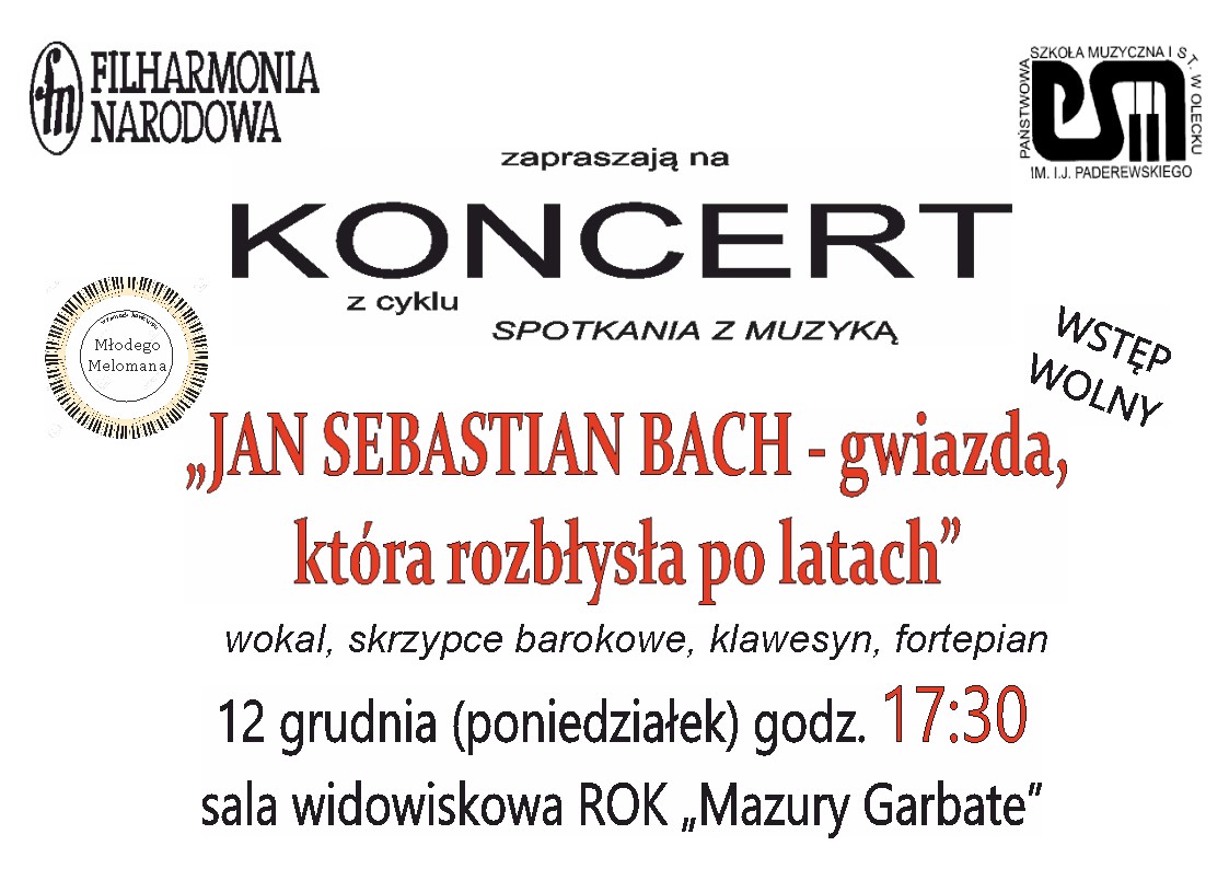 Państwowa Szkoła Muzyczna I st. im. Ignacego Jana Paderewskiego w Olecku zaprasza na koncert Filharmonii Narodowej: "Jan Sebastian Bach - gwiazda, która rozbłysła po latach" dnia 12 grudnia 2022 r. o godz. 17.30 w sali widokowej ROK "Mazury Garbate".