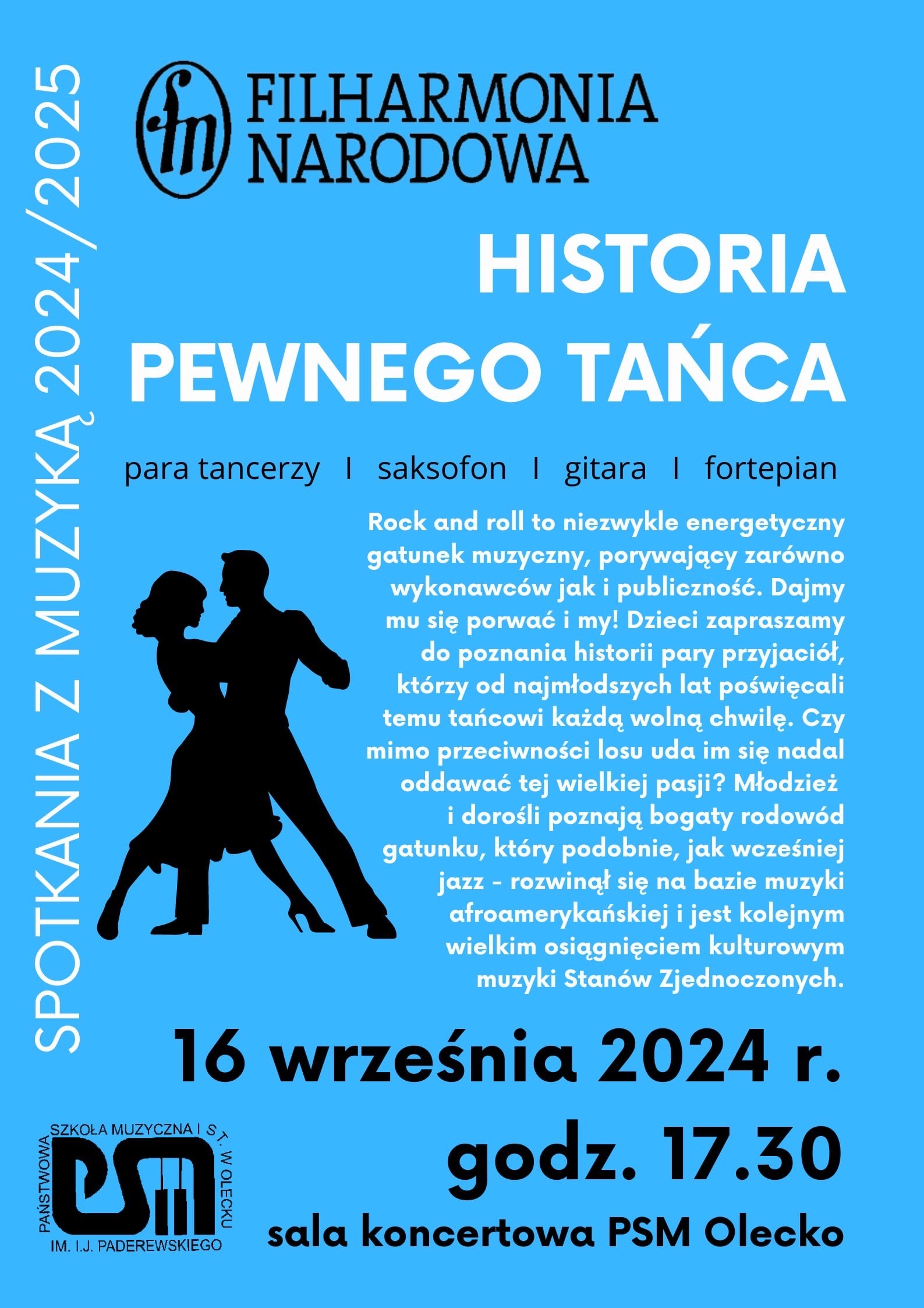 Państwowa Szkoła Muzyczna I st. im. Ignacego Jana Paderewskiego w Olecku zaprasza na koncert Filharmonii Narodowej: "Historia pewnego tańca" dnia 16 września 2024 r. o godz. 17.30 w sali koncertowej PSM Olecko.