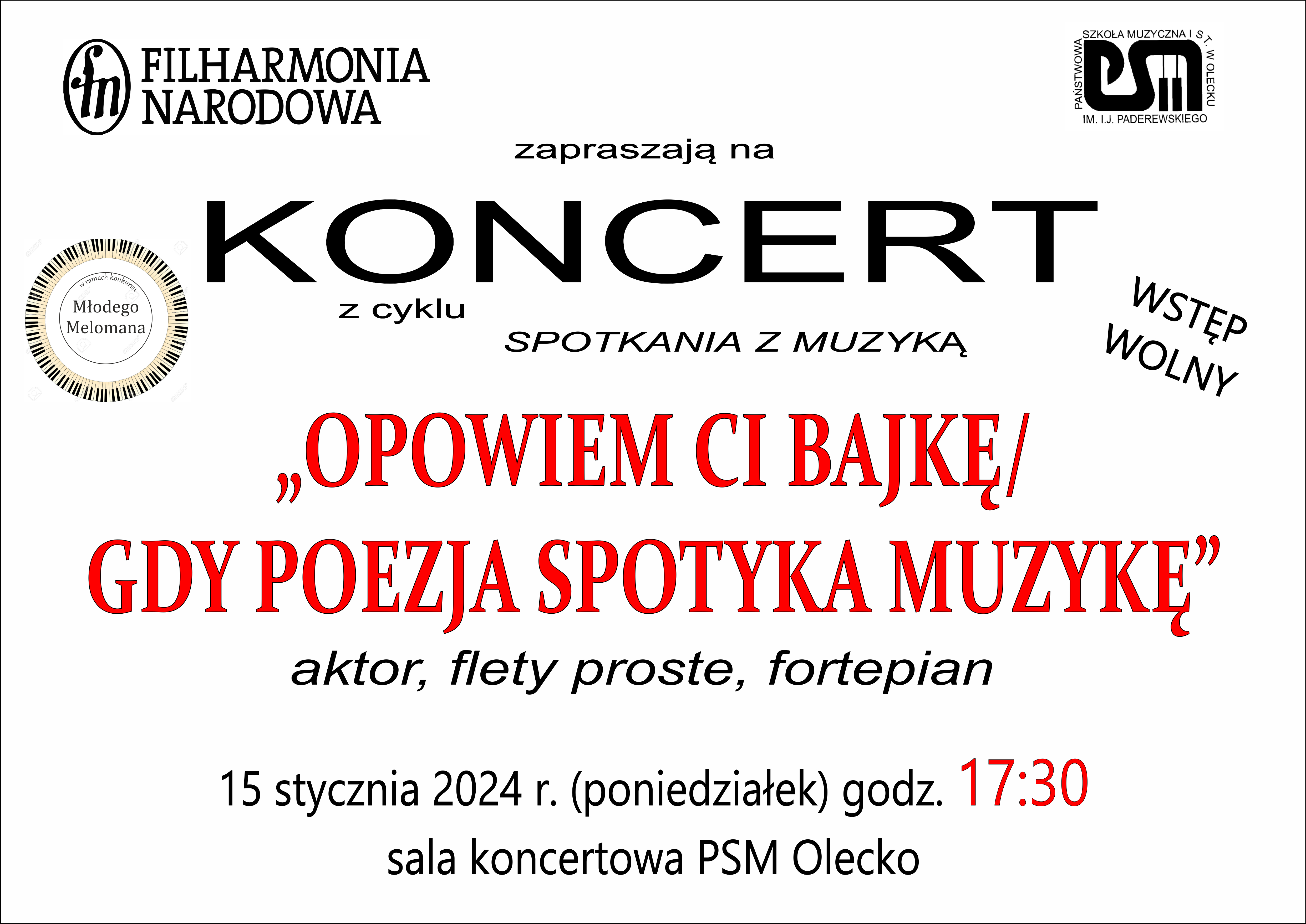 Państwowa Szkoła Muzyczna I st. im. Ignacego Jana Paderewskiego w Olecku zaprasza na koncert Filharmonii Narodowej: "Opowiem Ci bajkę/Gdy poezja spotyka muzykę" dnia 15 stycznia 2024 r. o godz. 17.30 w sali koncertowej PSM Olecko.