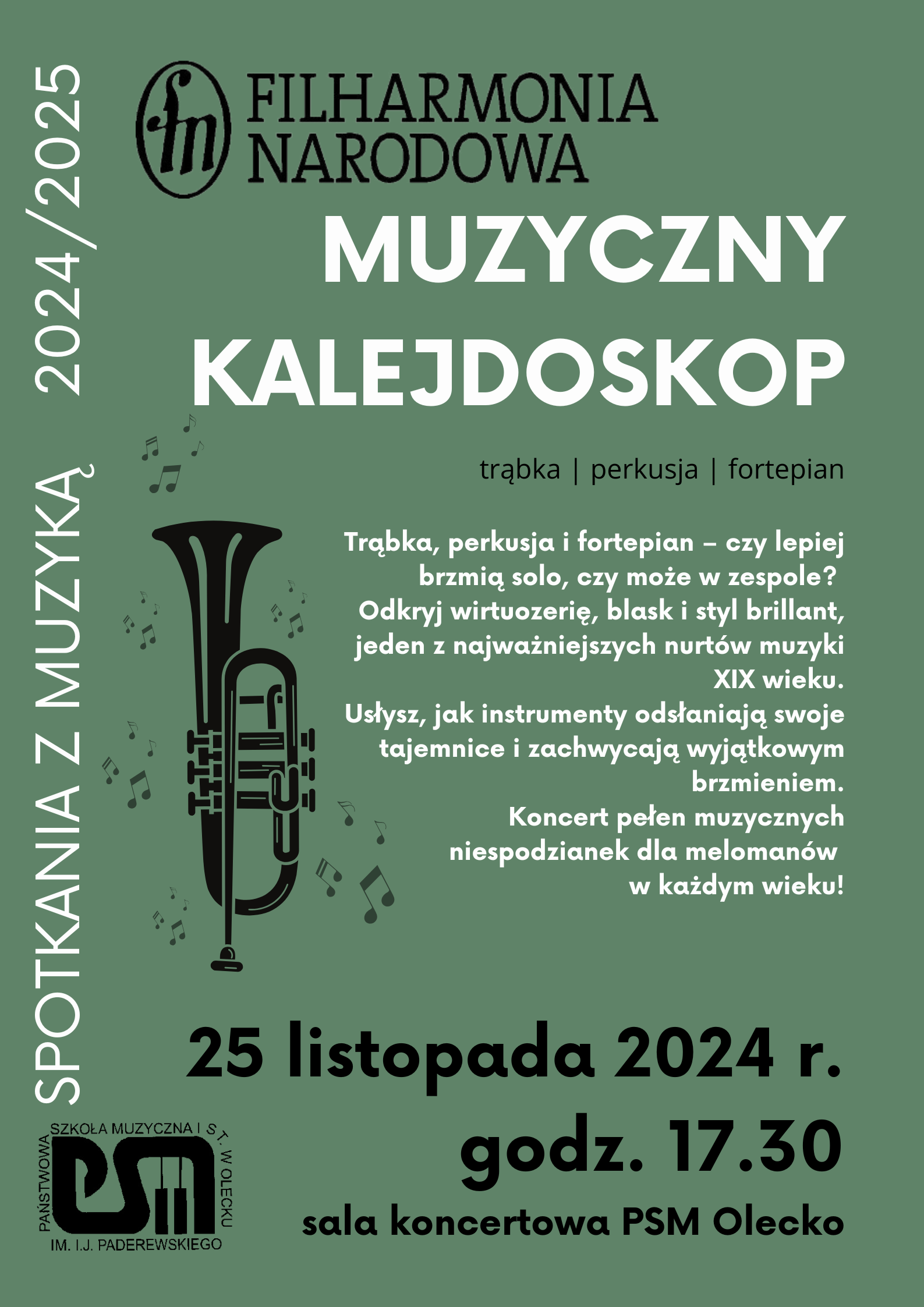 Państwowa Szkoła Muzyczna I st. im. Ignacego Jana Paderewskiego w Olecku zaprasza na koncert Filharmonii Narodowej: "MUZYCZNY KALEJDOSKOP " dnia 25 listopada 2024 r. o godz. 17.30 w sali koncertowej PSM Olecko.