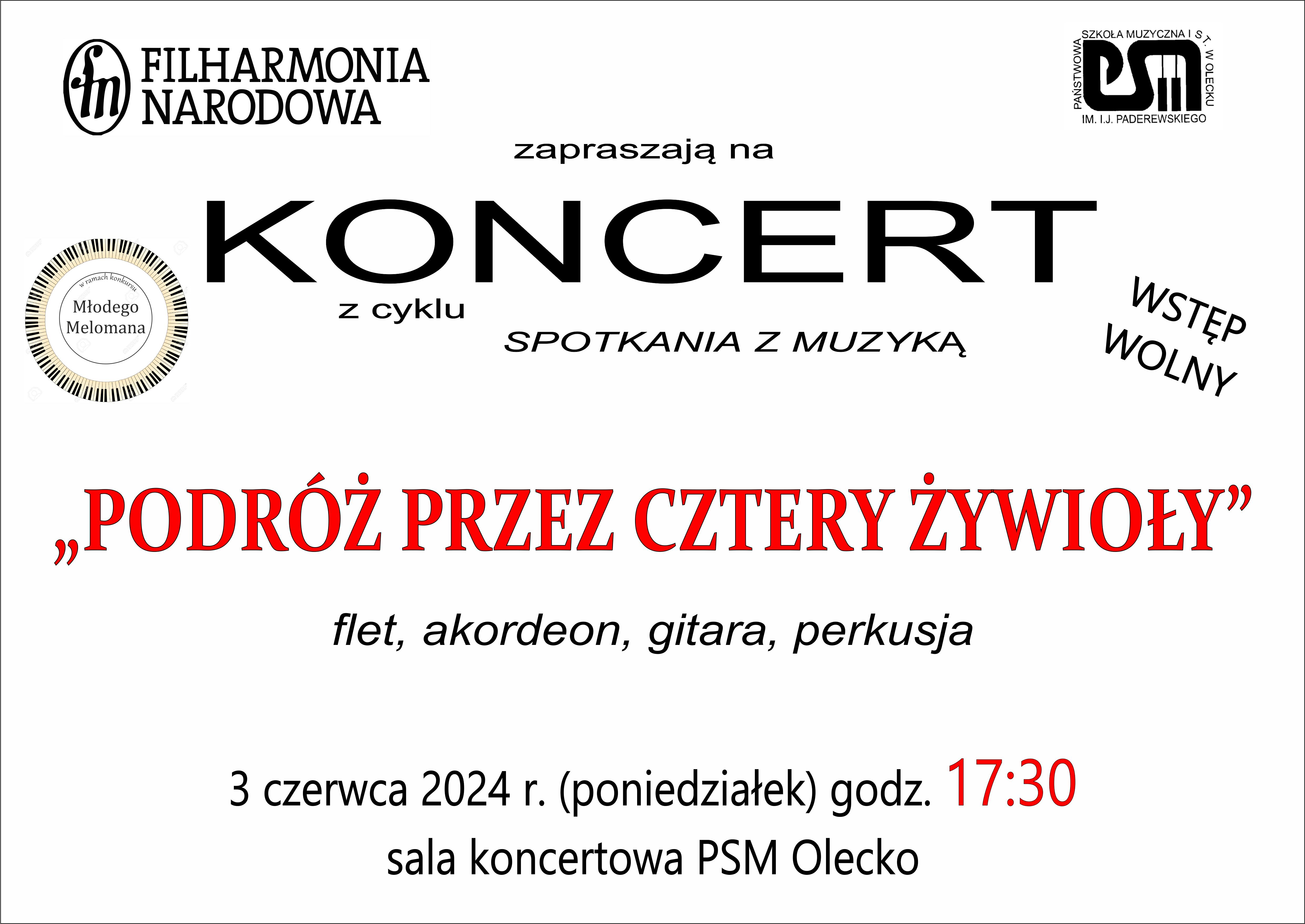 Państwowa Szkoła Muzyczna I st. im. Ignacego Jana Paderewskiego w Olecku zaprasza na koncert Filharmonii Narodowej: "Podróż przez cztery żywioły" dnia 3 czerwca 2024 r. o godz. 17.30 w sali koncertowej PSM Olecko.