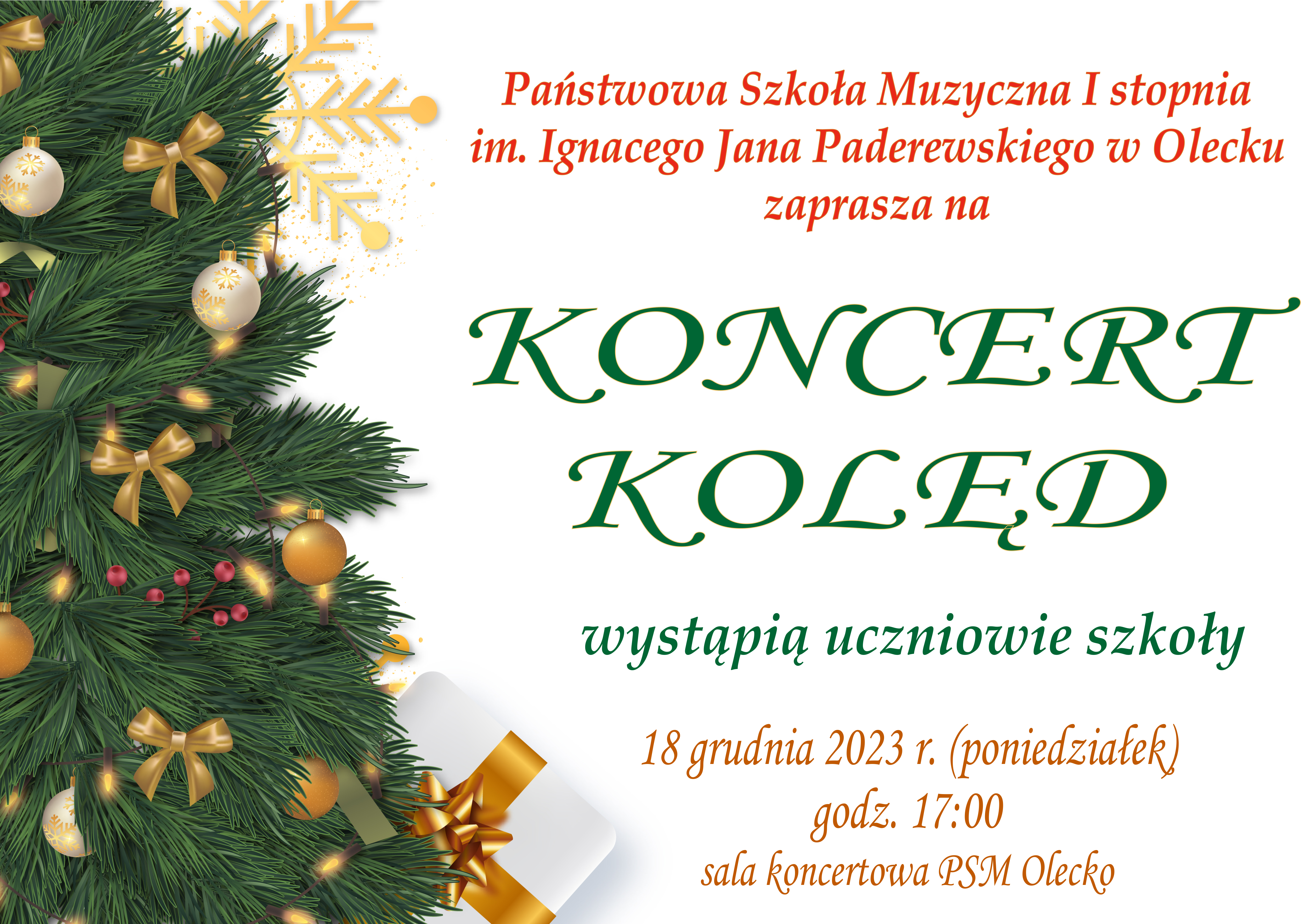 Państwowa Szkoła Muzyczna I stopnia im. Ignacego Jana Paderewskiego w Olecku zaprasza na koncert kolęd, który odbędzie się 18 grudnia 2023 r. o godz. 17.00 w sali koncertowej PSM Olecko.