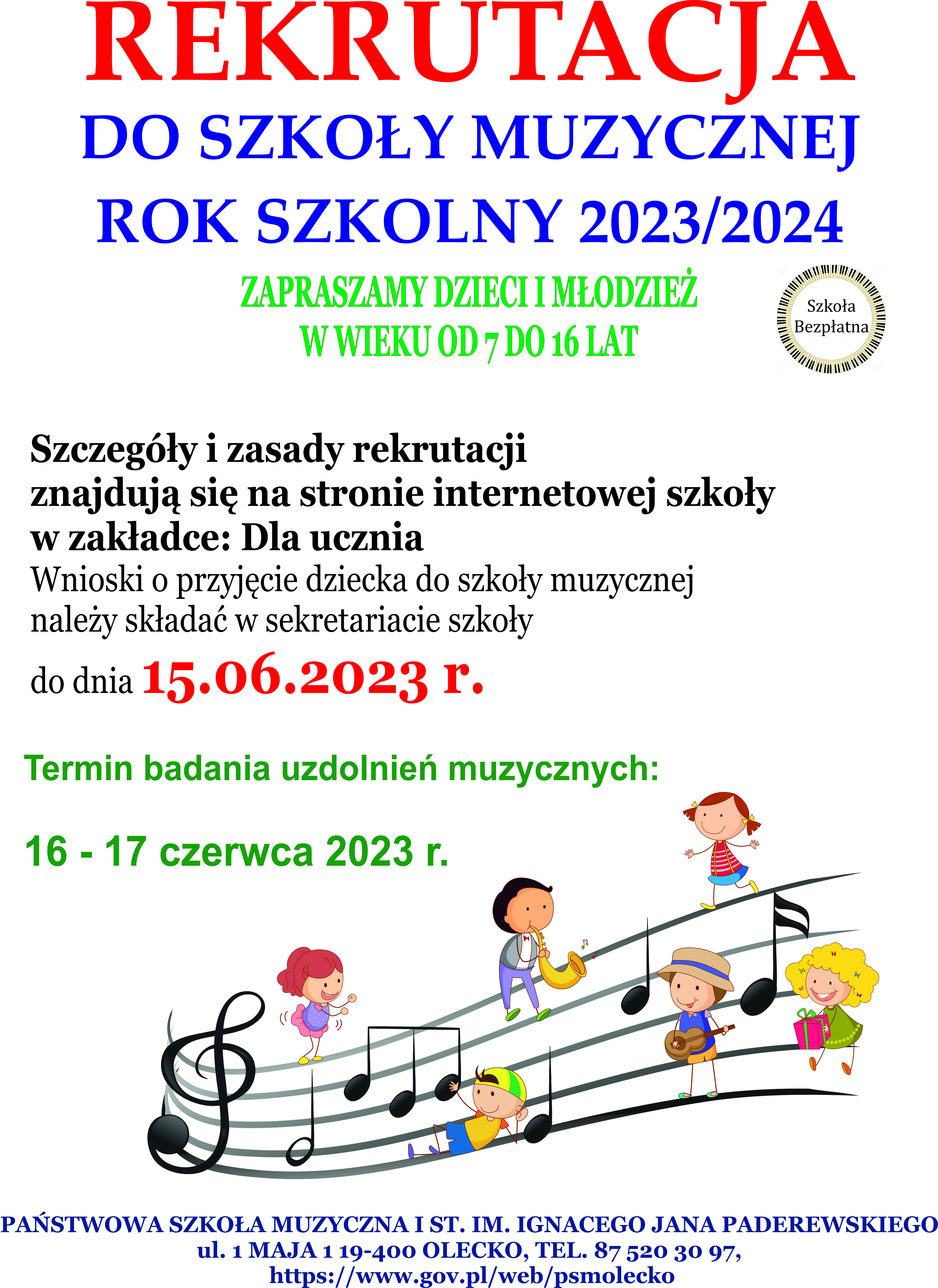 Państwowa Szkoła Muzyczna I stopnia im. Ignacego Jana Paderewskiego w Olecku prowadzi rekrutację: