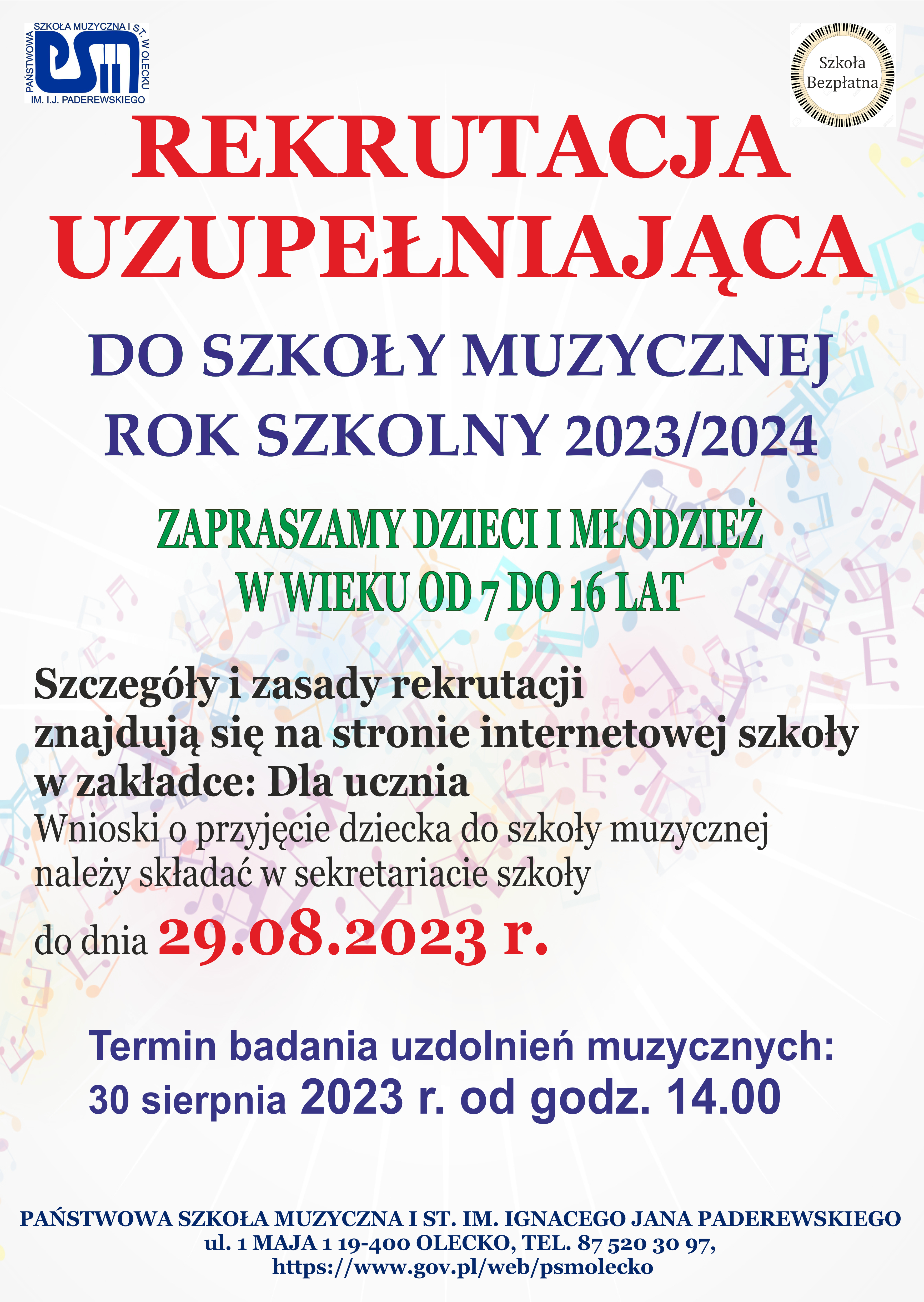 Państwowa Szkoła Muzyczna I stopnia im. Ignacego Jana Paderewskiego w Olecku prowadzi rekrutację:
