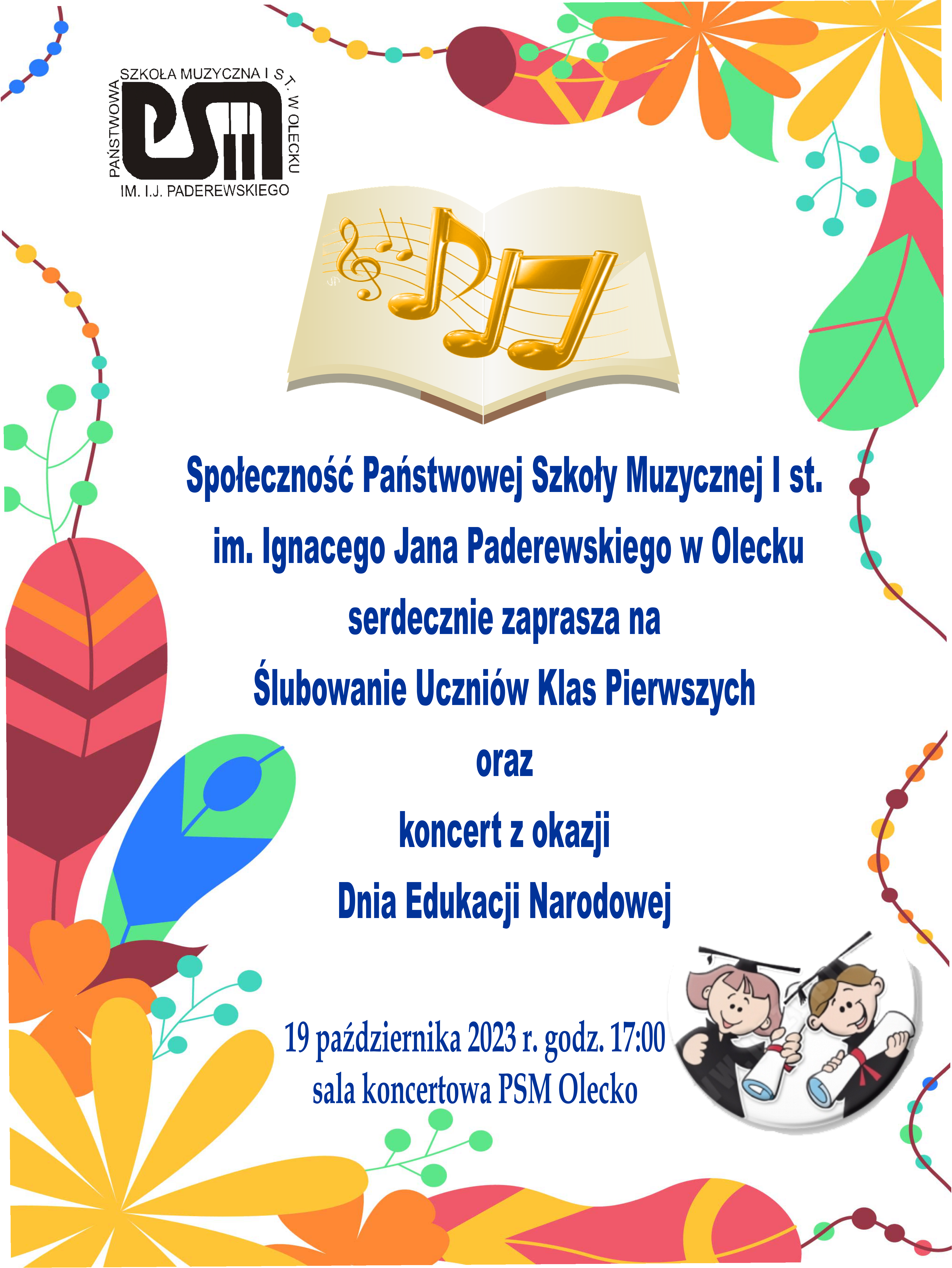 Państwowa Szkoła Muzyczna I stopnia im. Ignacego Jana Paderewskiego w Olecku serdecznie zaprasza na ślubowanie uczniów klas pierwszych oraz koncert z okazji Dnia Edukacji Narodowej, które odbędą się dnia 19 października 2023 r. o godz. 17.00 w sali koncertowej PSM Olecko.