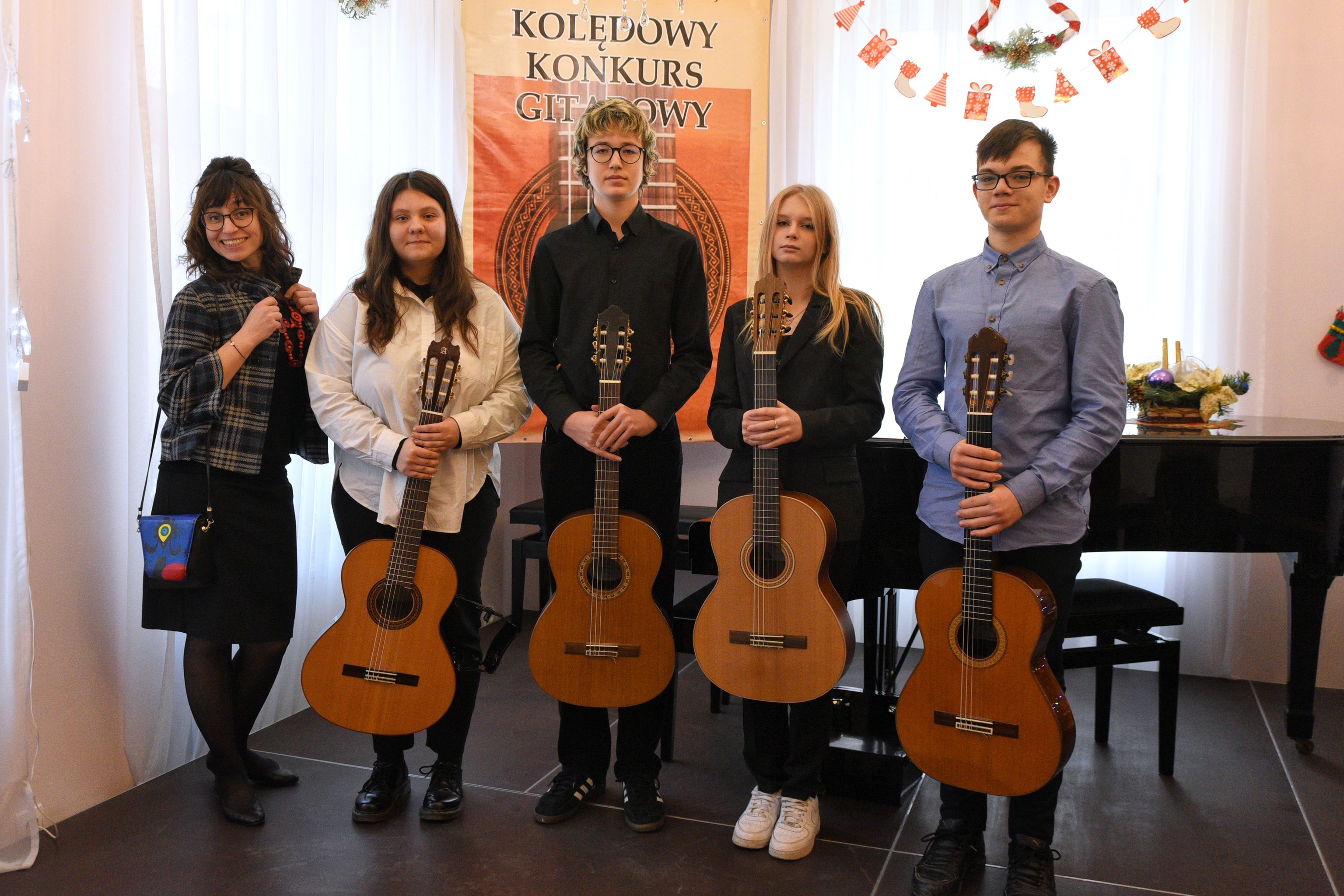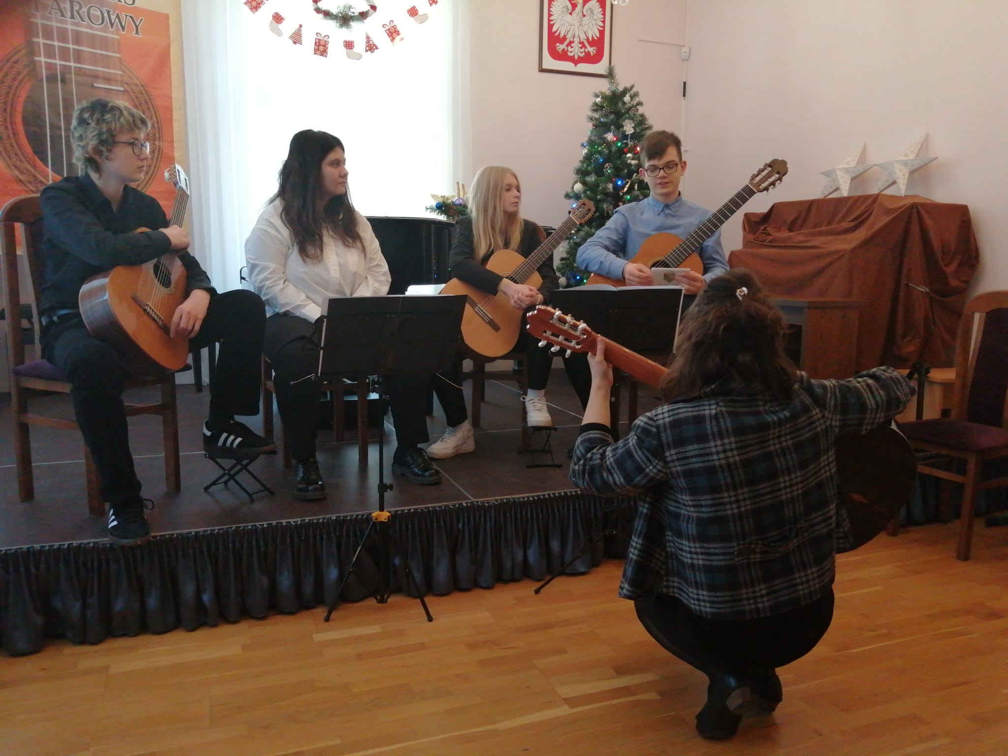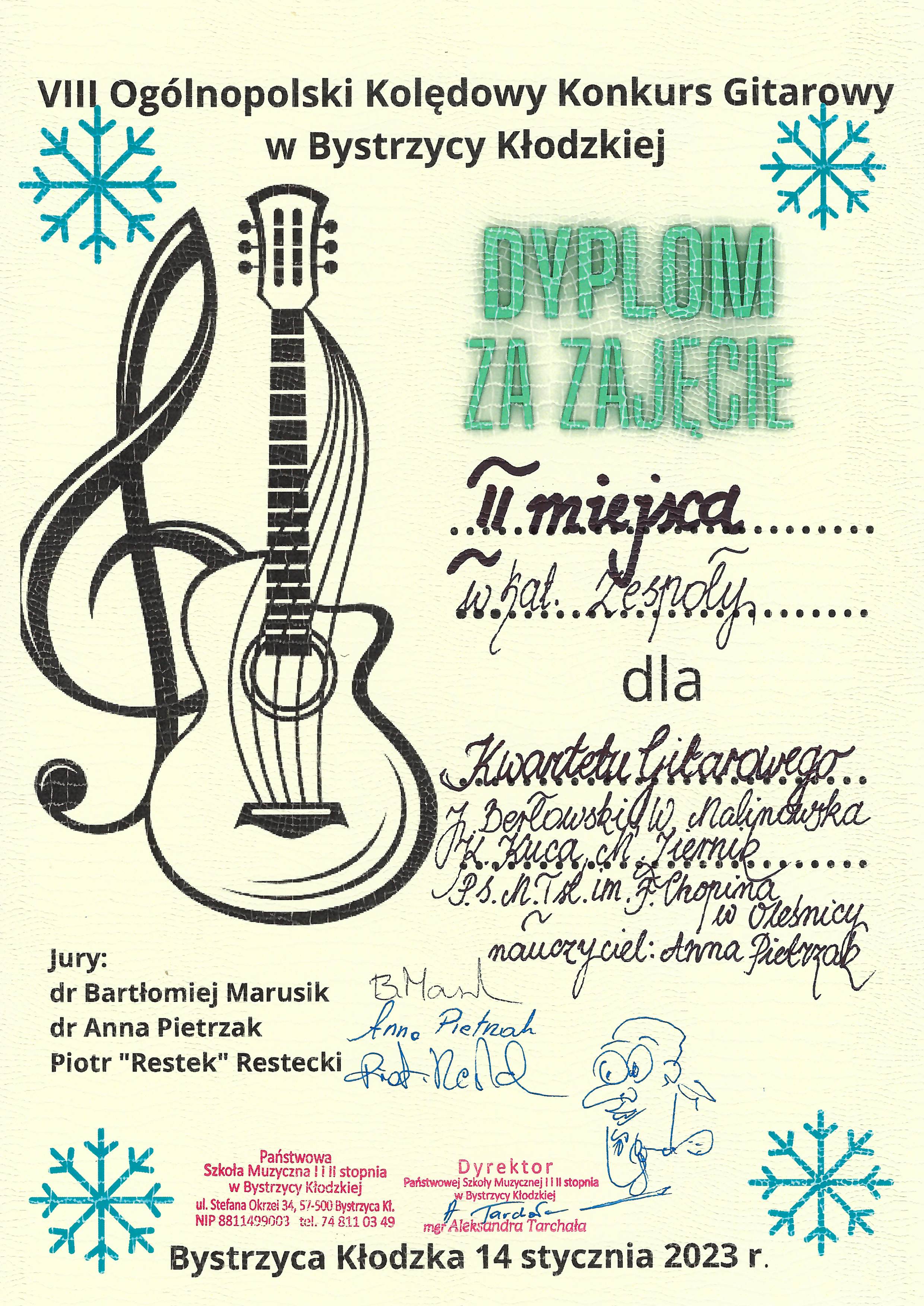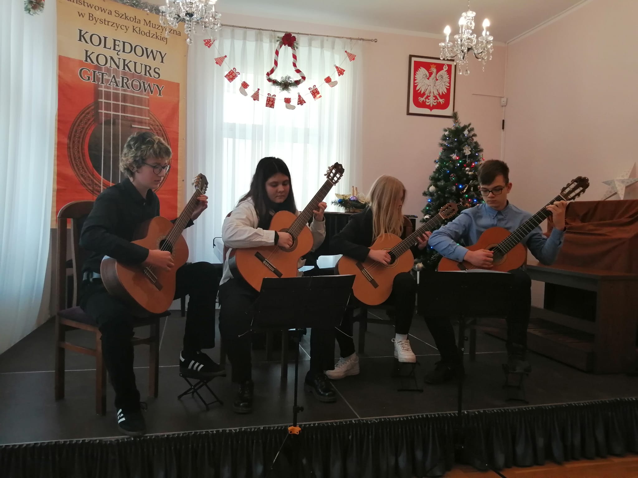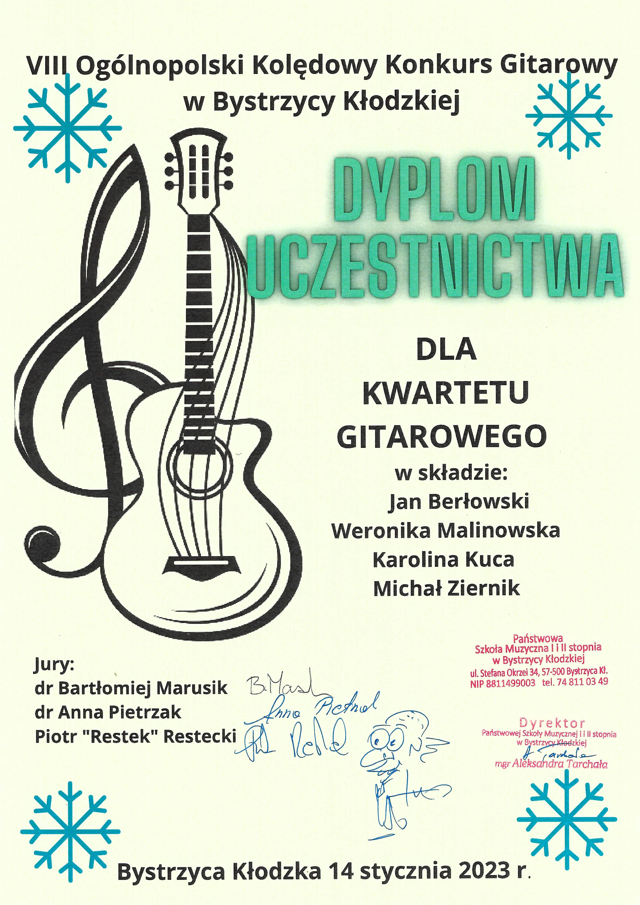 Kwartet gitarowy w składzie: Jan Berłowski, Weronika Malinowska, Karolina Kuca i Michał Ziernik z klasy gitary pani Anny Pietrzak zajął II miejsce w kategorii zespoły w VIII Ogólnopolskim Kolędowym Konkursie Gitarowym!