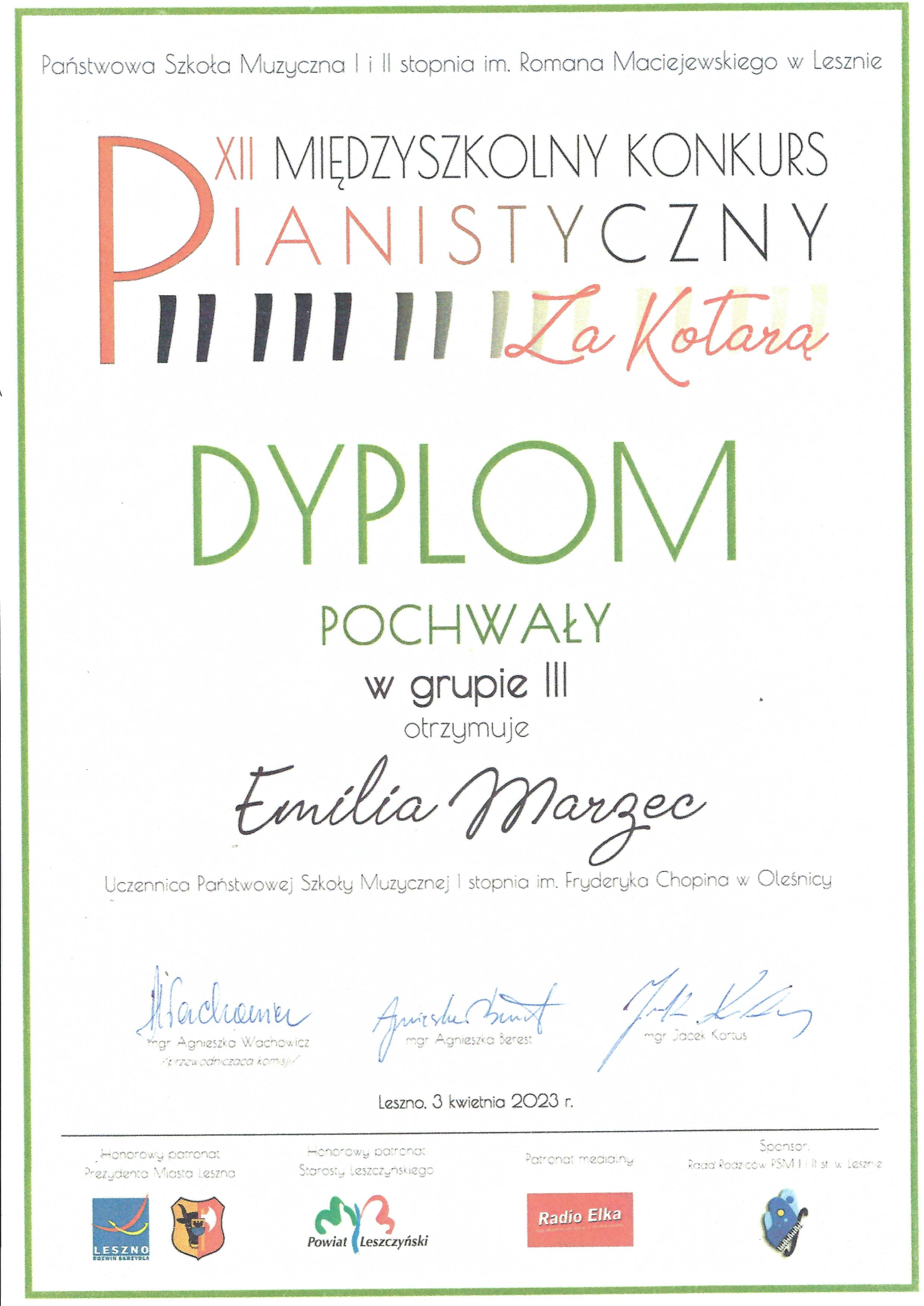 - Emilia Marzec otrzymała dyplom pochwały