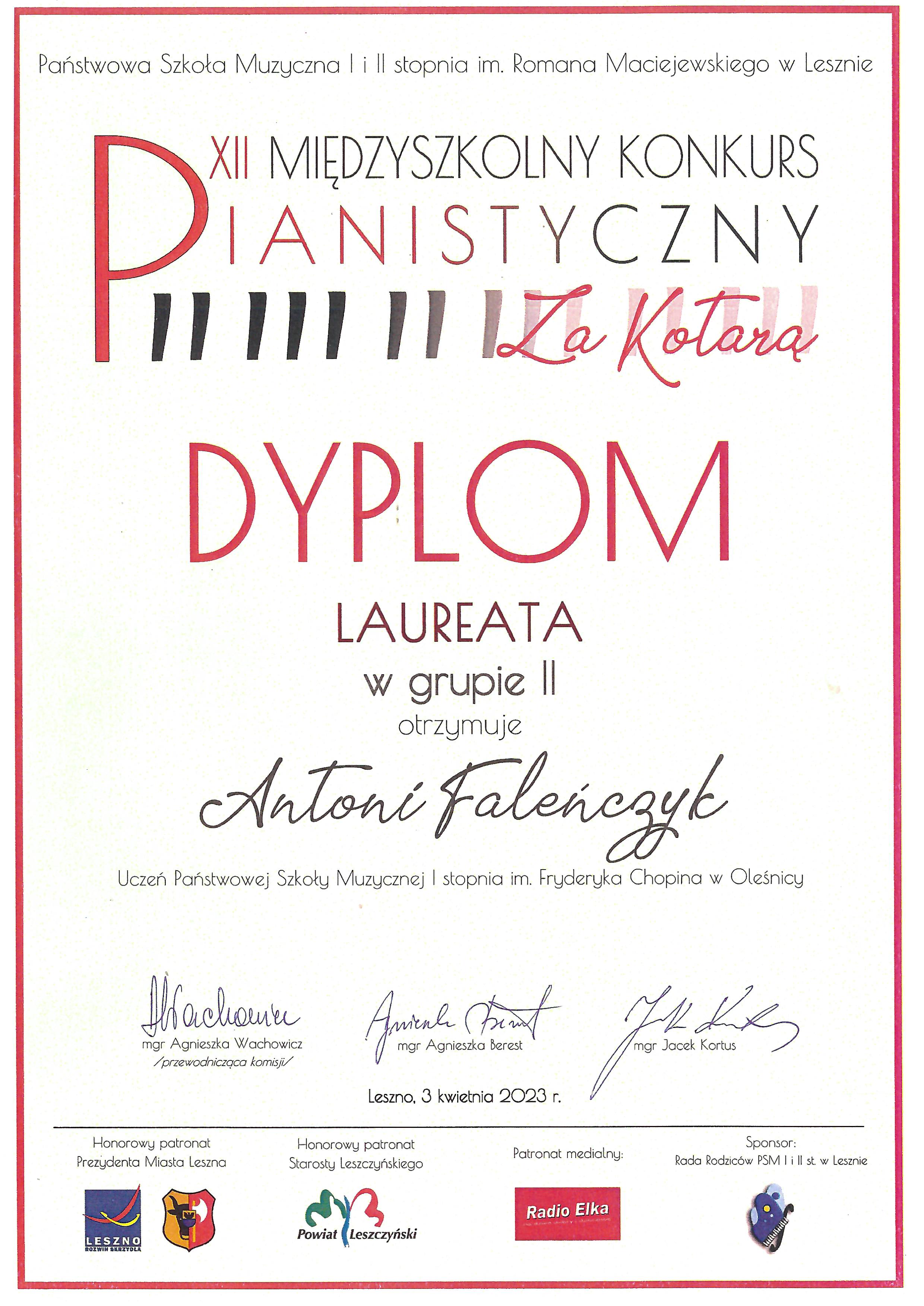 03.04.2023 r. odbył się XII Międzyszkolny Konkurs Pianistyczny „Za kotarą” w Państwowej Szkole Muzycznej I i II st. im. Romana Maciejewskiego w Lesznie.