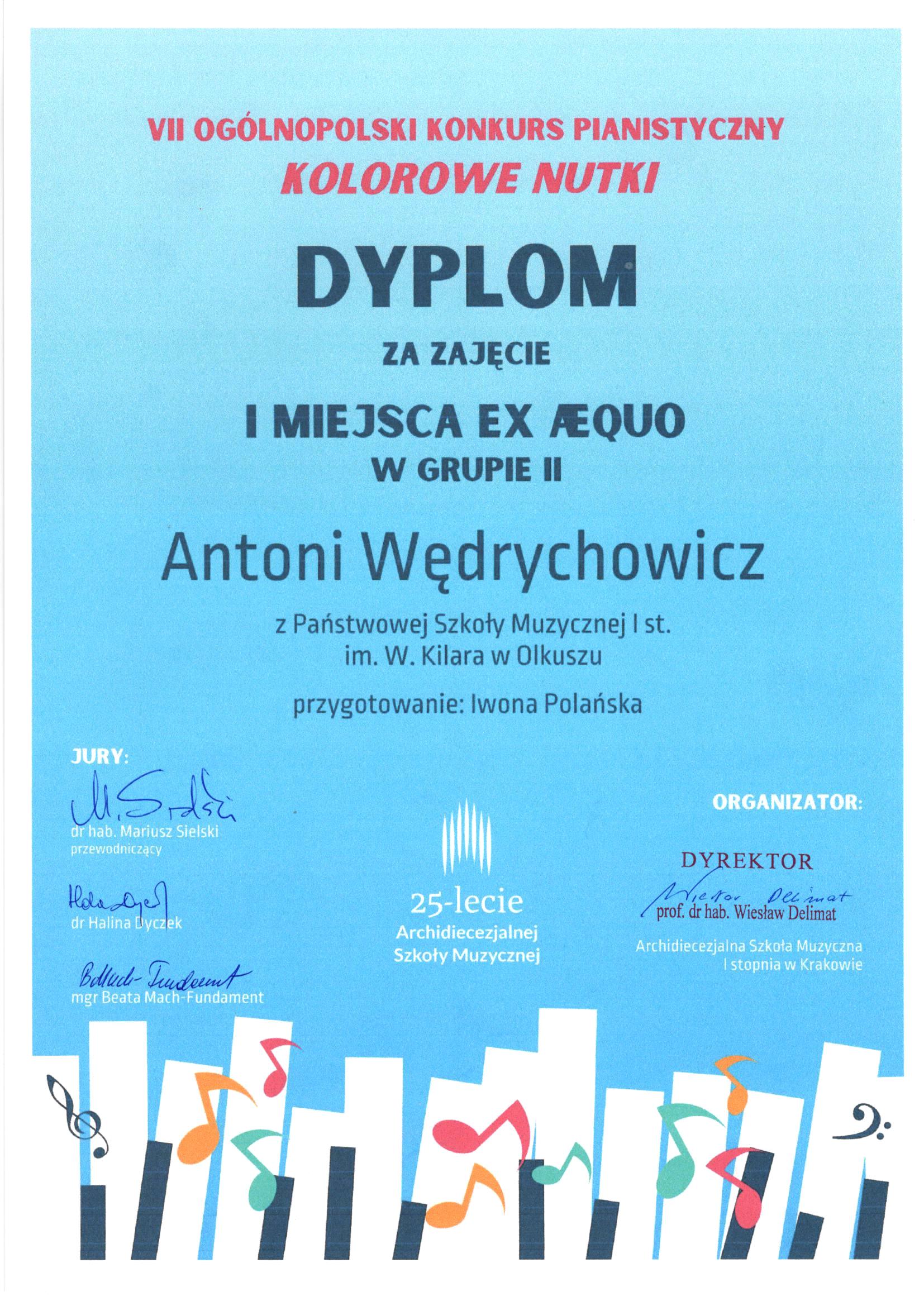 Antoni Wędrychowicz zdobywcą I miejsca w grupie II na VII Ogólnopolskim Konkursie Pianistycznym "Kolorowe Nutki"