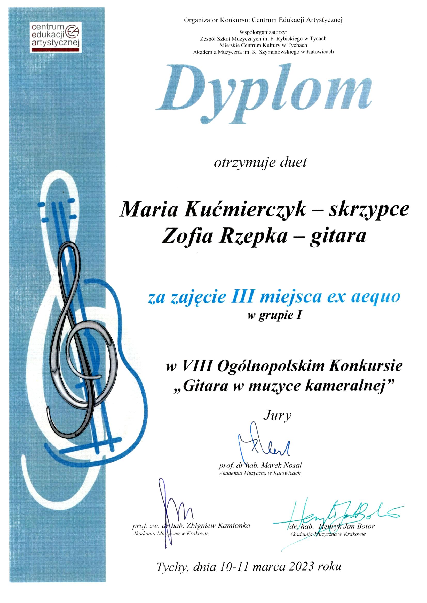 Duet Maria Kućmierczyk i Zofia Rzepka z klasy skrzypiec mgr Jana Kućmierczyka oraz klasy gitary mgr Tadeusza Spyry zajął III miejsce ex aequo w grupie I w VIII Ogólnopolskim Konkursie "Gitara w muzyce kameralnej". Gratulujemy!!!