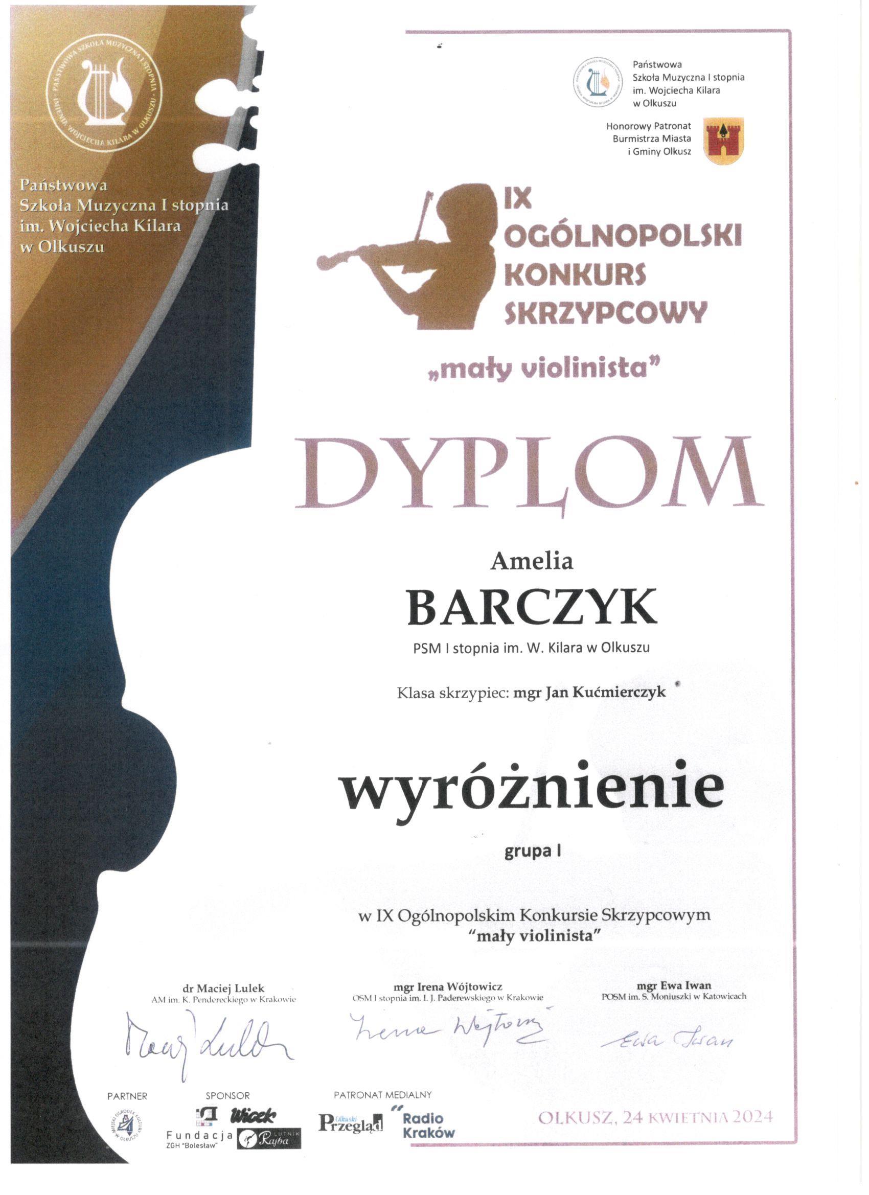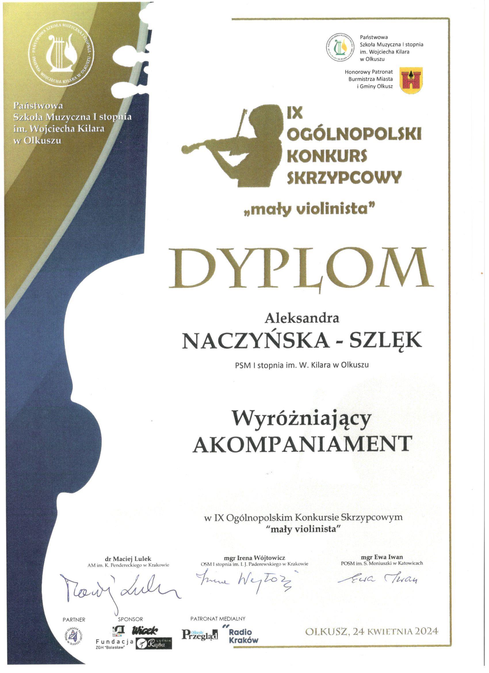 IX Ogólnopolski Konkurs Skrzypcowy w Olkuszu: Józef Kućmierczyk - I miejsce w grupie III z klasy skrzypiec mgr Jana Kucmierczyka, Amelia Barczyk - wyróżnienie w grupie I z klasy skrzypiec mgr Jana Kućmierczyka, dyplom dla wyróżniającego się akompaniatora dla mgr Aleksandry Naczyńskiej - Szlęk.
