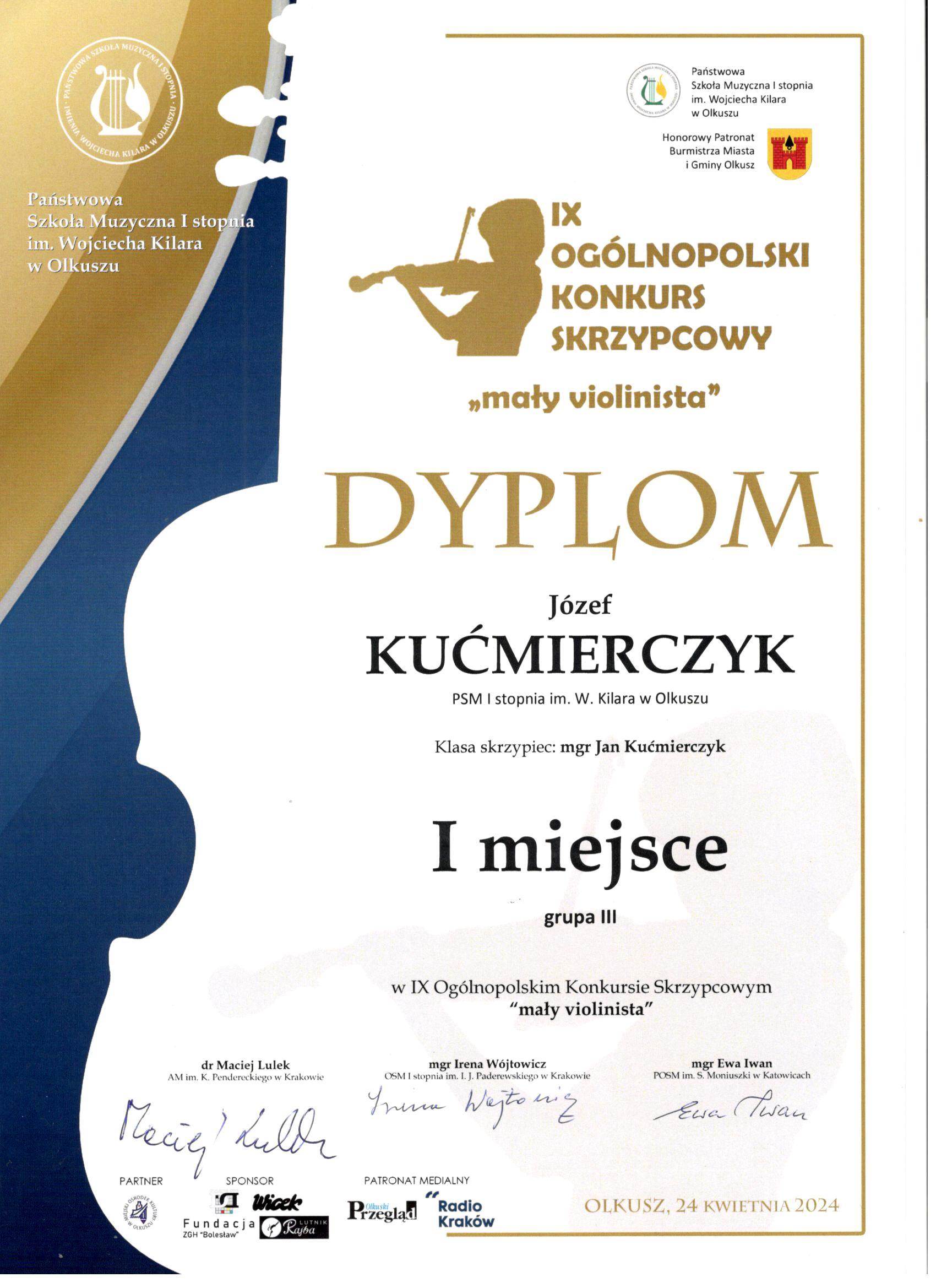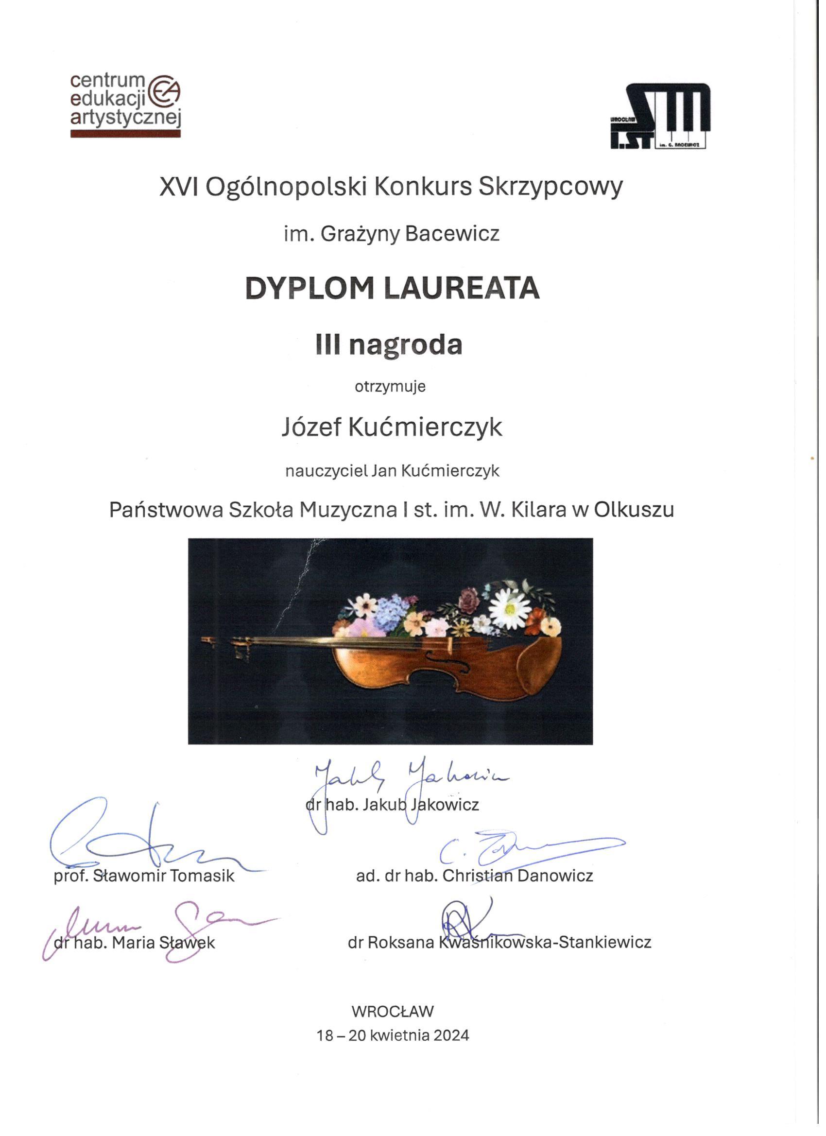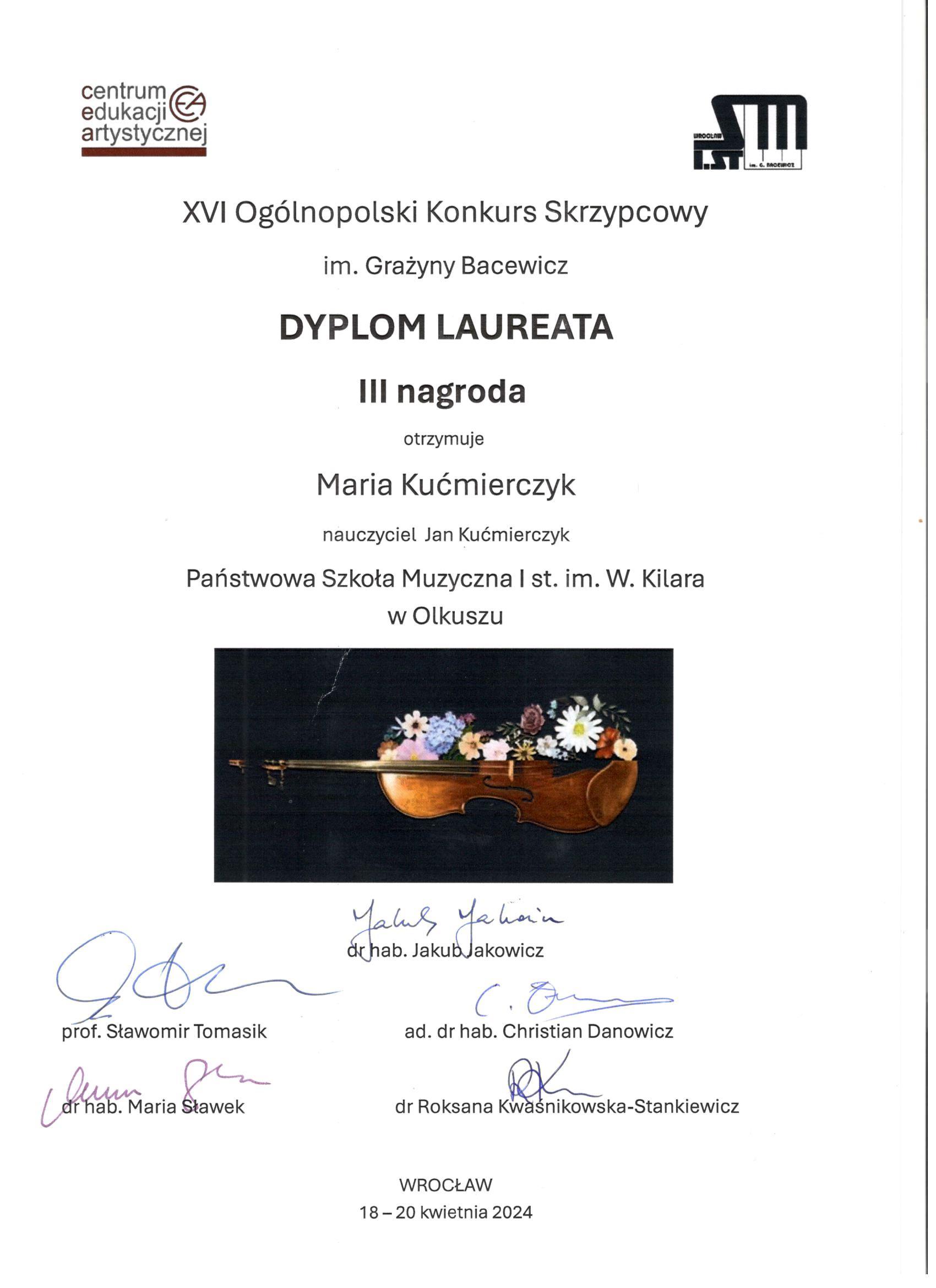 XVI Ogólnopolski Konkurs Skrzypcowy im.G.Bacewicz we Wrocławiu - III nagroda dla Marii i Józefa Kućmierczyk z klasy skrzypiec mgr Jana Kućmierczyka, dyplom za wyróżniające przgotowanie uczniów dla mgr Jana Kucmierczyka.